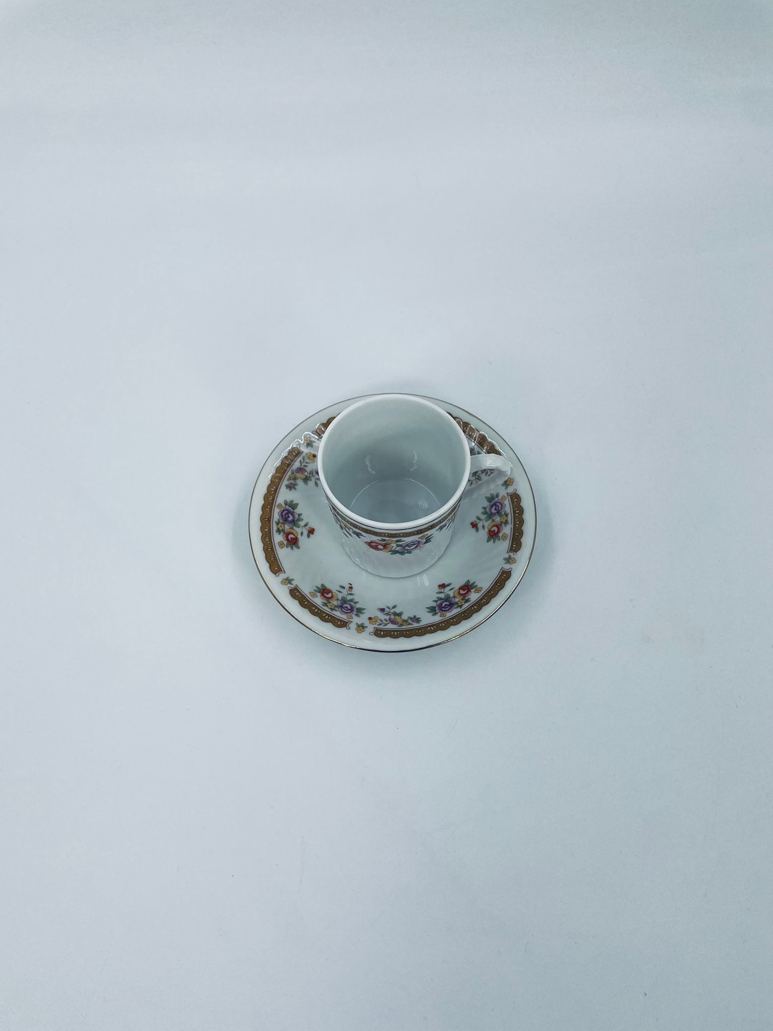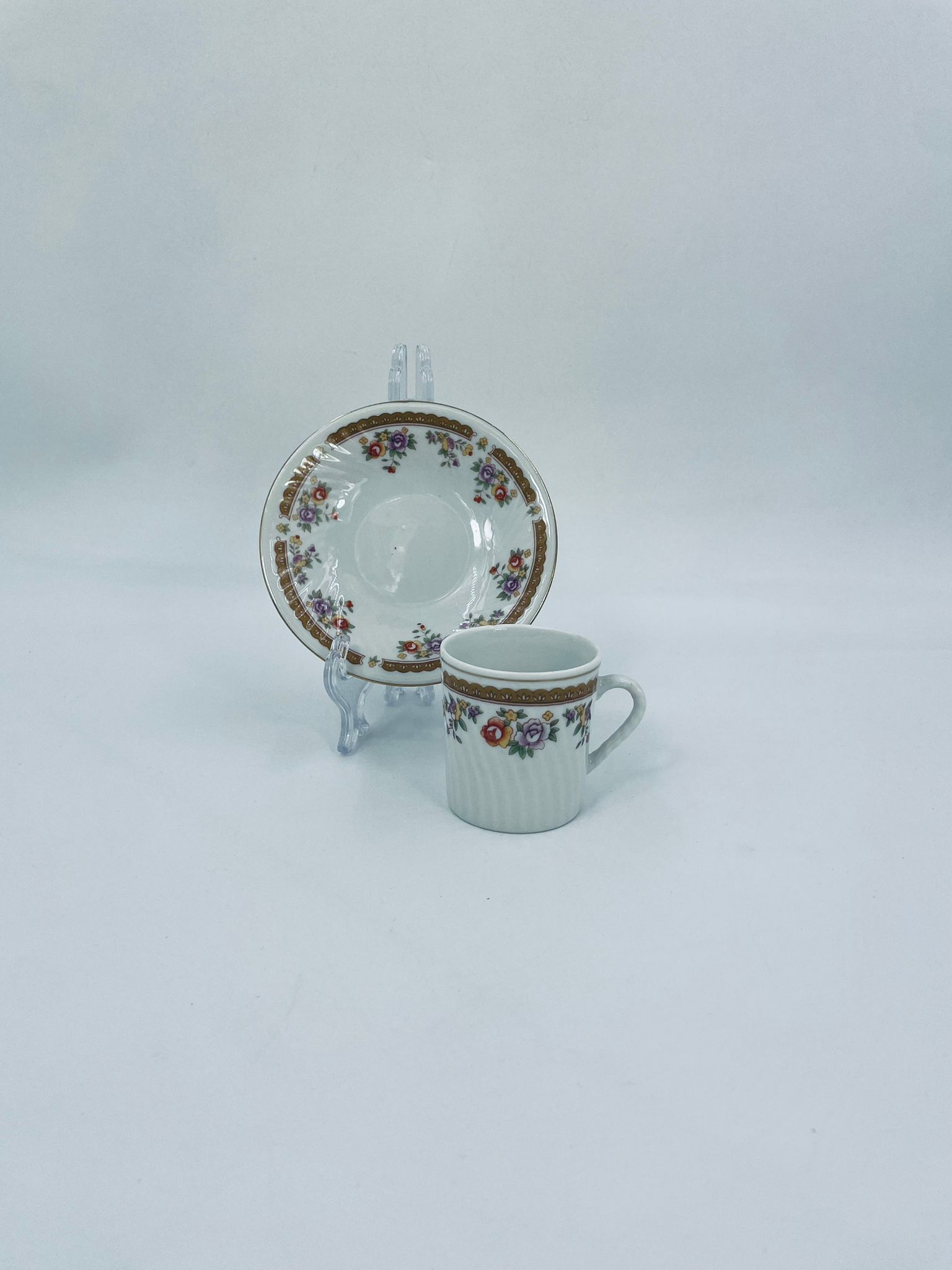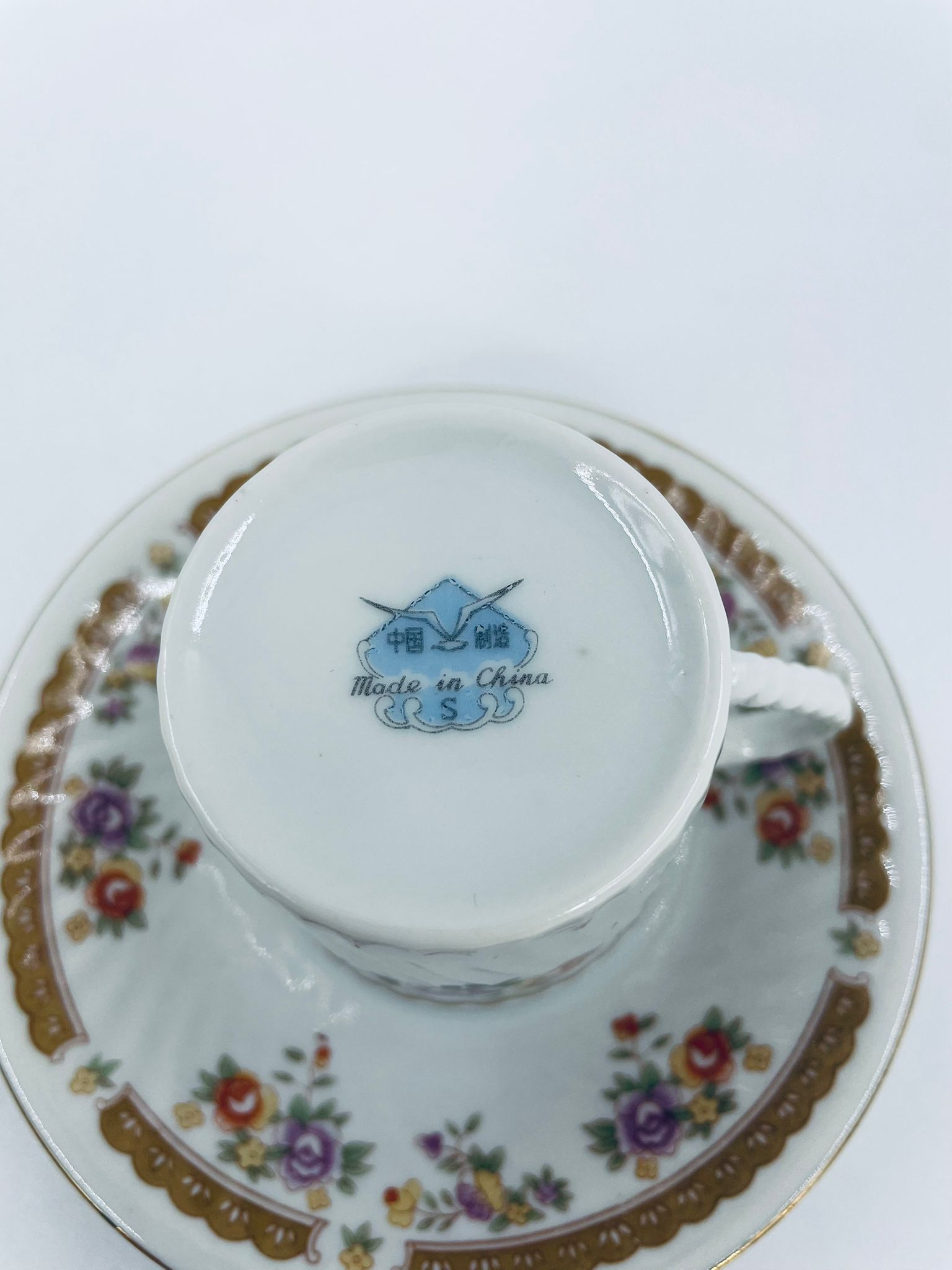 Vintage style collector's cup in duo set, Made in China, made of high quality white porcelain. The set features multi-coloured floral motifs and patterns, finished with gilding on the rim.