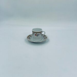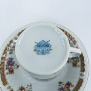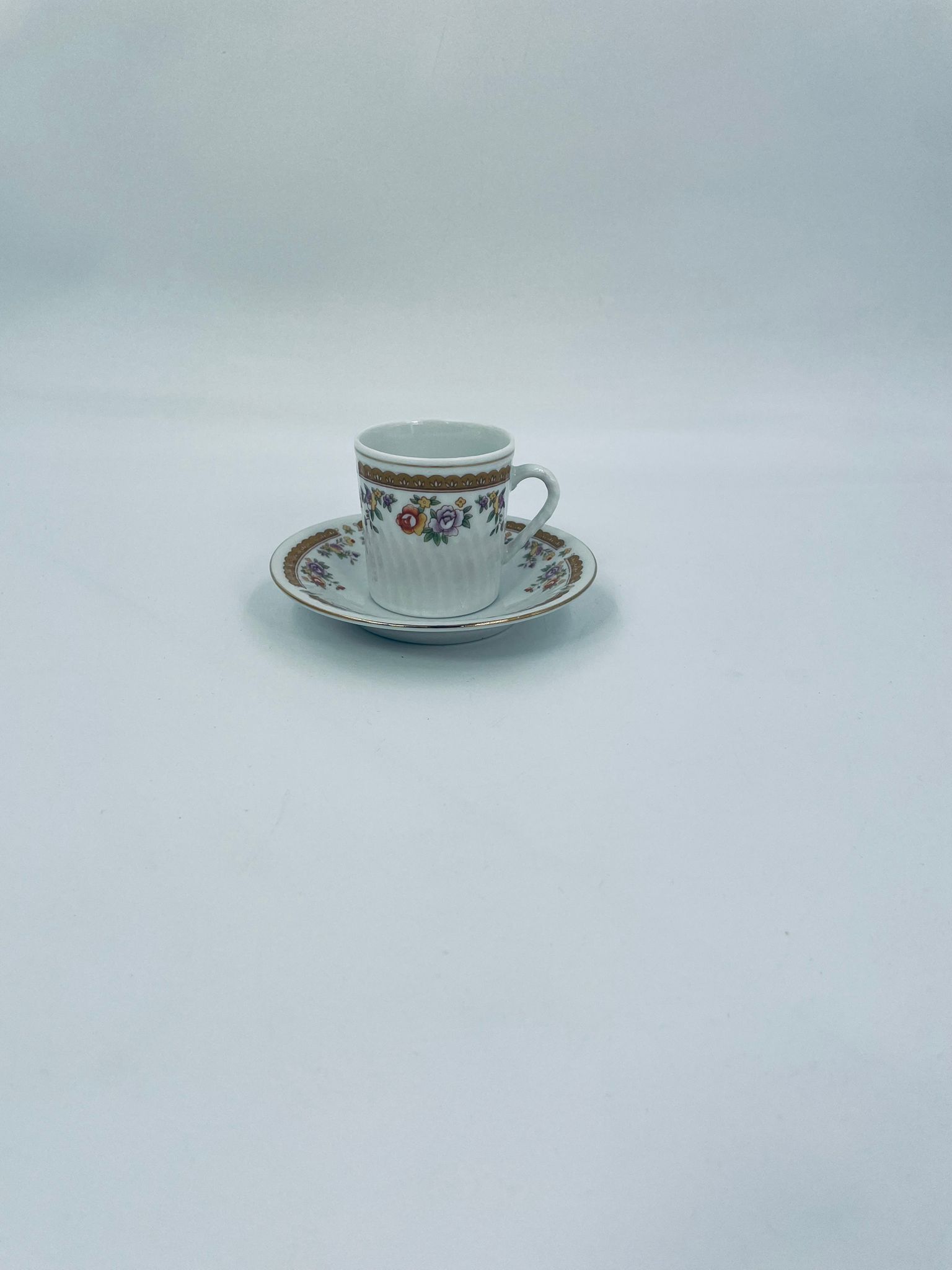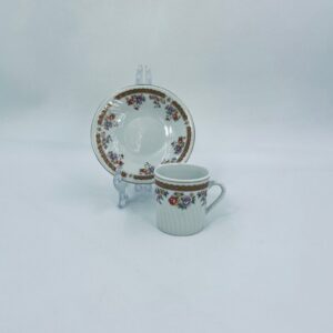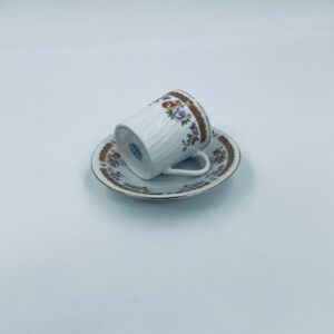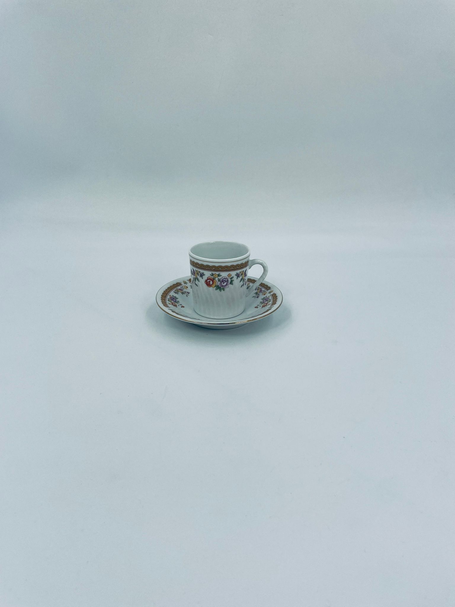 Vintage style collector's cup in duo set, Made in China, made of high quality white porcelain. The set features multi-coloured floral motifs and patterns, finished with gilding on the rim.