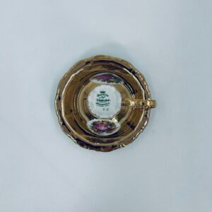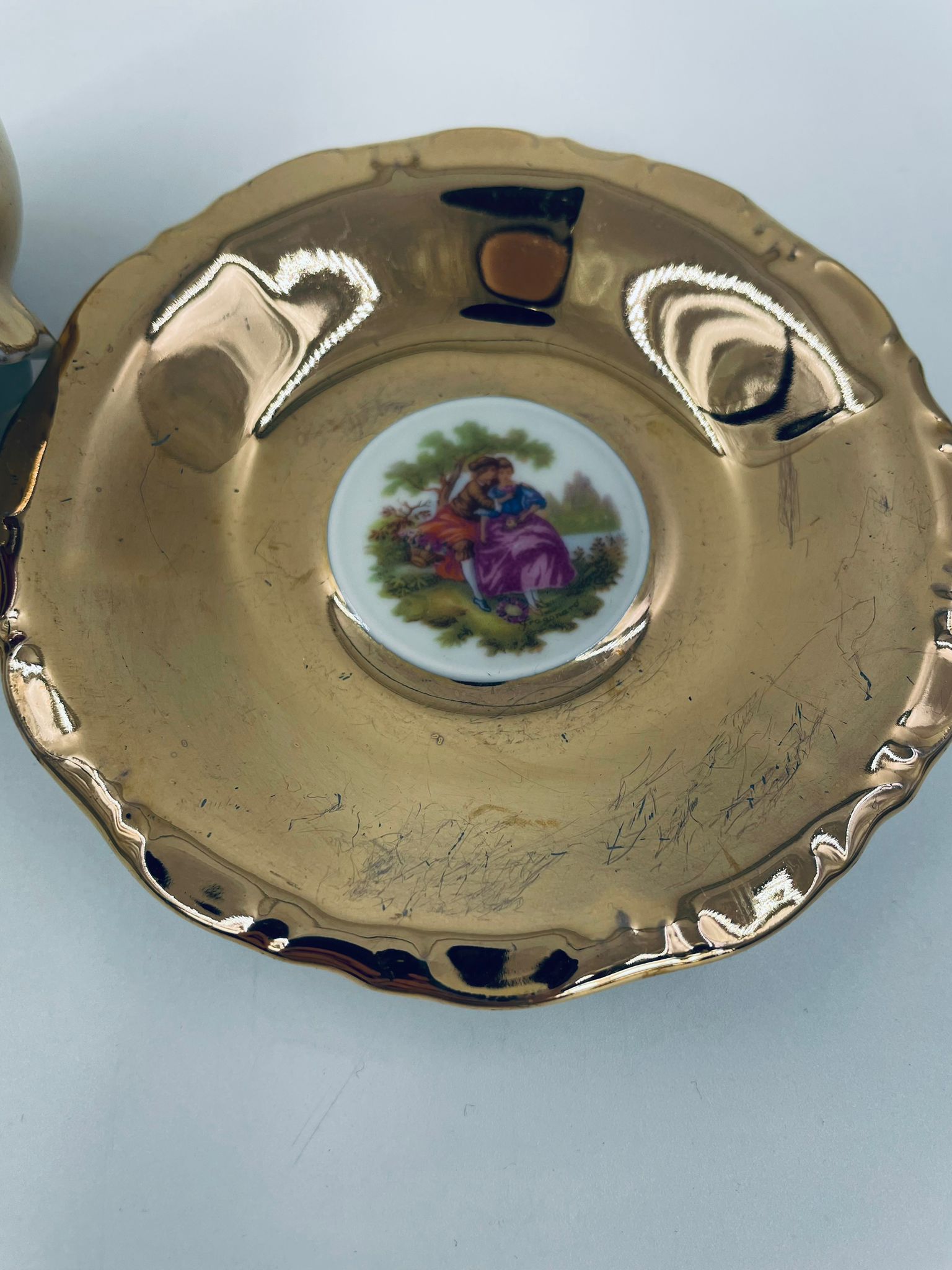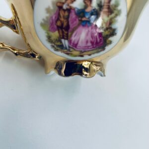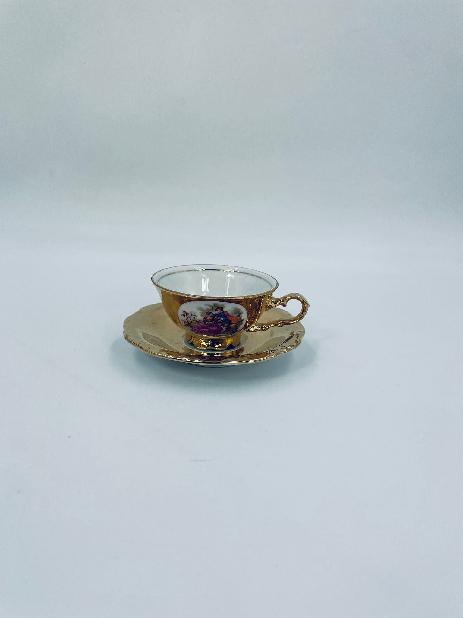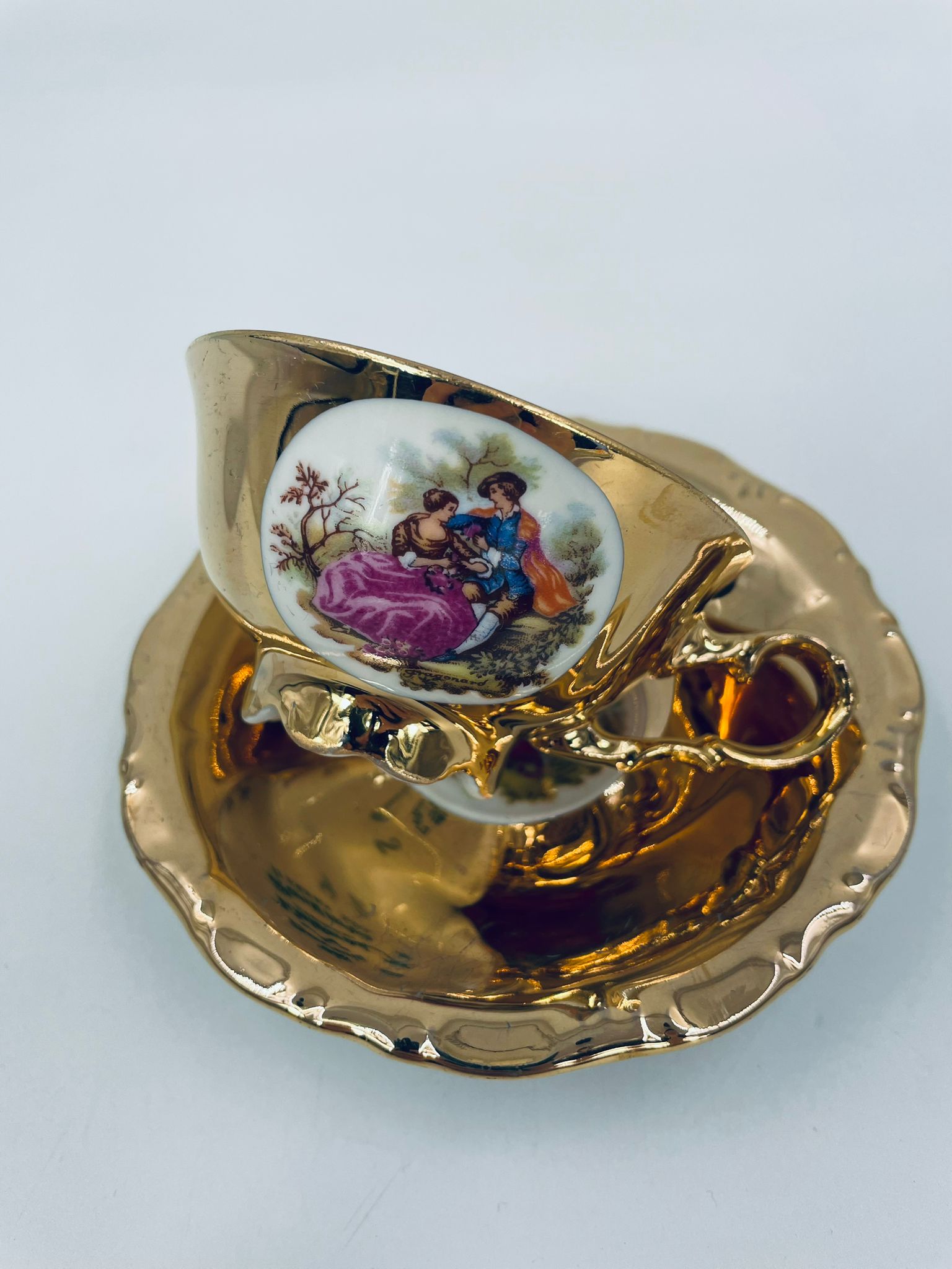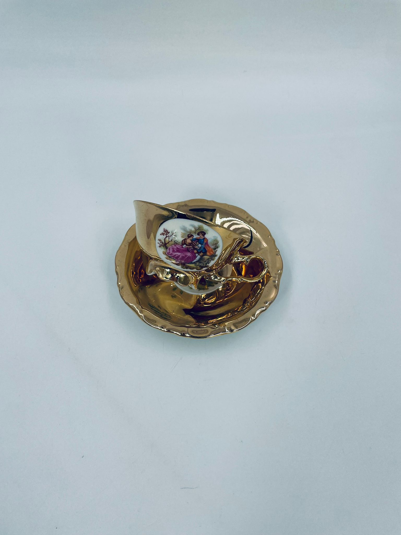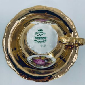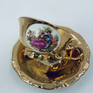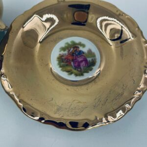 A collector's cup in duo set by the Waldershof Bavaria label, made of high-quality white porcelain. The set is hand-decorated in 22K gold with a pattern of a romantic scene. The set has rubbing on the gold and a small crack on the cup.