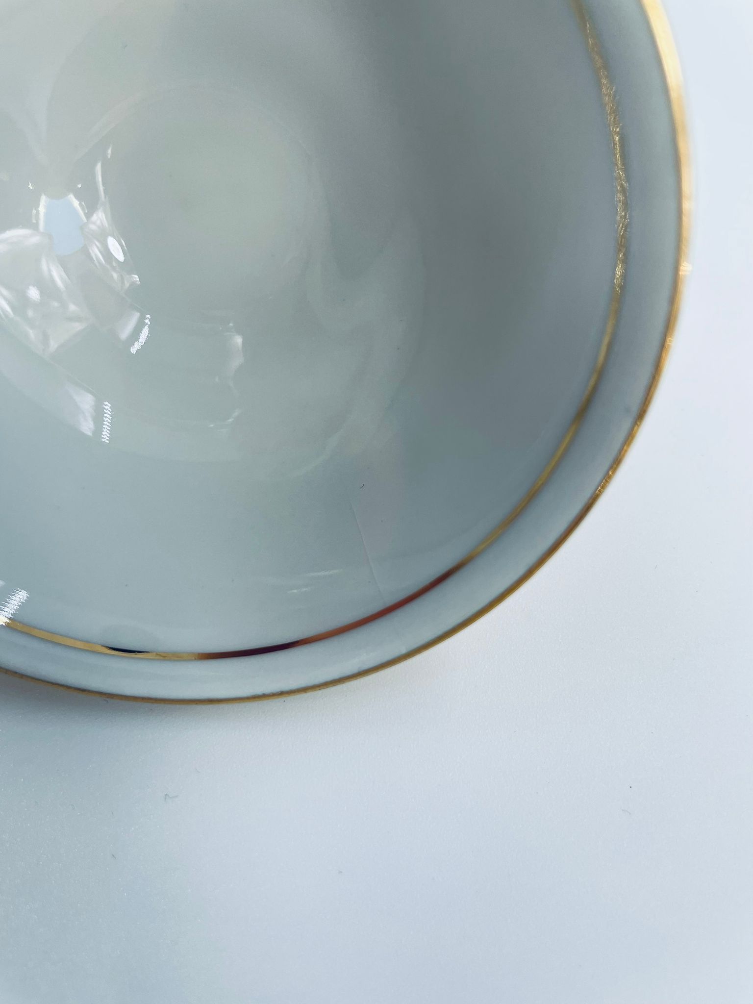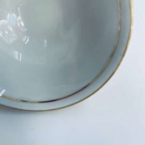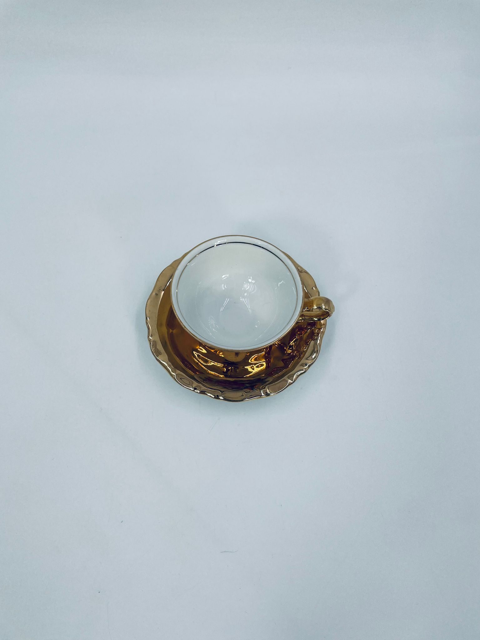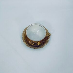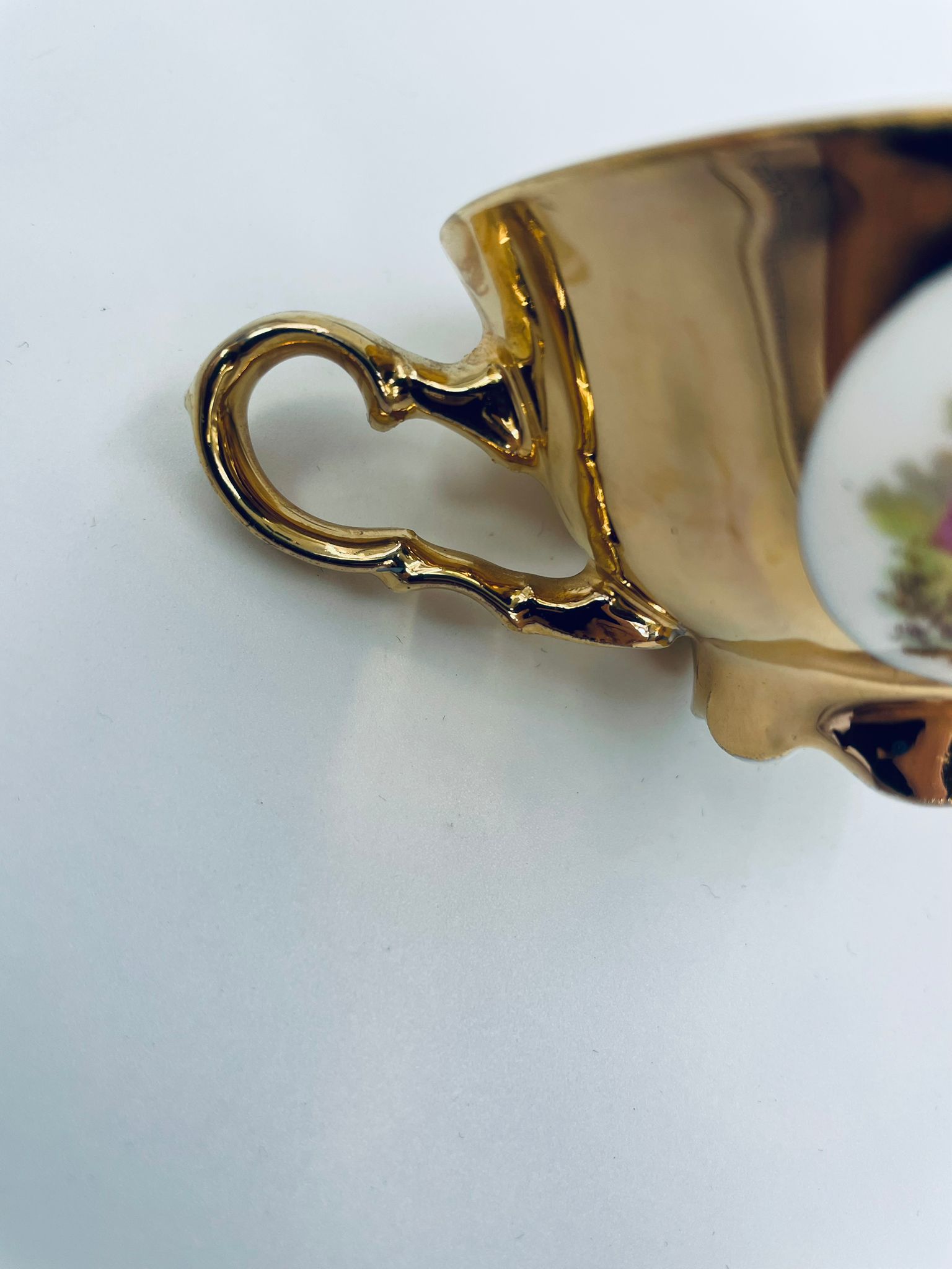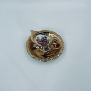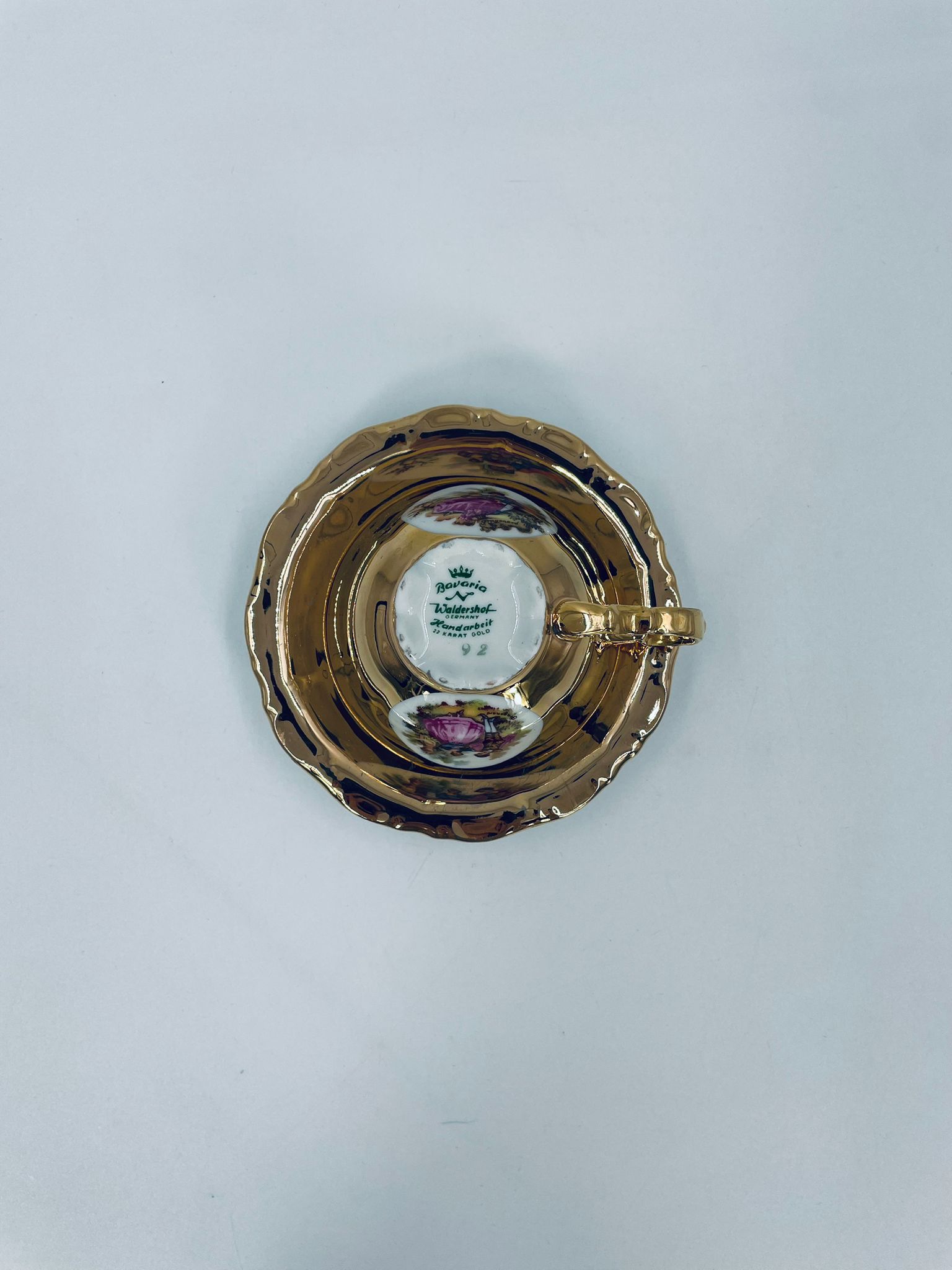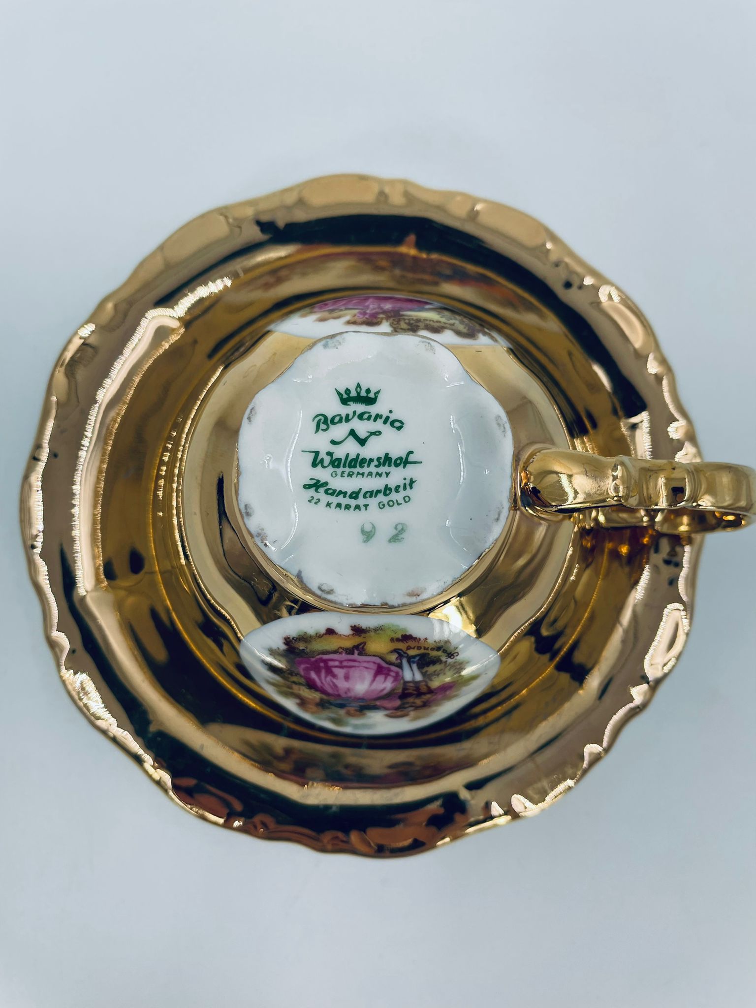 A collector's cup in duo set by the Waldershof Bavaria label, made of high-quality white porcelain. The set is hand-decorated in 22K gold with a pattern of a romantic scene. The set has rubbing on the gold and a small crack on the cup.