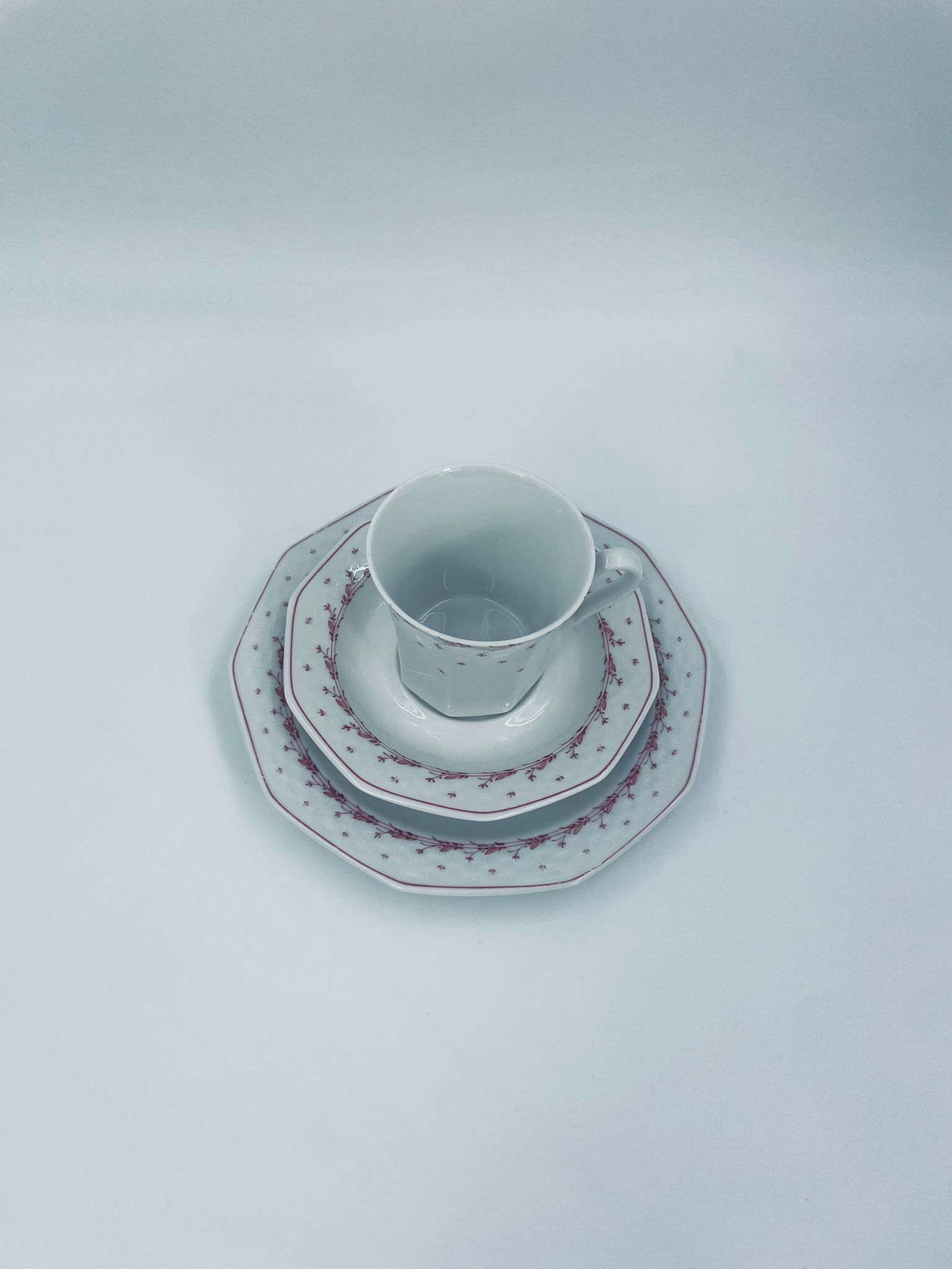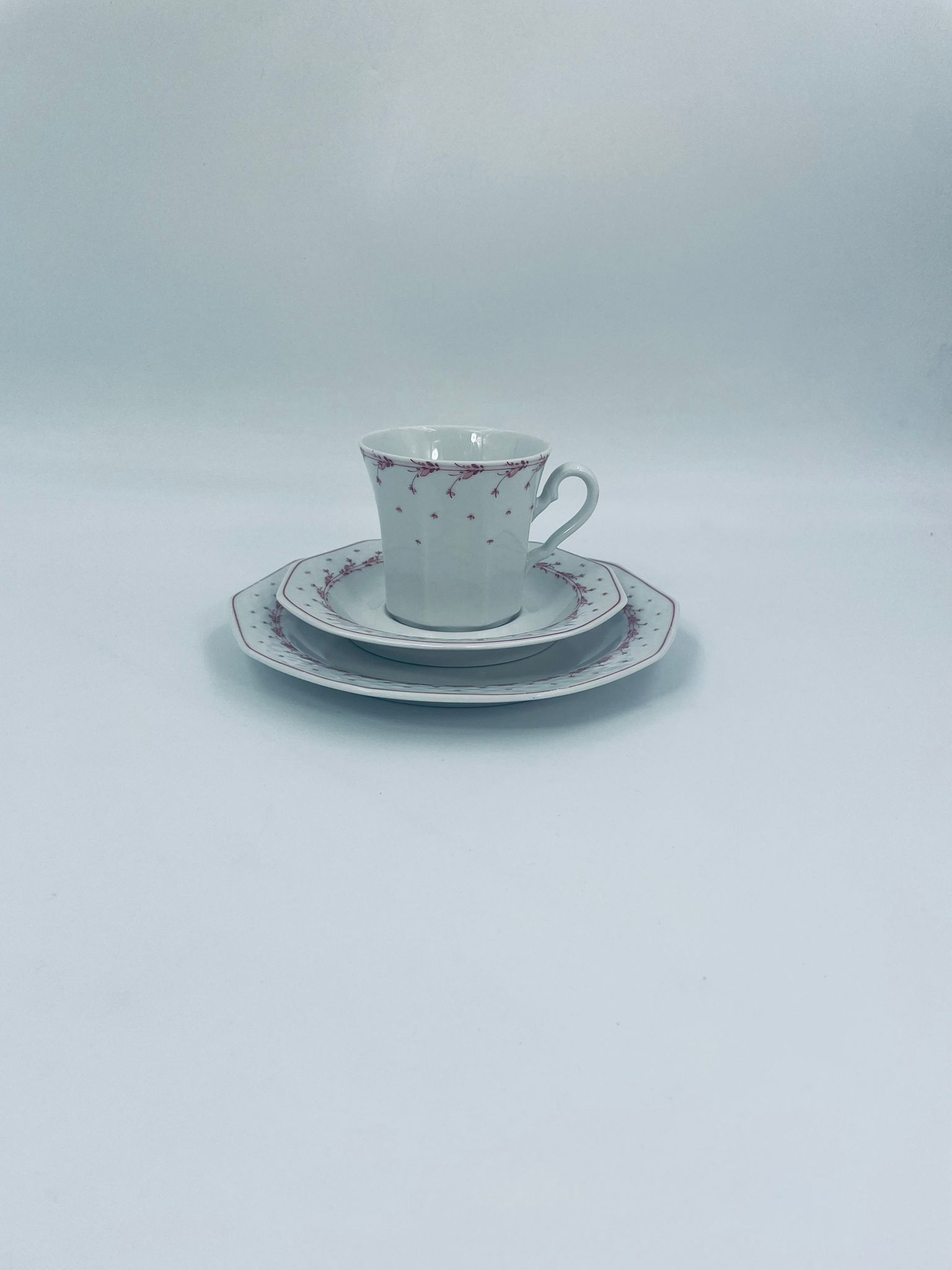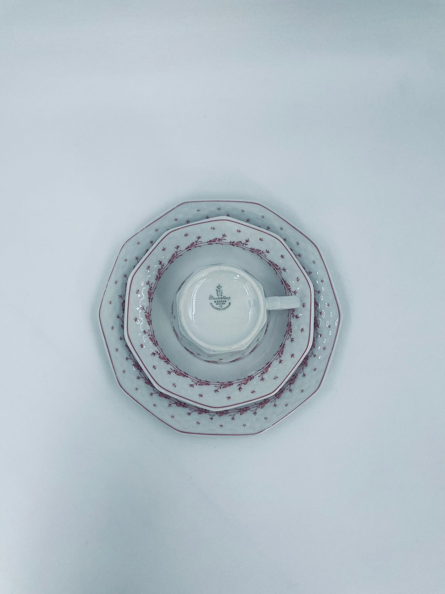 A collector's cup in a trio set by the Winterling Röslau Bavaria label, made of high-quality white porcelain. It is characterised by a delicate pink twig pattern. Irregularly shaped plates with a pink garland of twigs, finished in pink on the rim. It has a small abrasion on the rim.