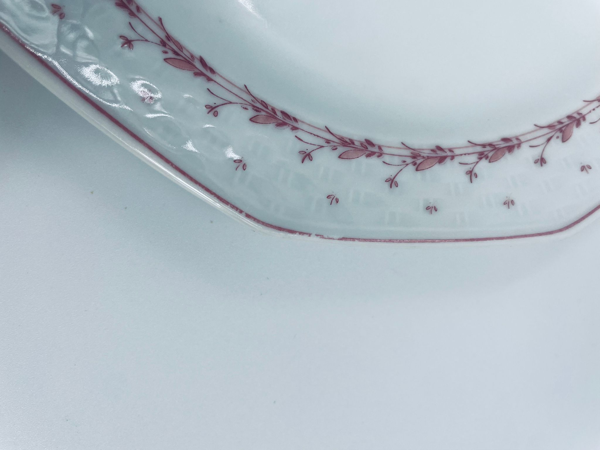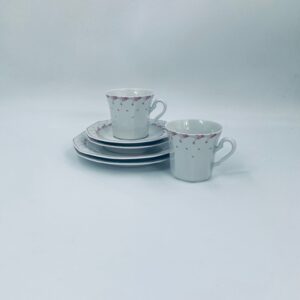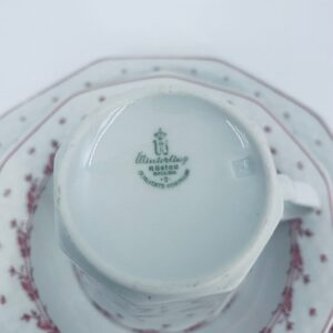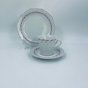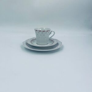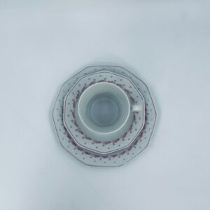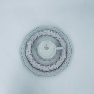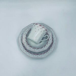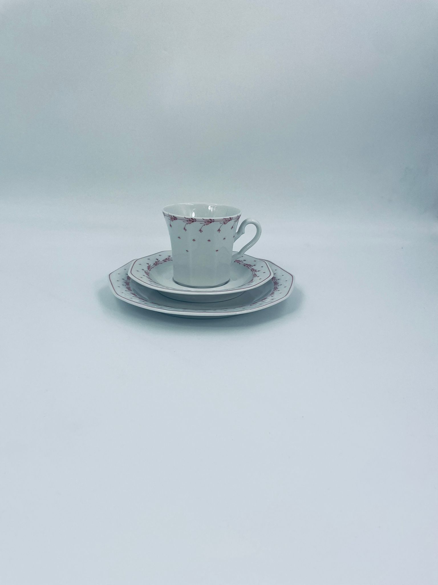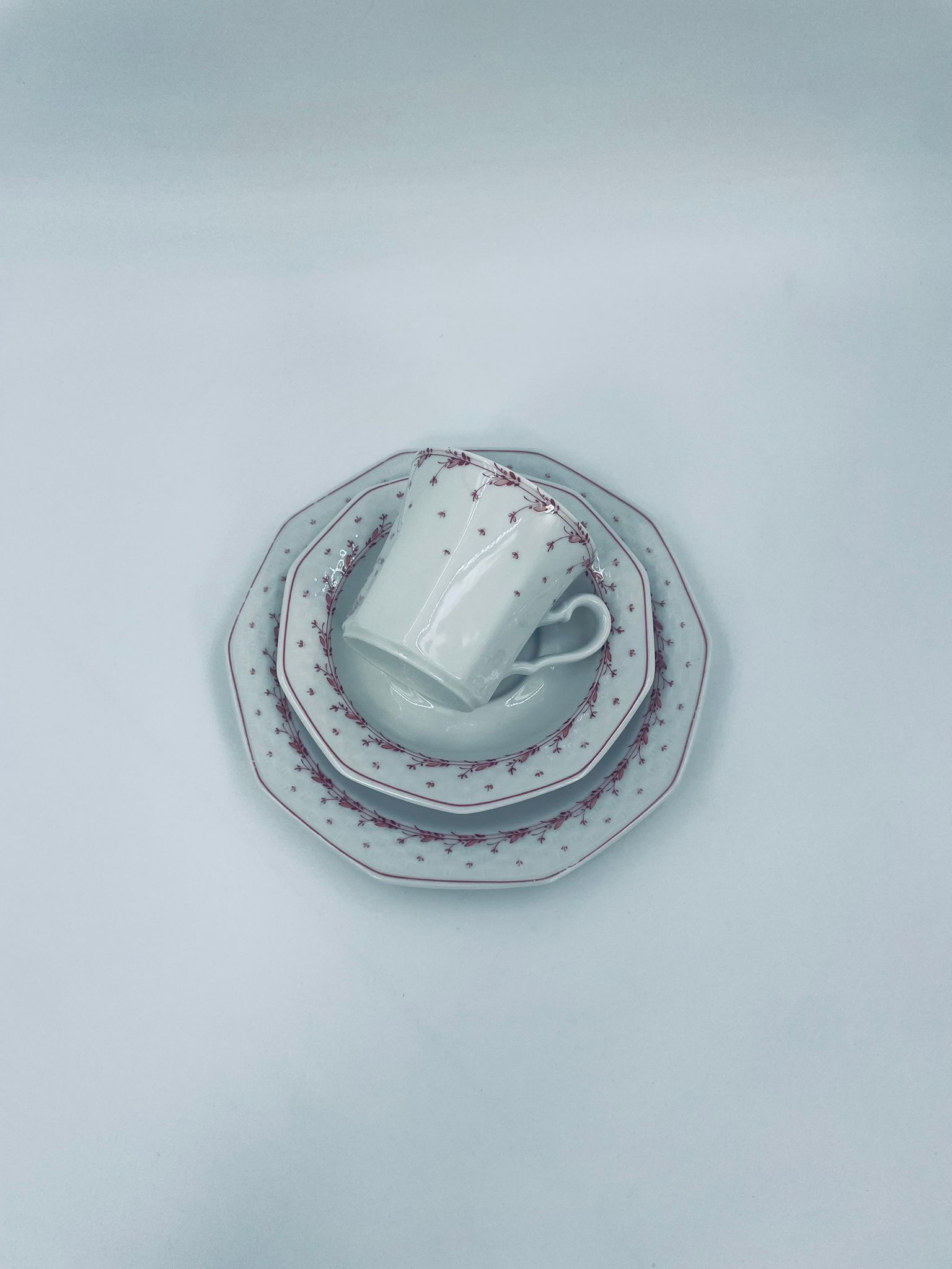 A collector's cup in a trio set by the Winterling Röslau Bavaria label, made of high-quality white porcelain. It is characterised by a delicate pink twig pattern. Irregularly shaped plates with a pink garland of twigs, finished in pink on the rim. It has a small abrasion on the rim.