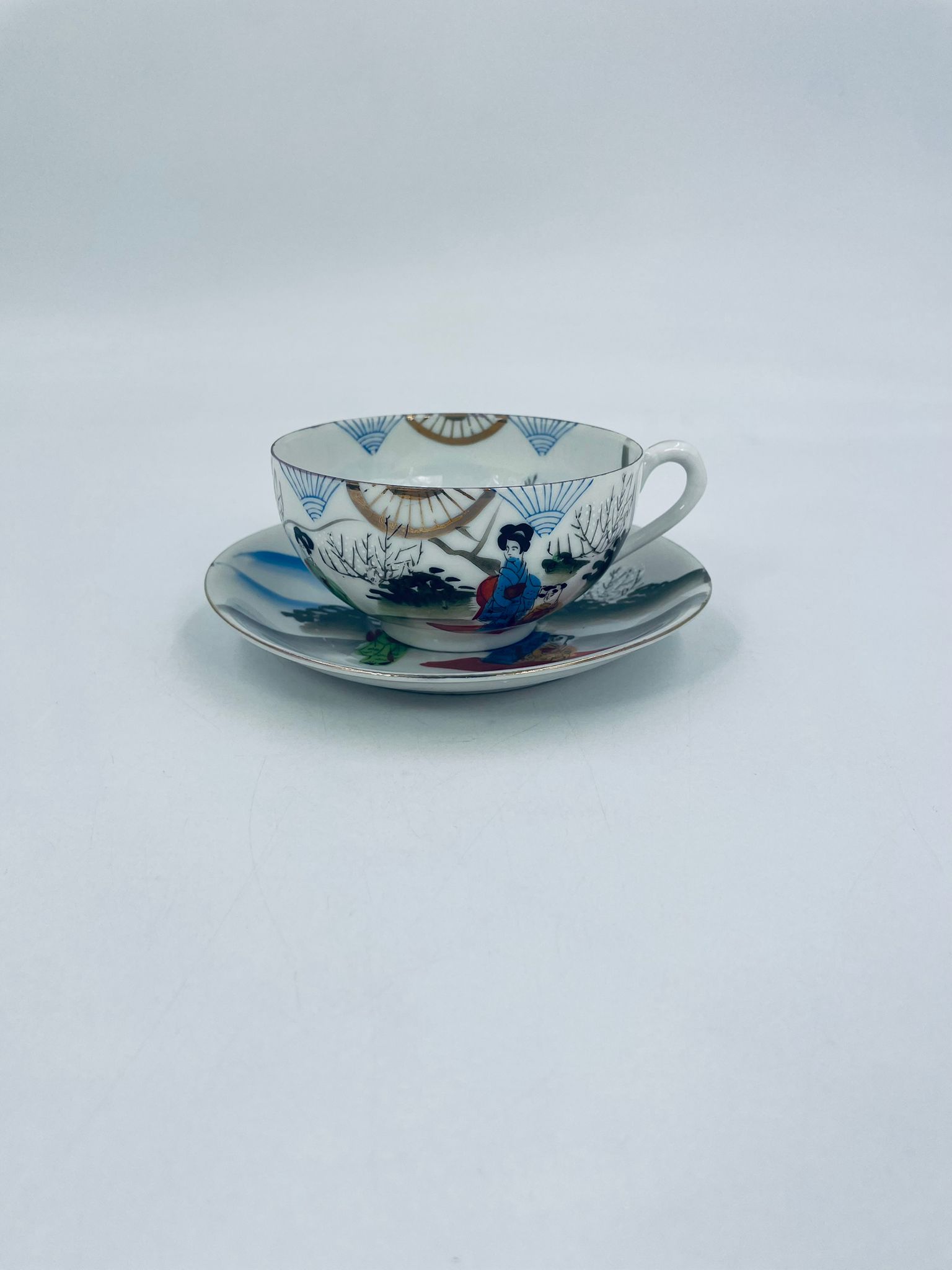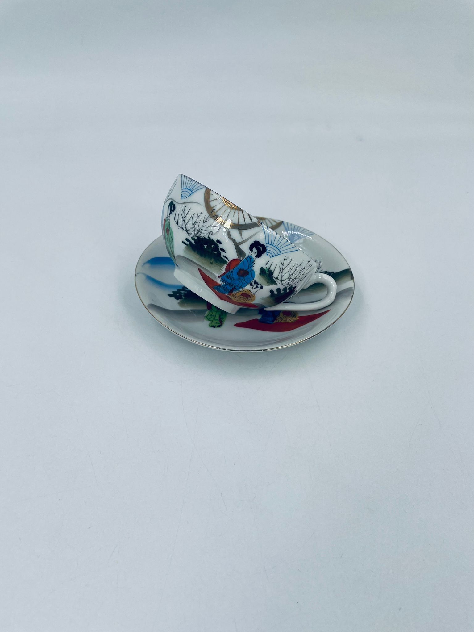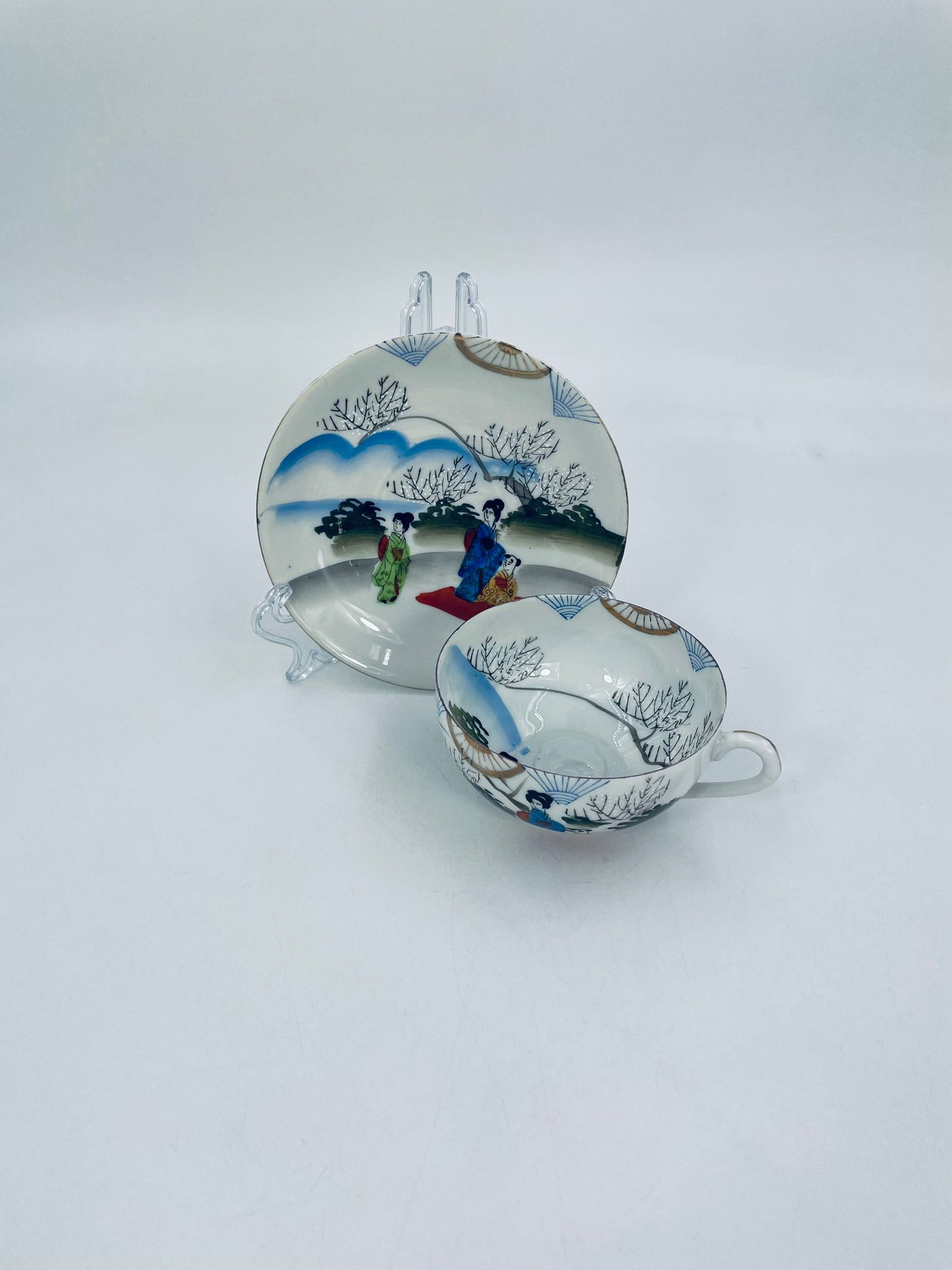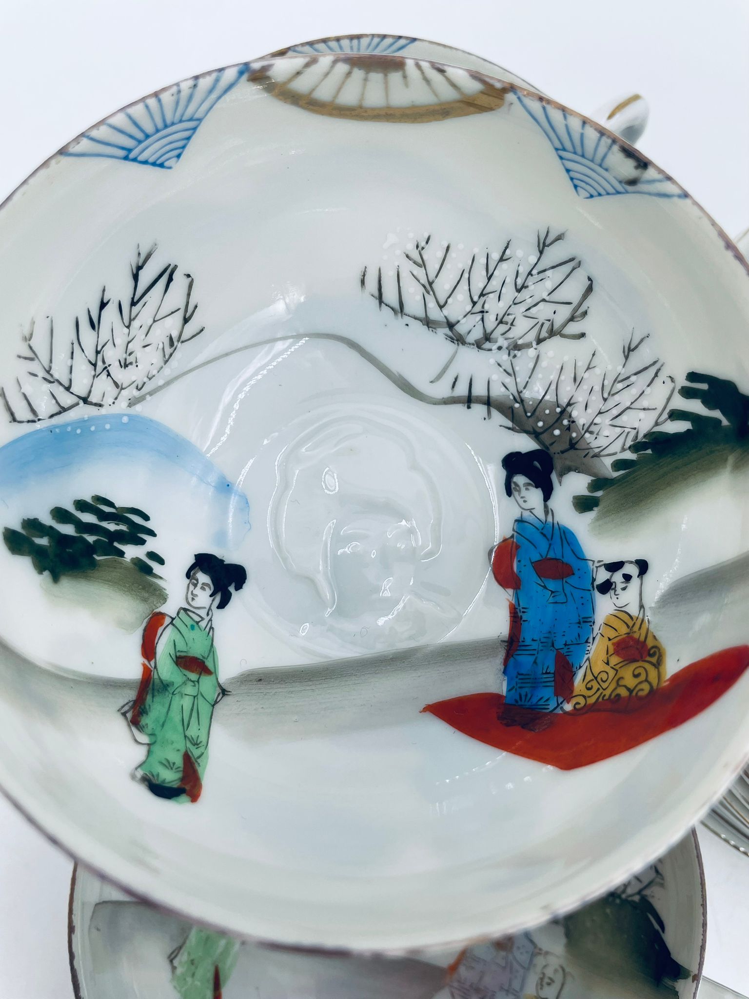 Collector's cup in duo set, Japanese, manufactured in white fine porcelain. Leave hand-painted in a Geisha style design. In the centre of the cup is a lithophane portrait of a Geisha.