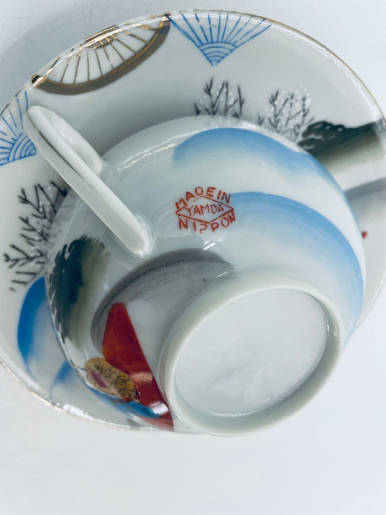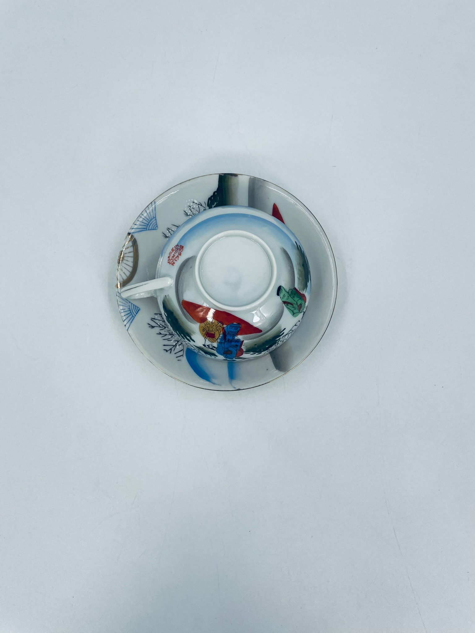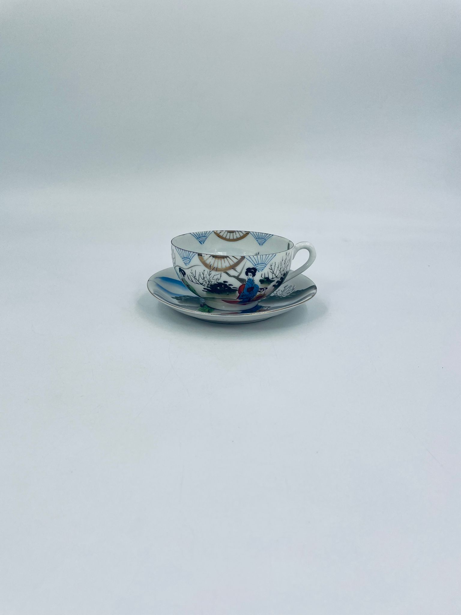 Collector's cup in duo set, Japanese, manufactured in white fine porcelain. Leave hand-painted in a Geisha style design. In the centre of the cup is a lithophane portrait of a Geisha.