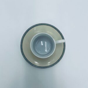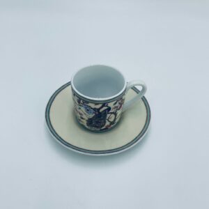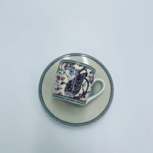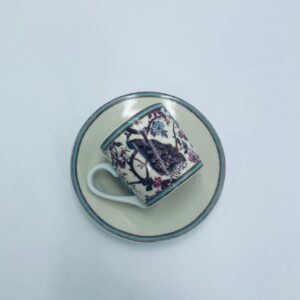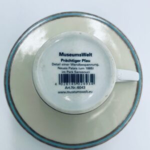 Collector's cup in duo set, by MuseumsWelt, made of high-quality white porcelain. The set is called Prächtiger Pfau (Magnificent Peacock ) with a motif that was made in the Neues Palais in Sanssouci Park, dated 1865. The cup is decorated with rich floral ornaments and a peacock pattern. The set is finished in turquoise with bronze on the rim.