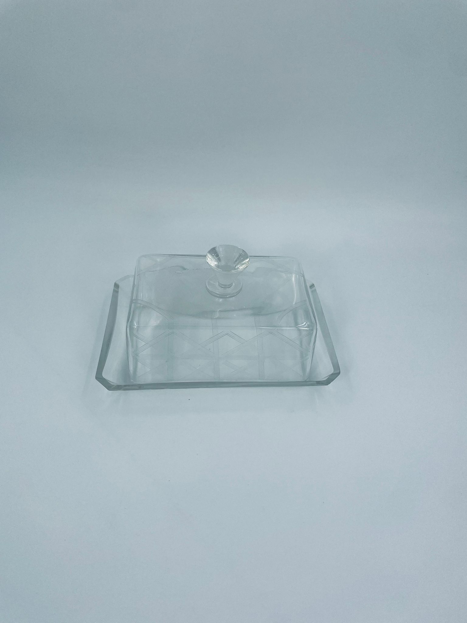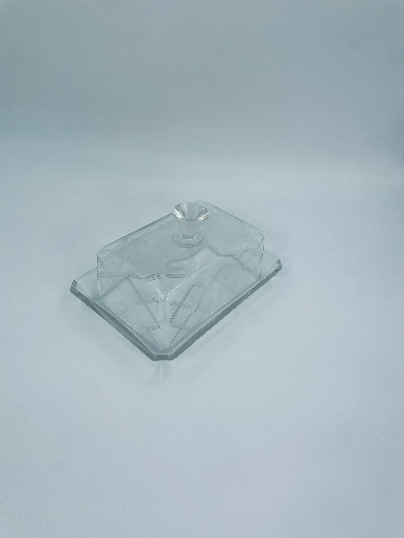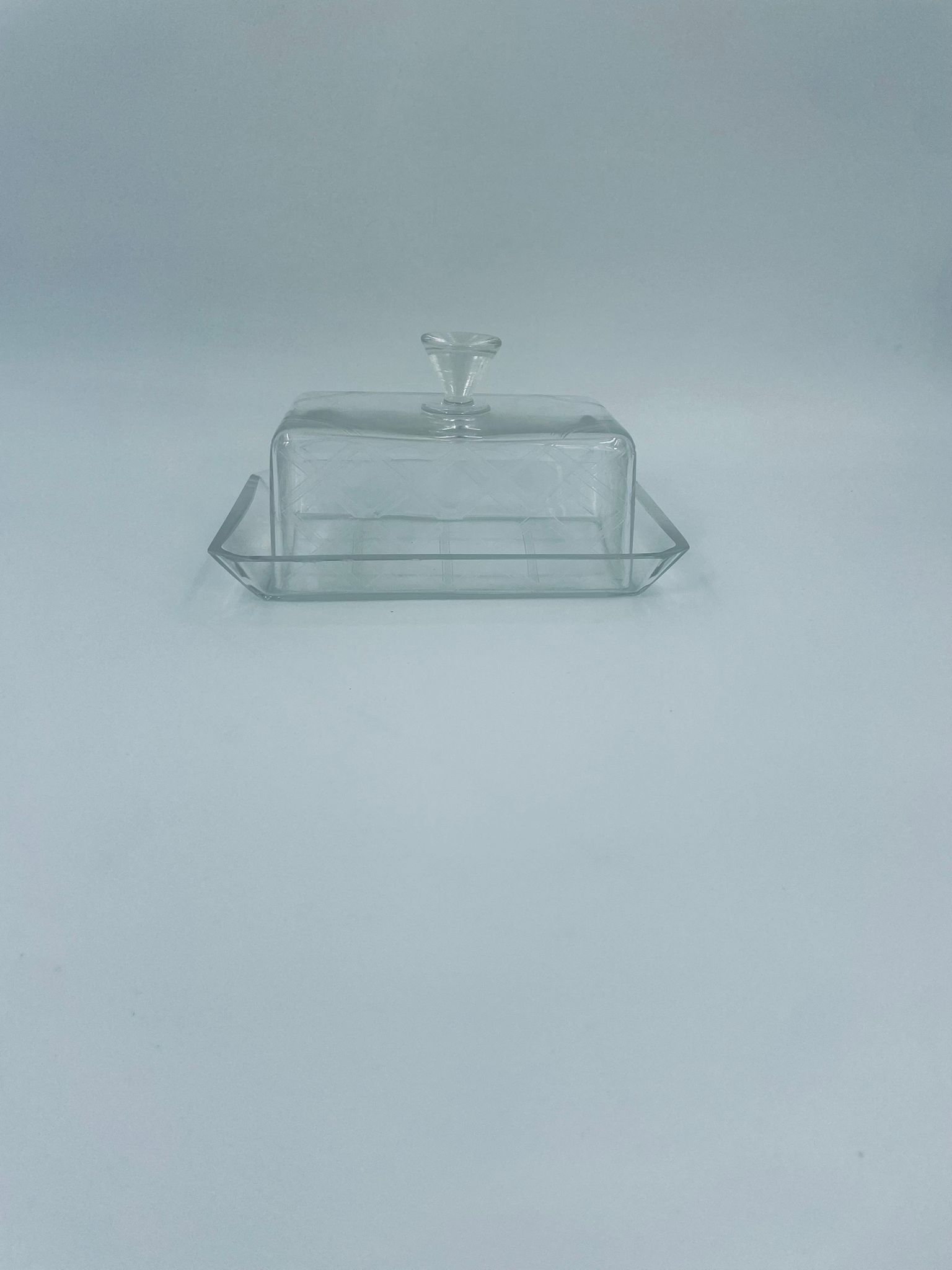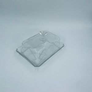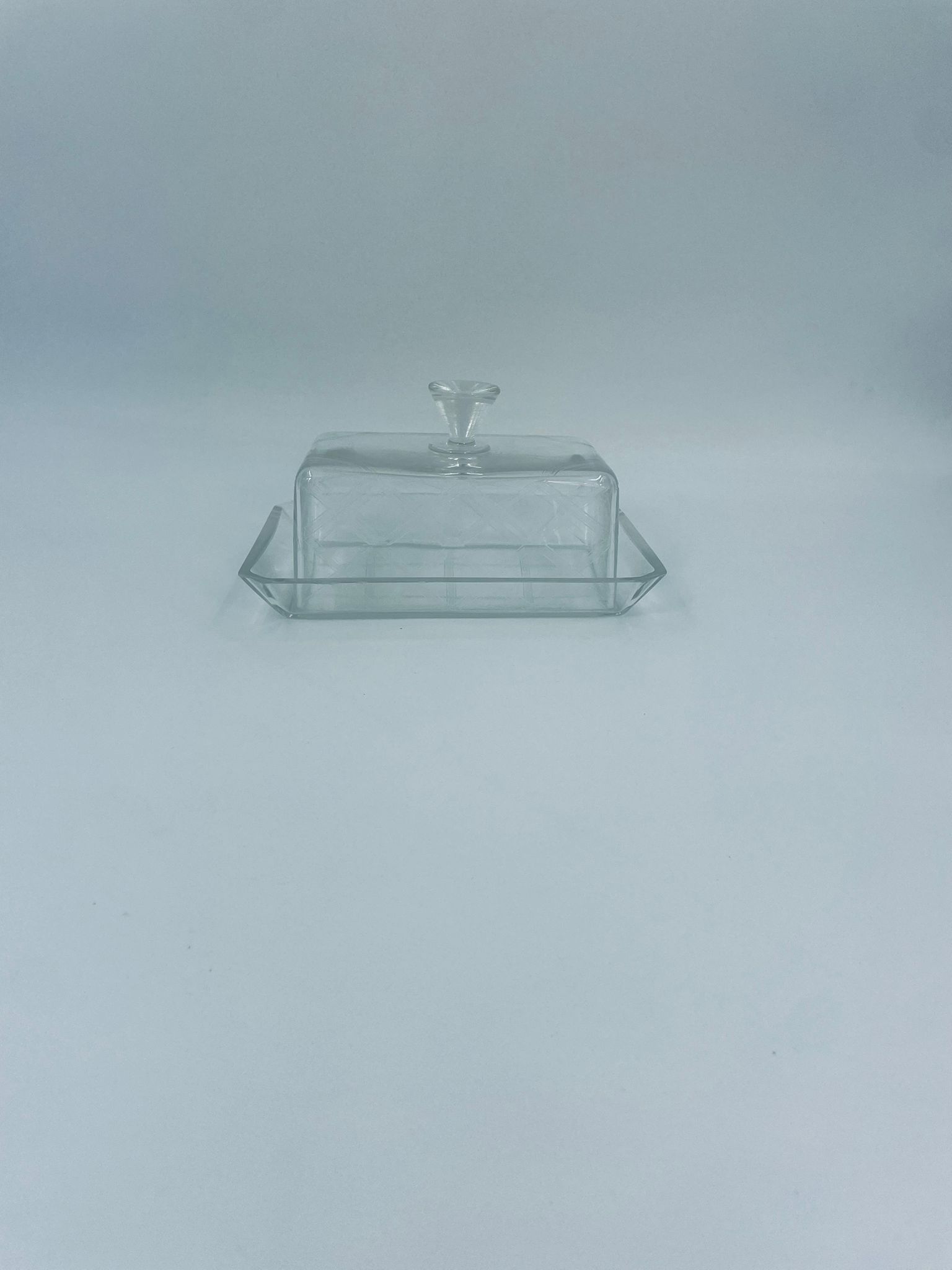 Vintage style butter bowl with lid, made of solid clear glass. The buttery is oblong in shape, with a lid and handle. It has cut-out patterns on the lid and on the base. Chipping on the rim of the base.