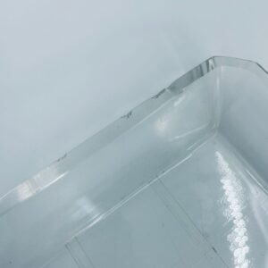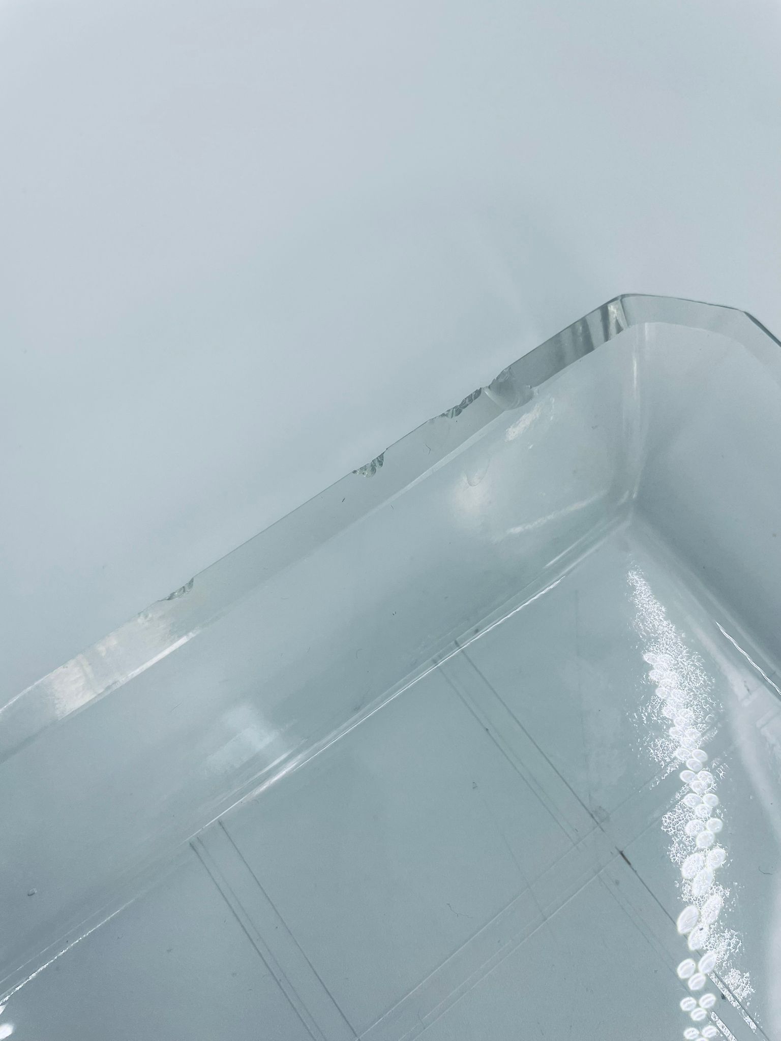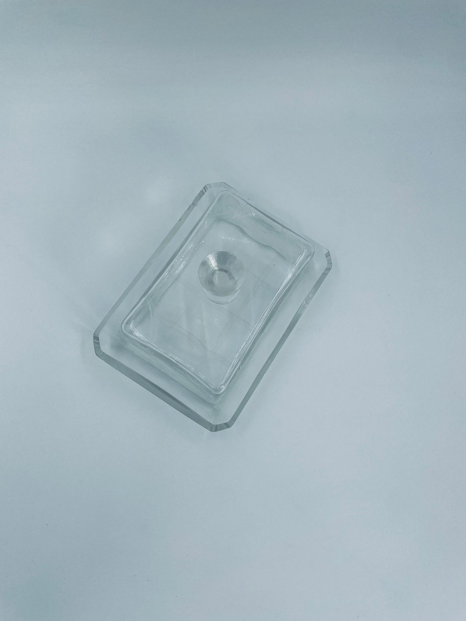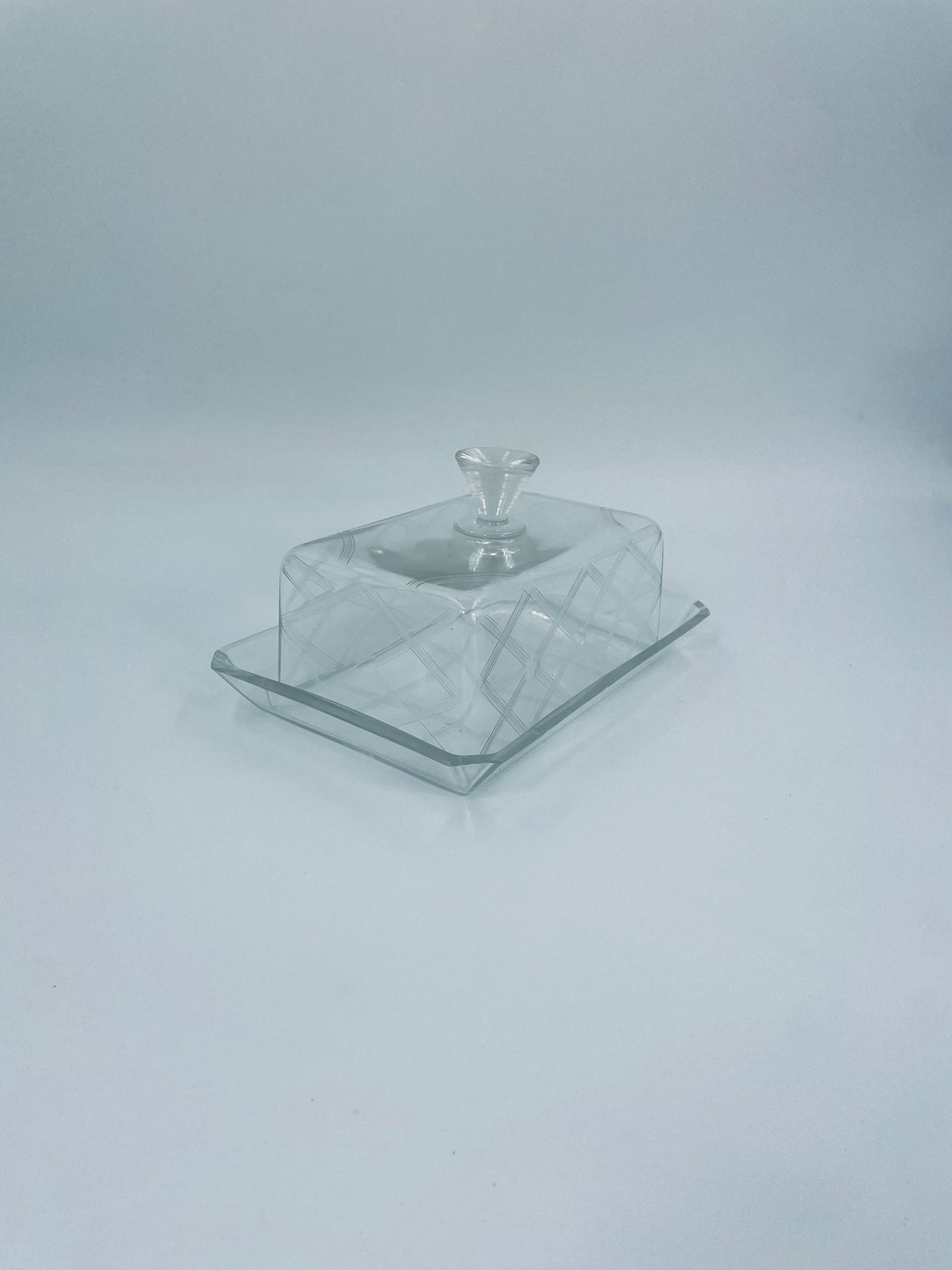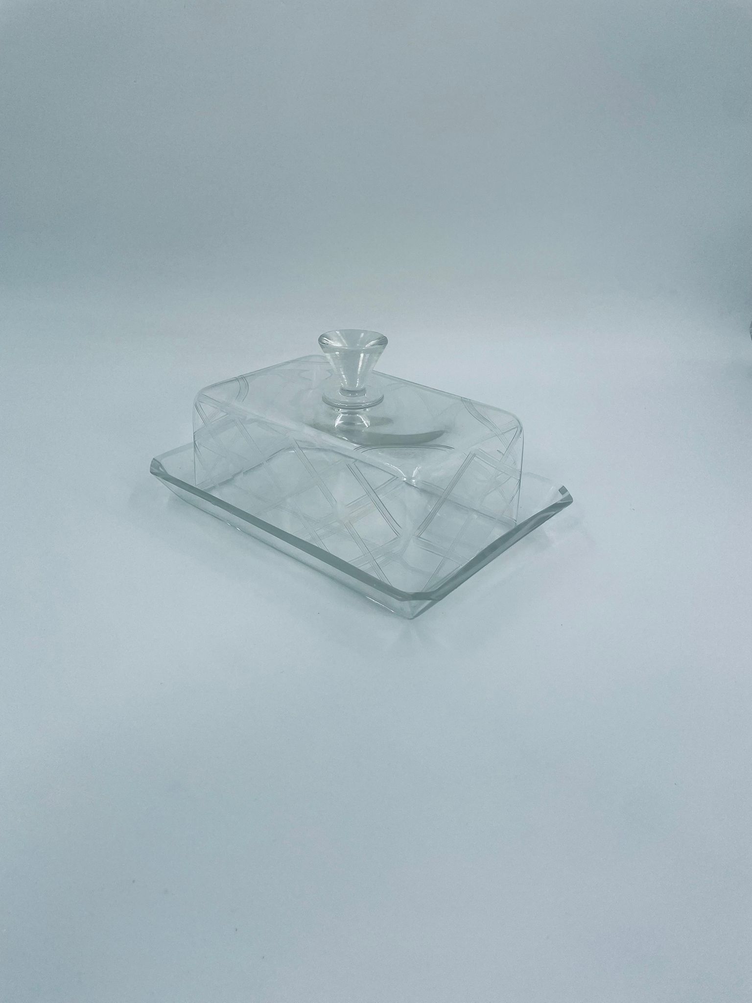 Vintage style butter bowl with lid, made of solid clear glass. The buttery is oblong in shape, with a lid and handle. It has cut-out patterns on the lid and on the base. Chipping on the rim of the base.