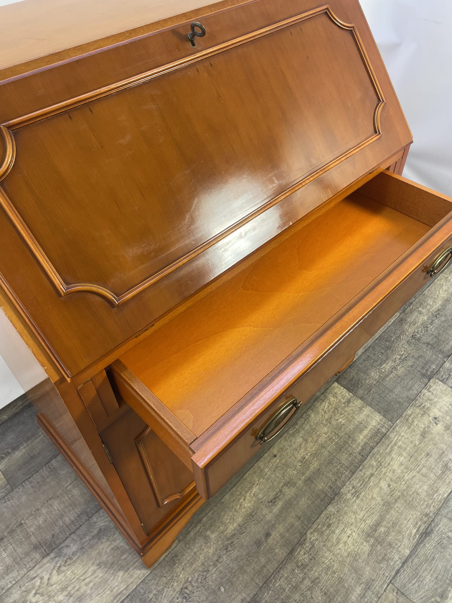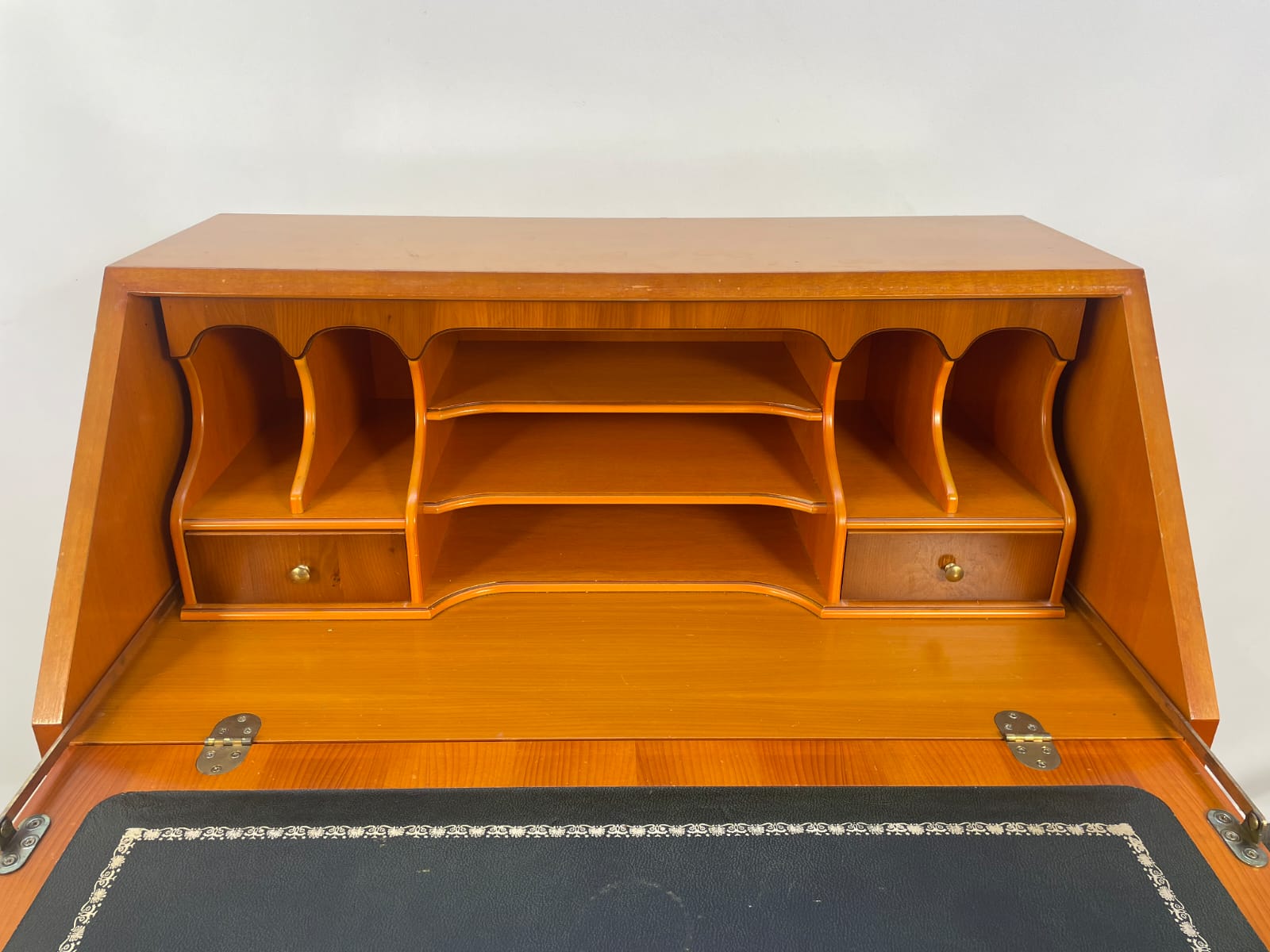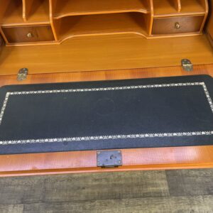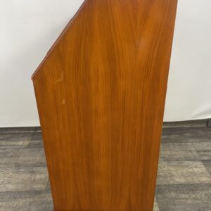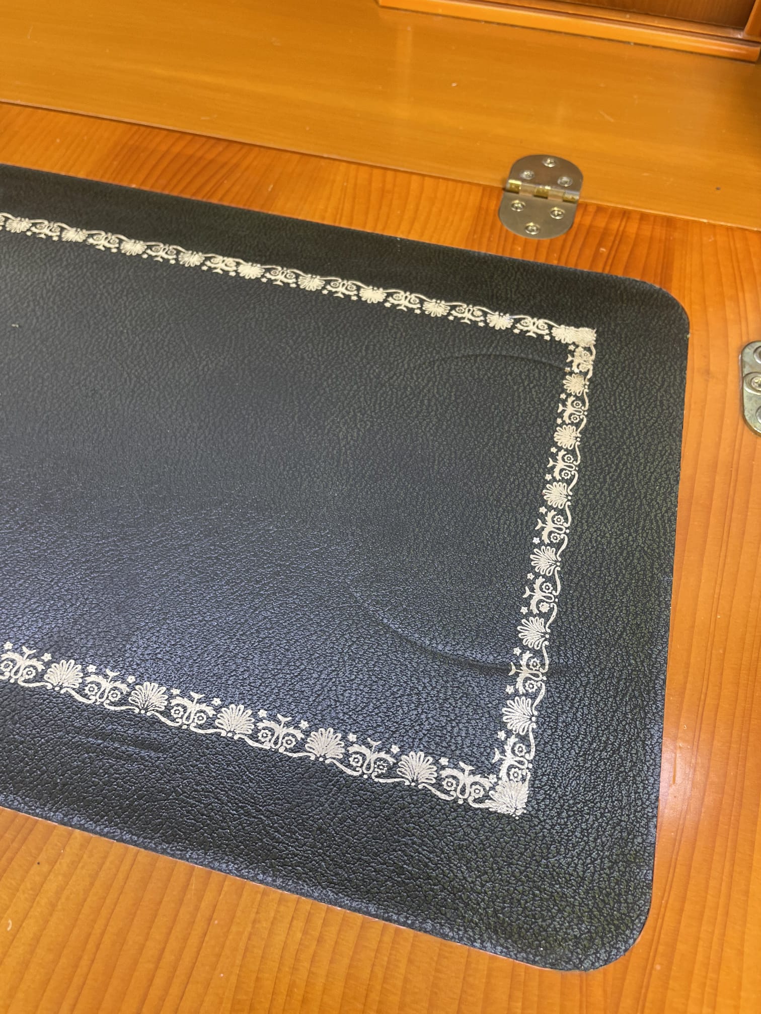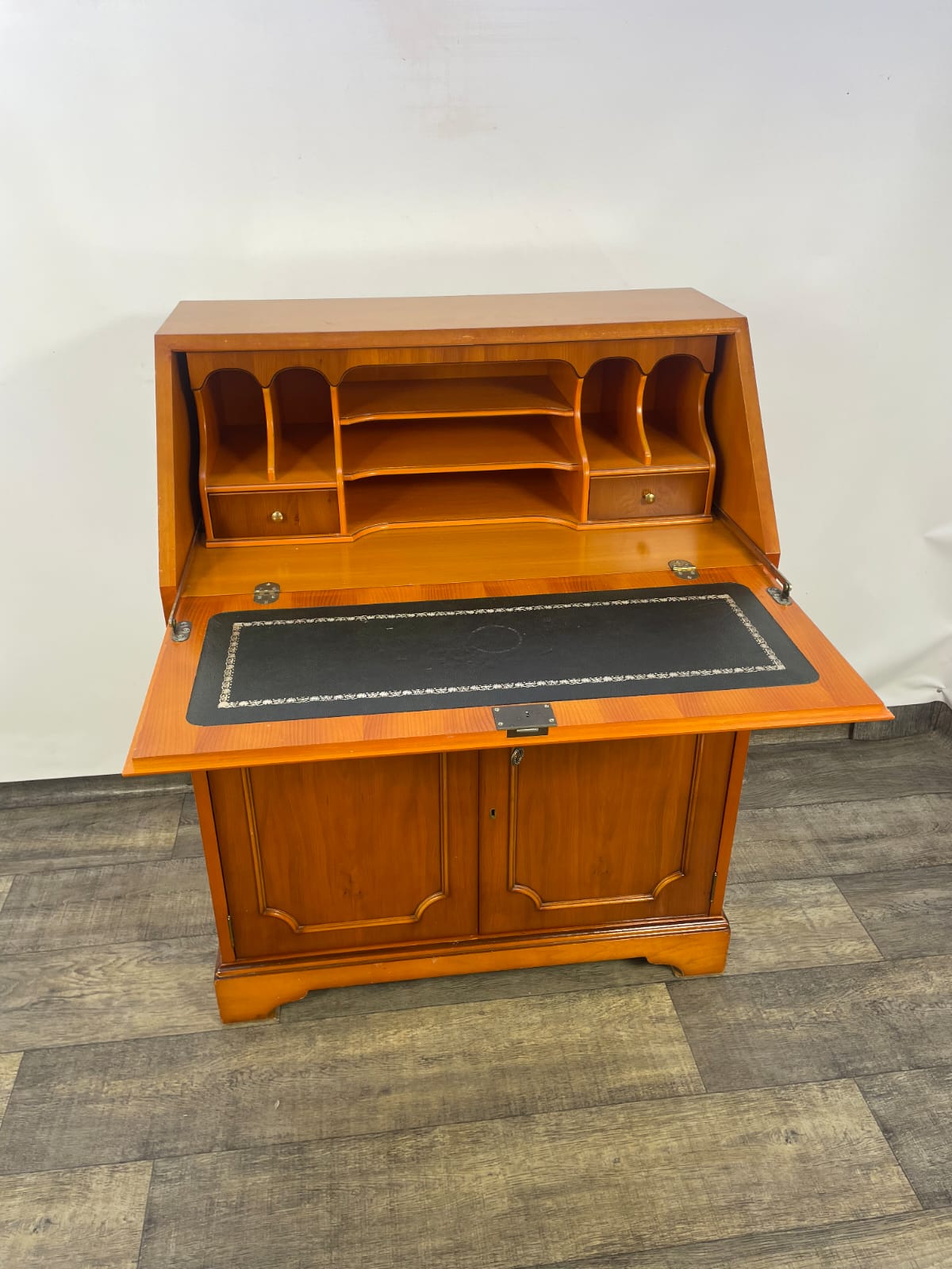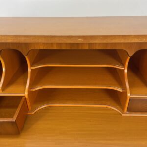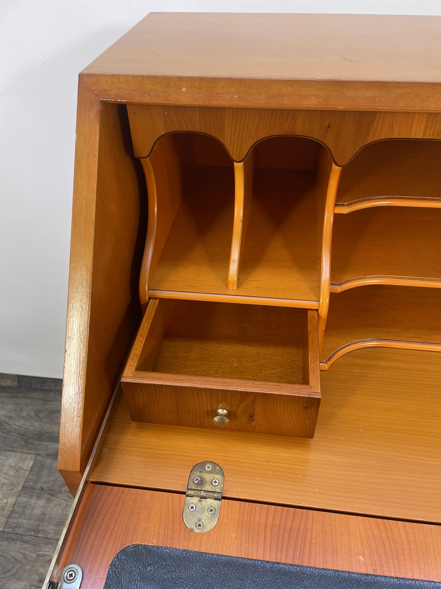 Wooden desk covered in teak veneer and black natural leather on the top....