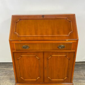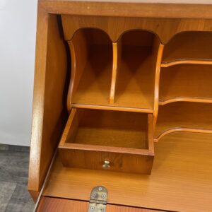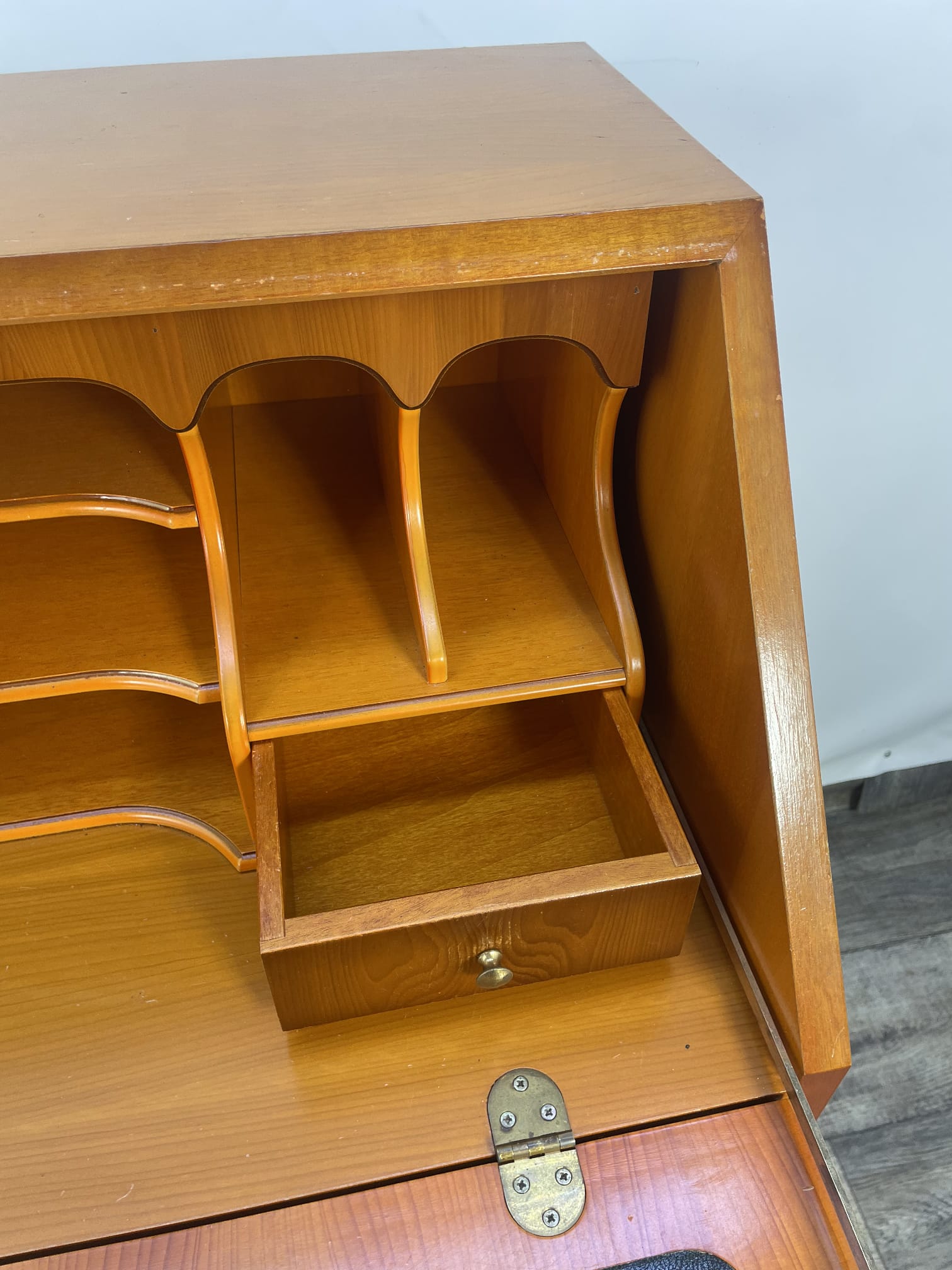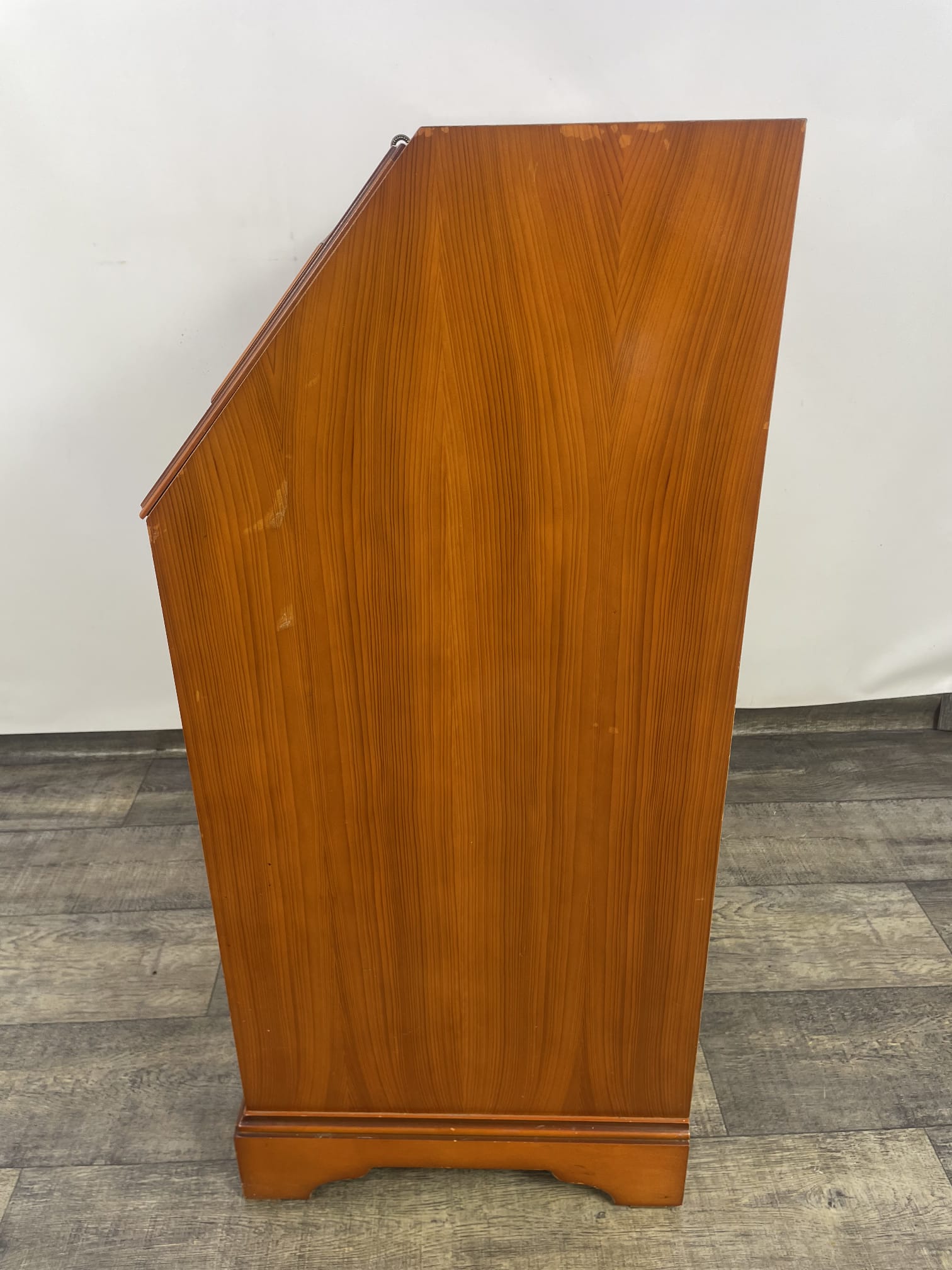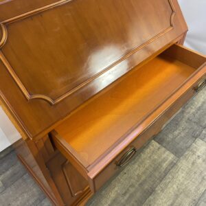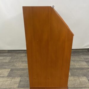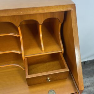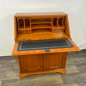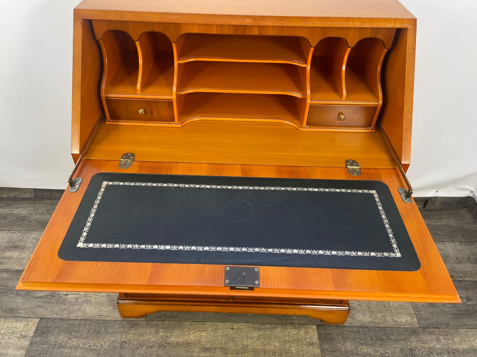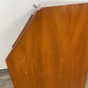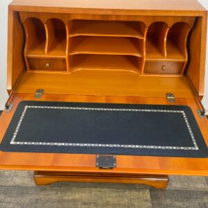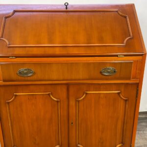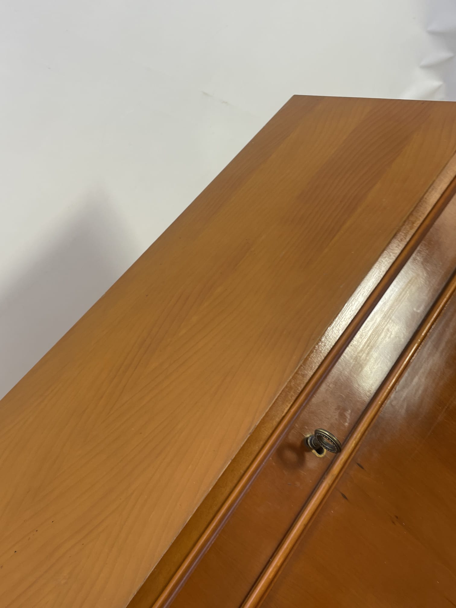 Wooden desk covered in teak veneer and black natural leather on the top....