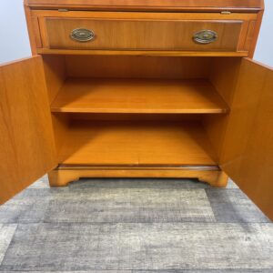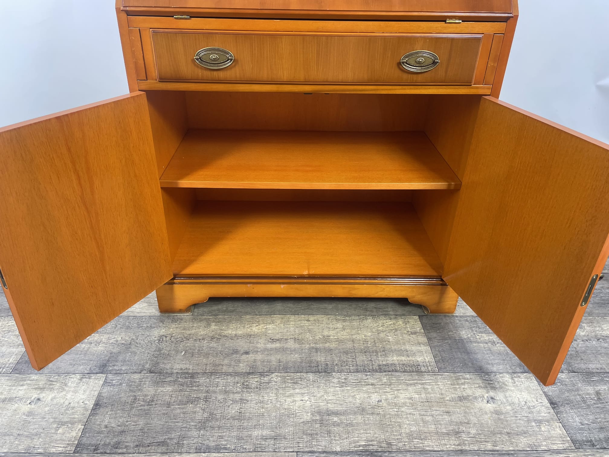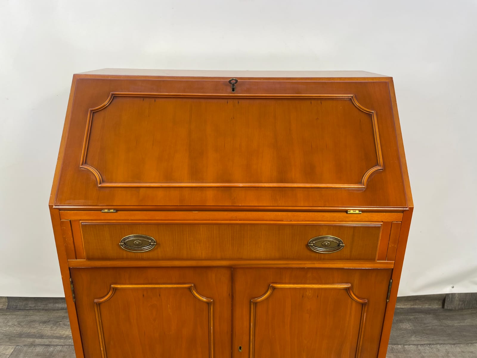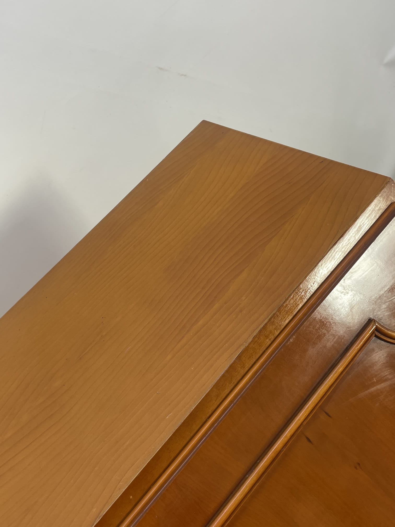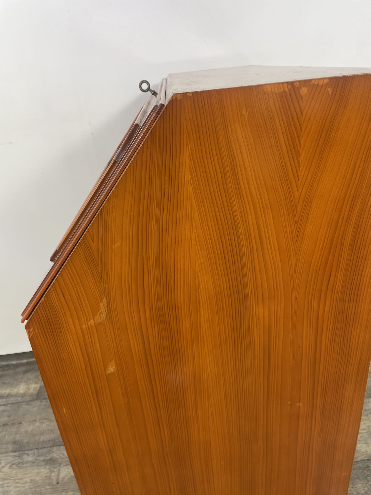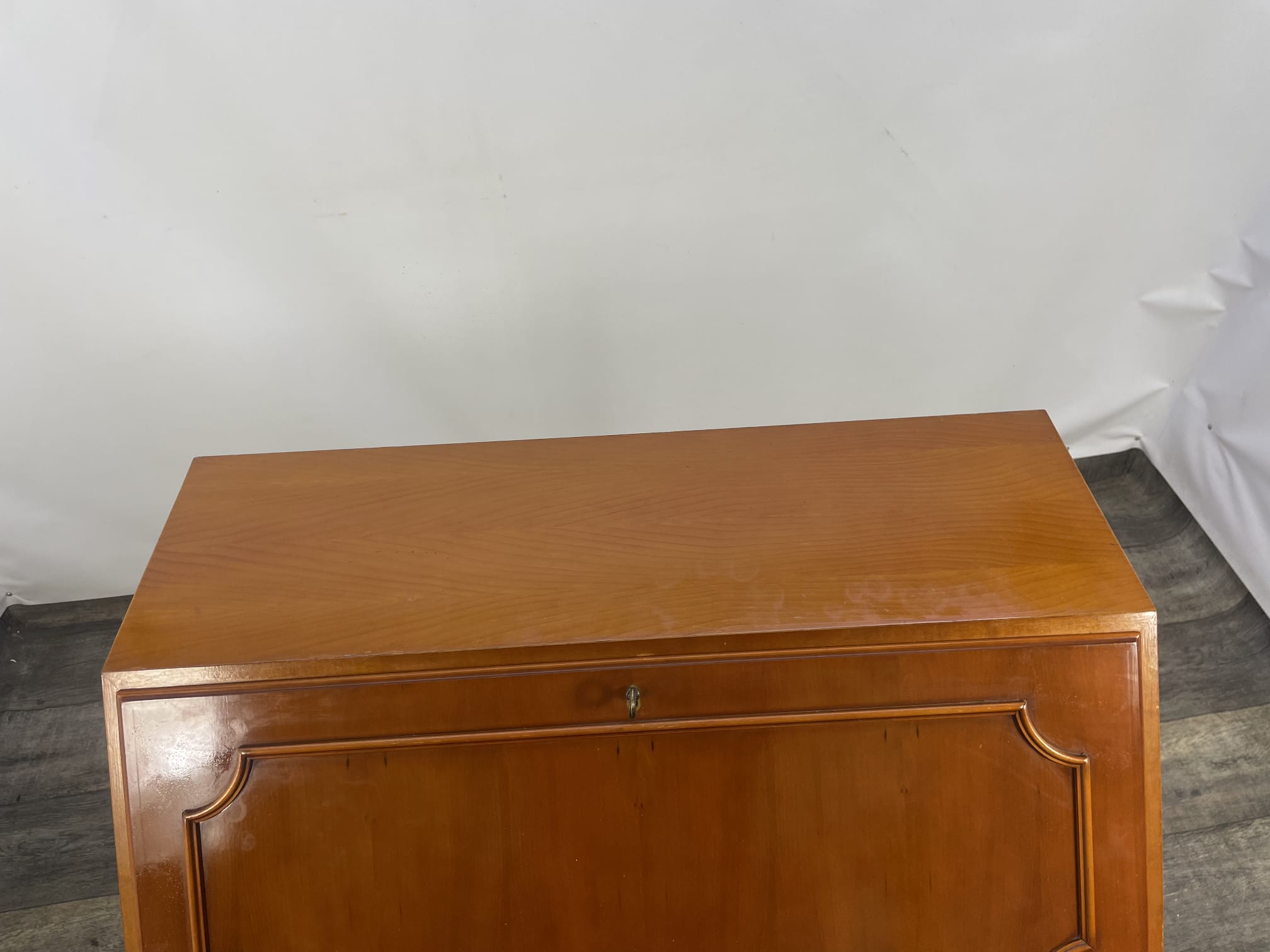 Wooden desk covered in teak veneer and black natural leather on the top....