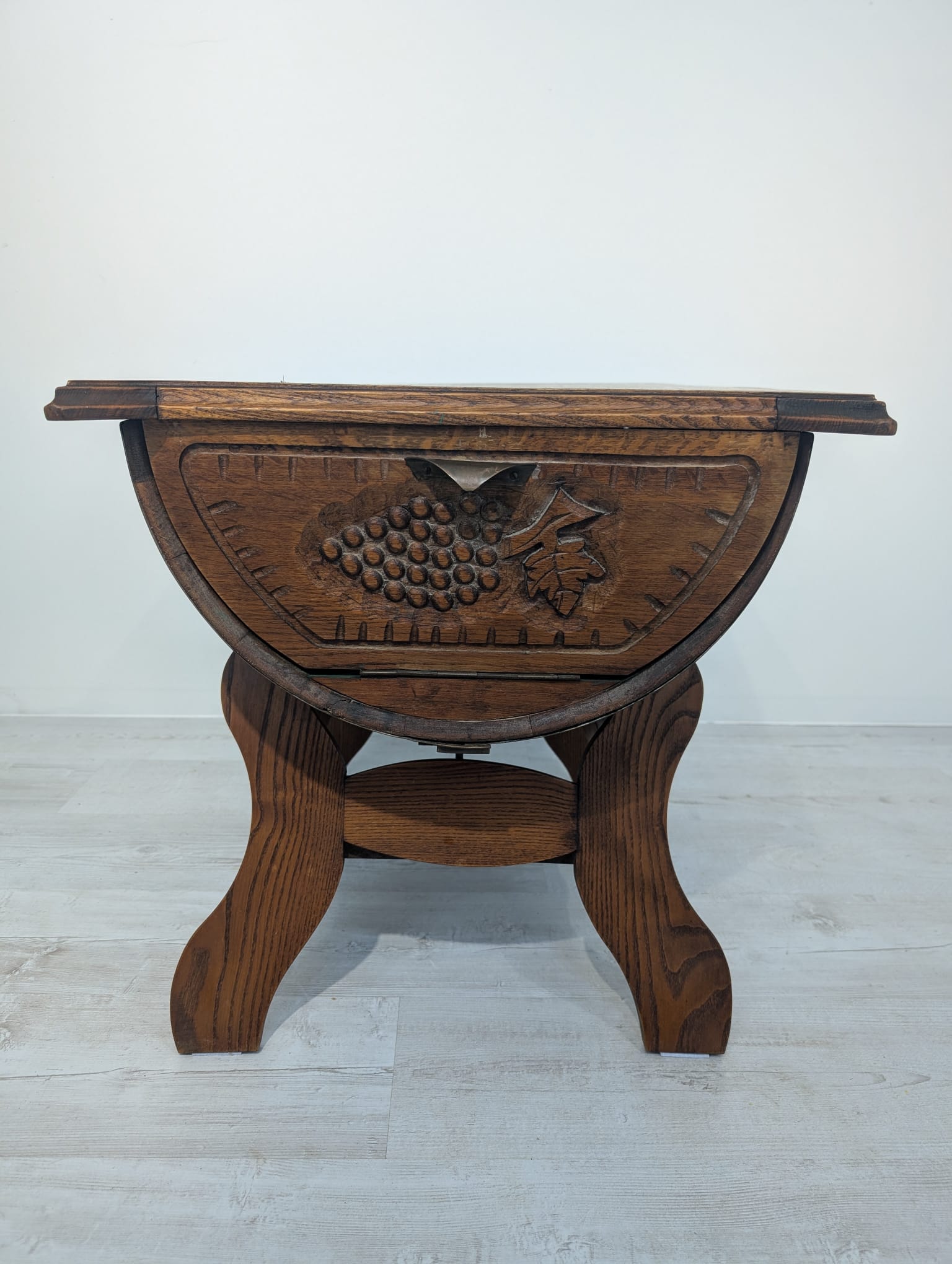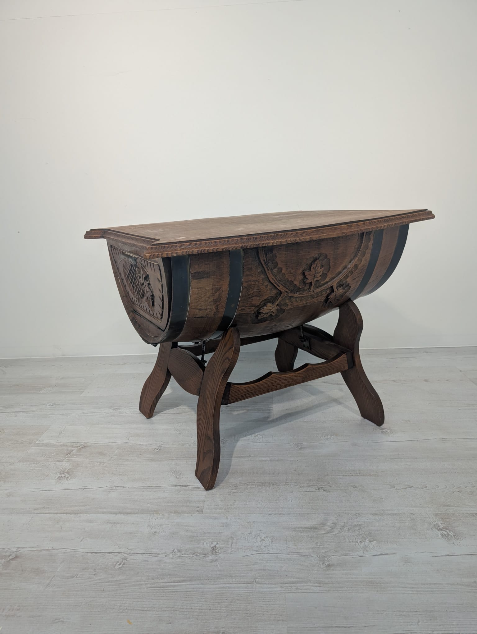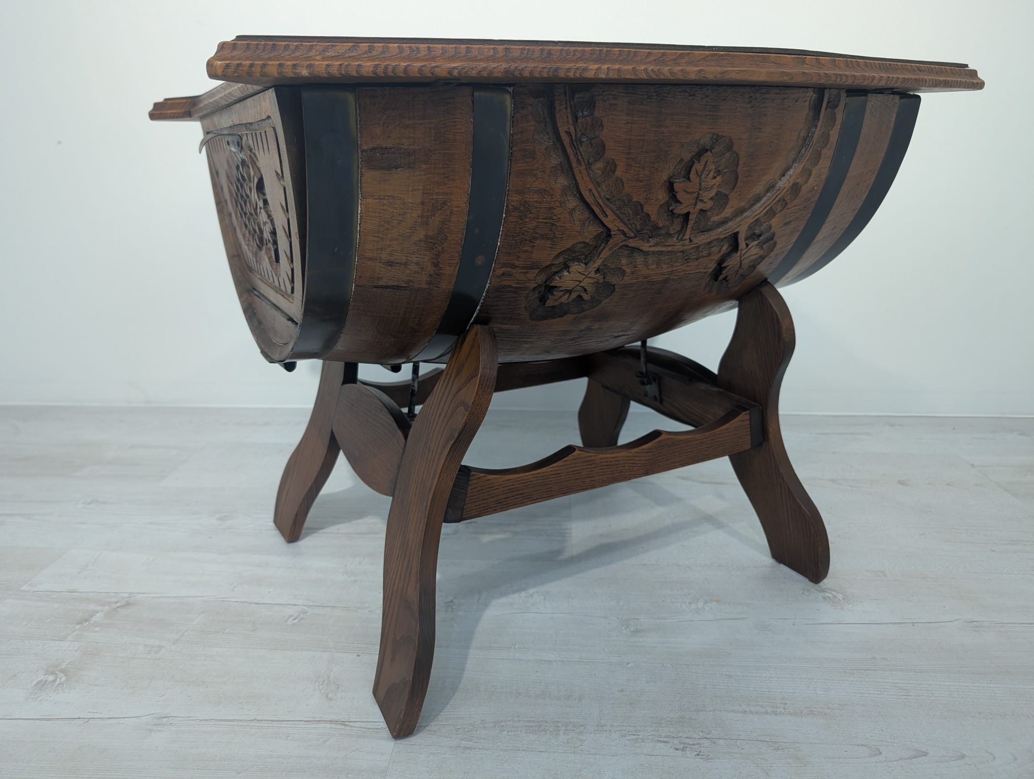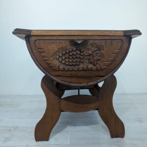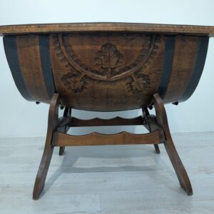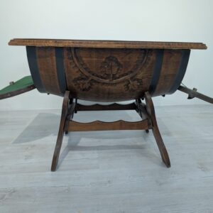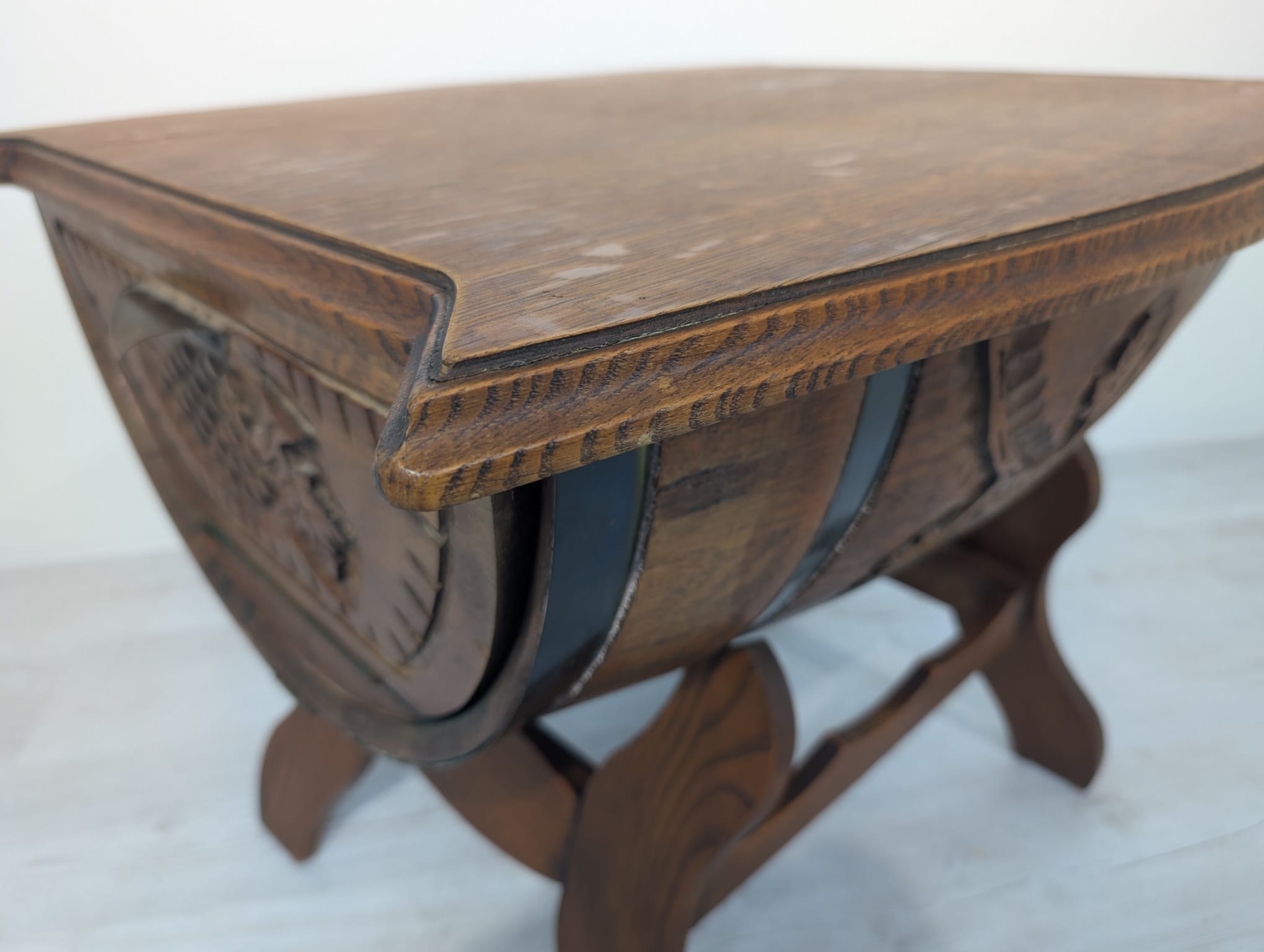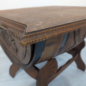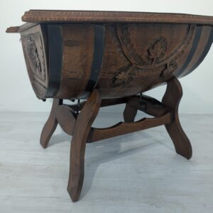 Hand carved whisky barrel bar cabinet. Unique and stylish design with oak top. Ideal as a bar table or decoration for the home. A used product but in good condition.