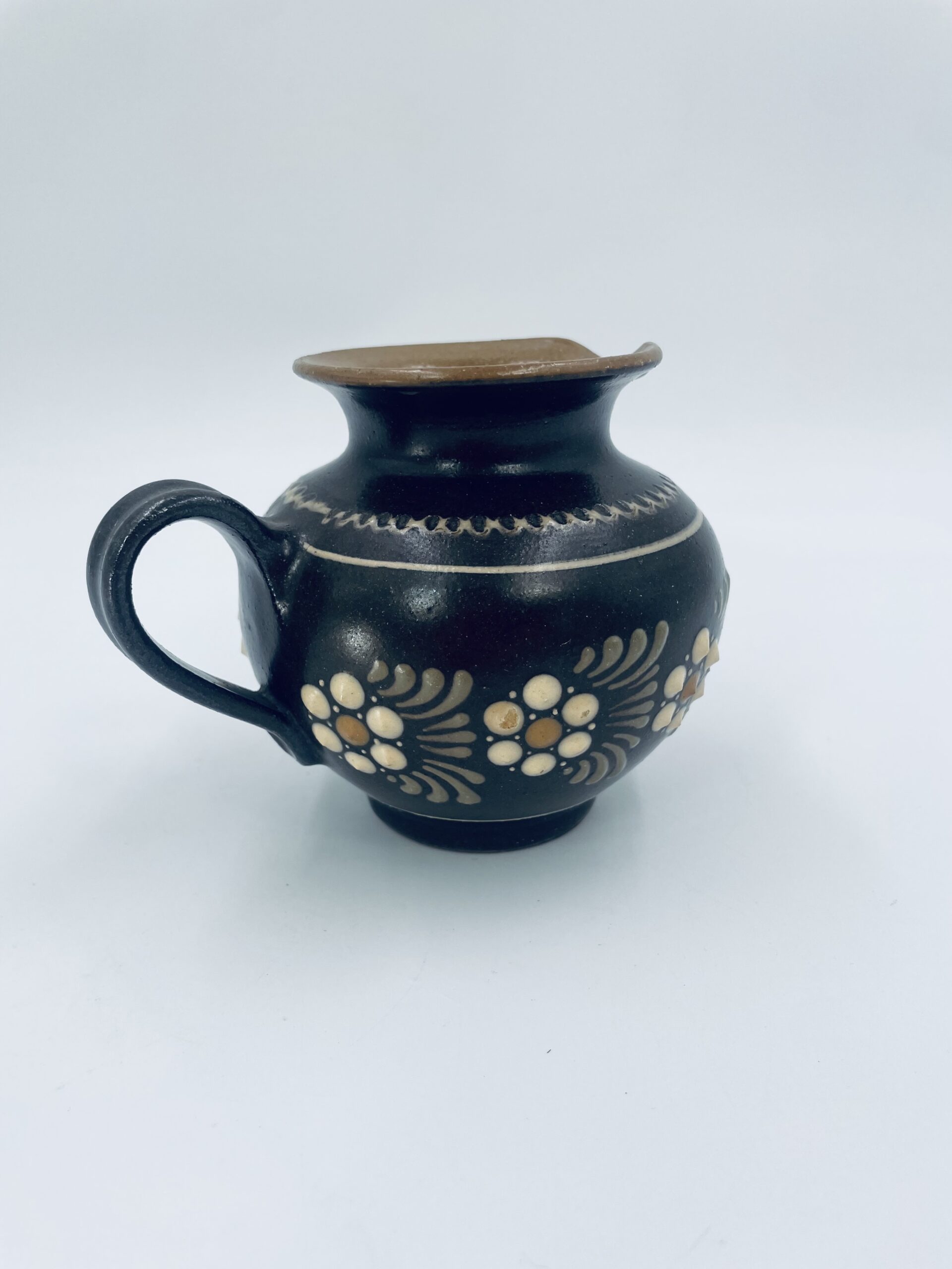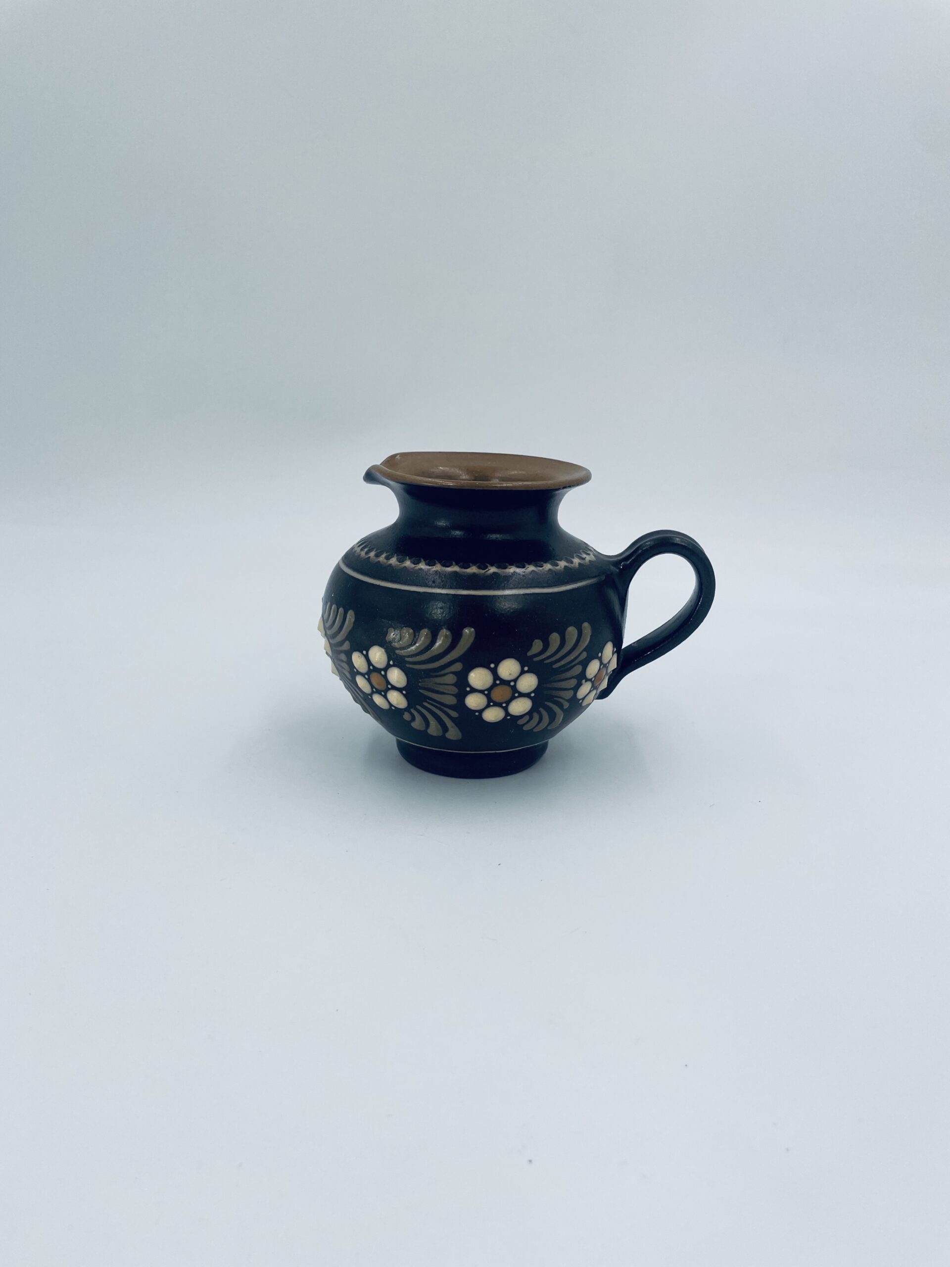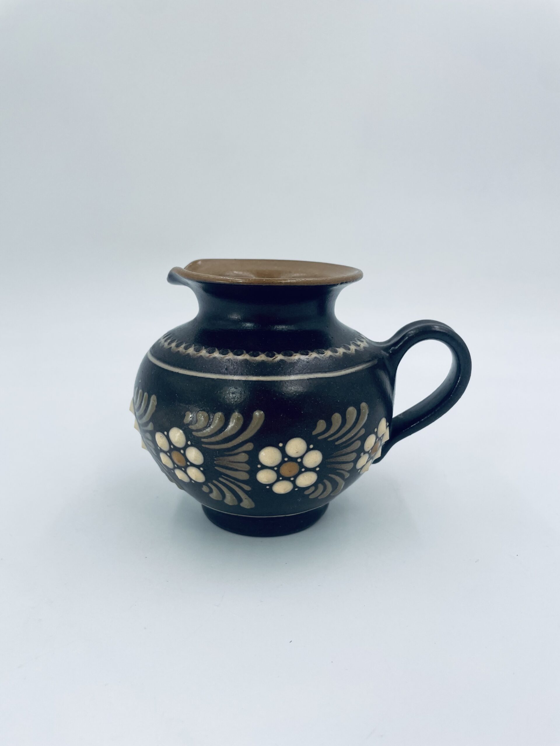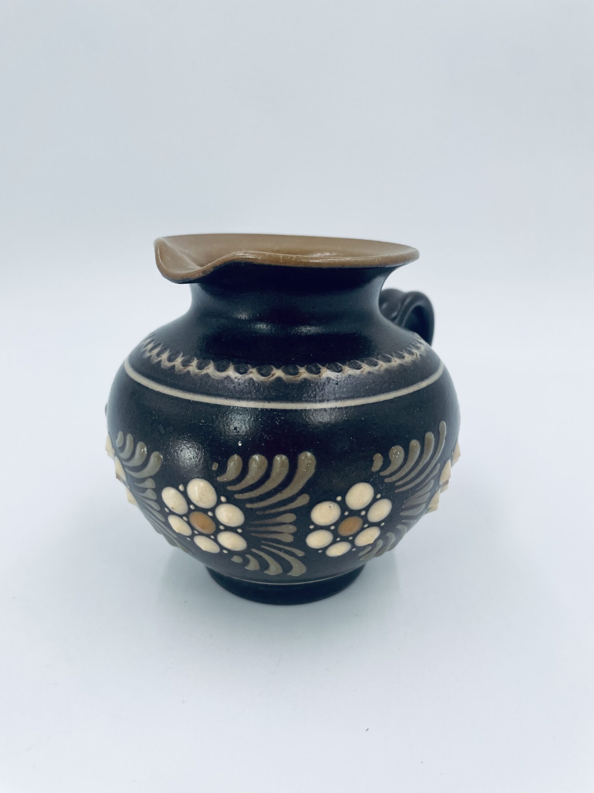 A small jug made of ceramic in the 1990s. The jug is handmade and painted in lilac and depicting raised flowers.