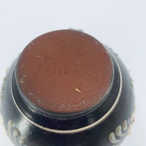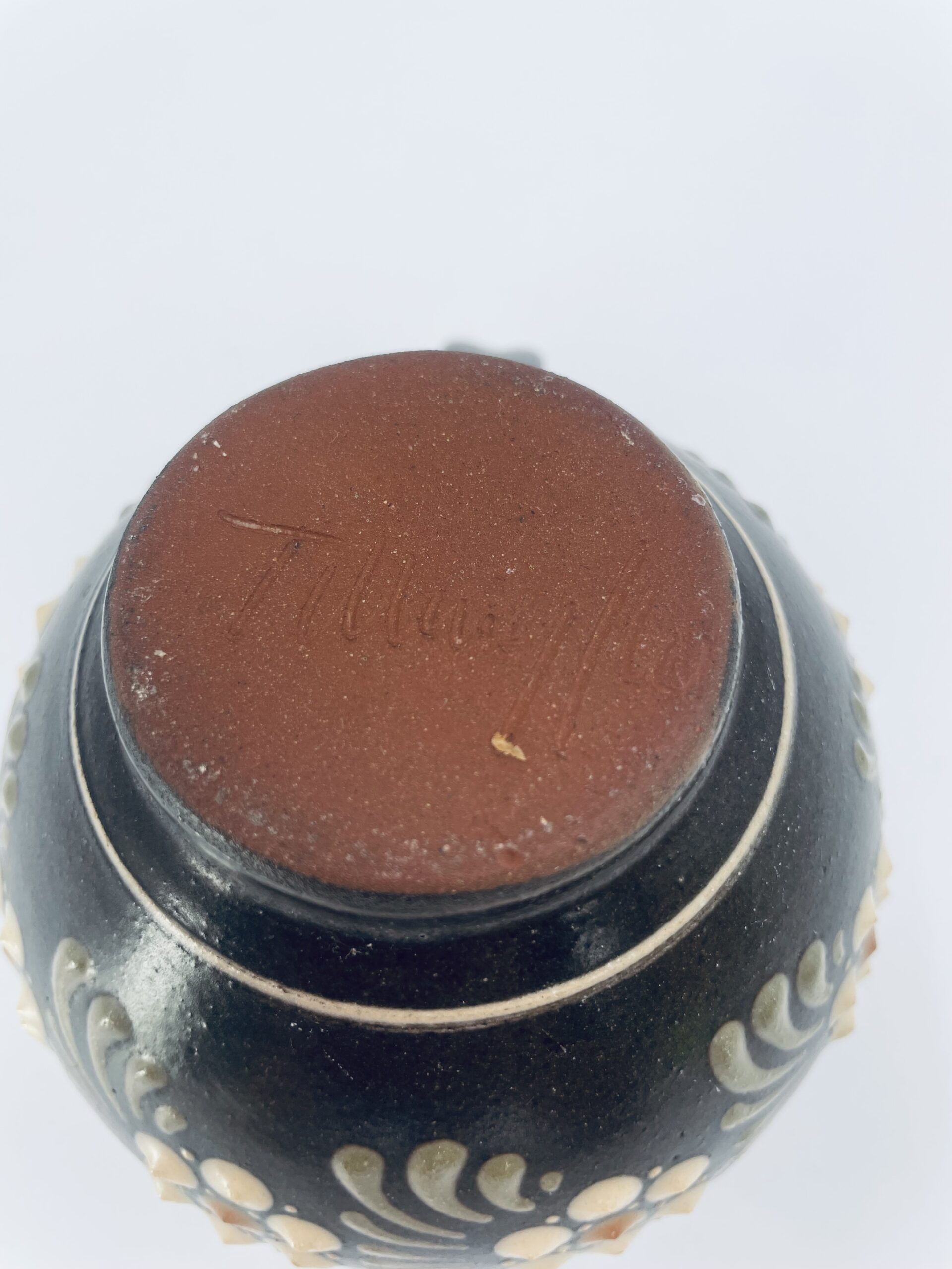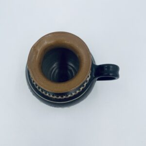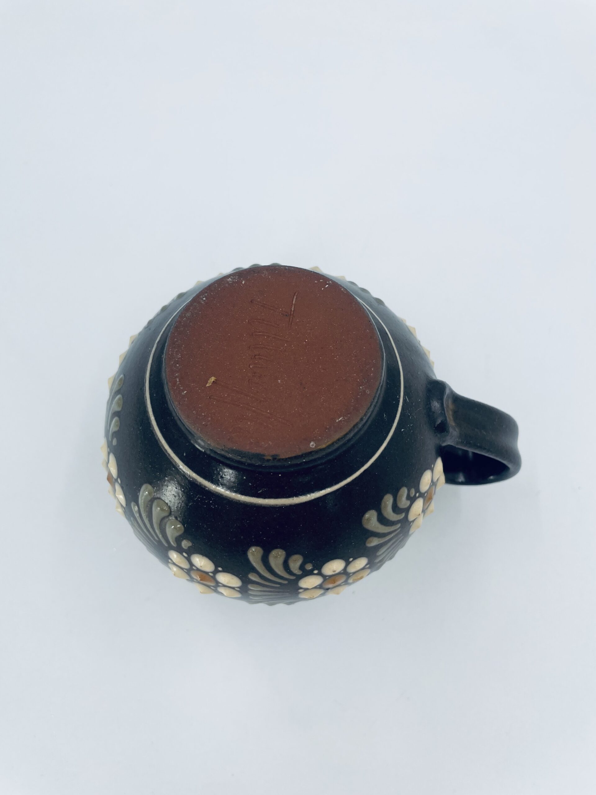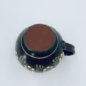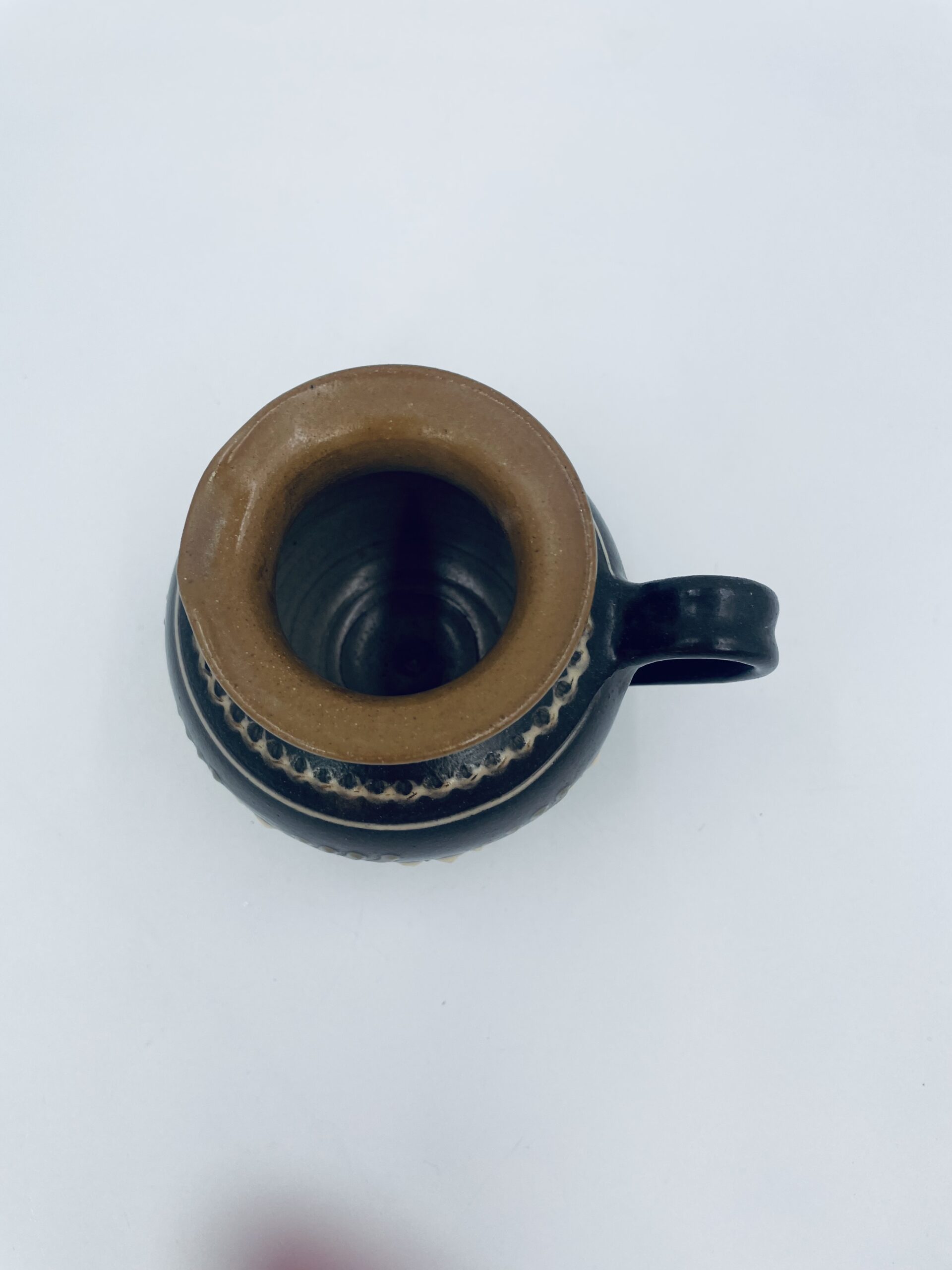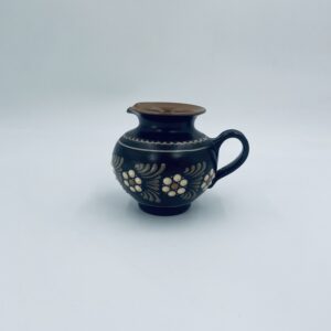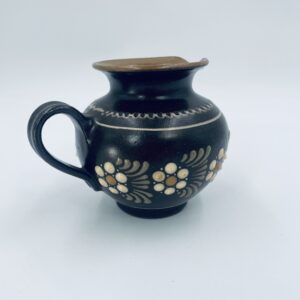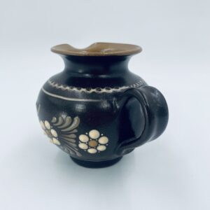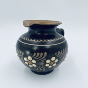 A small jug made of ceramic in the 1990s. The jug is handmade and painted in lilac and depicting raised flowers.