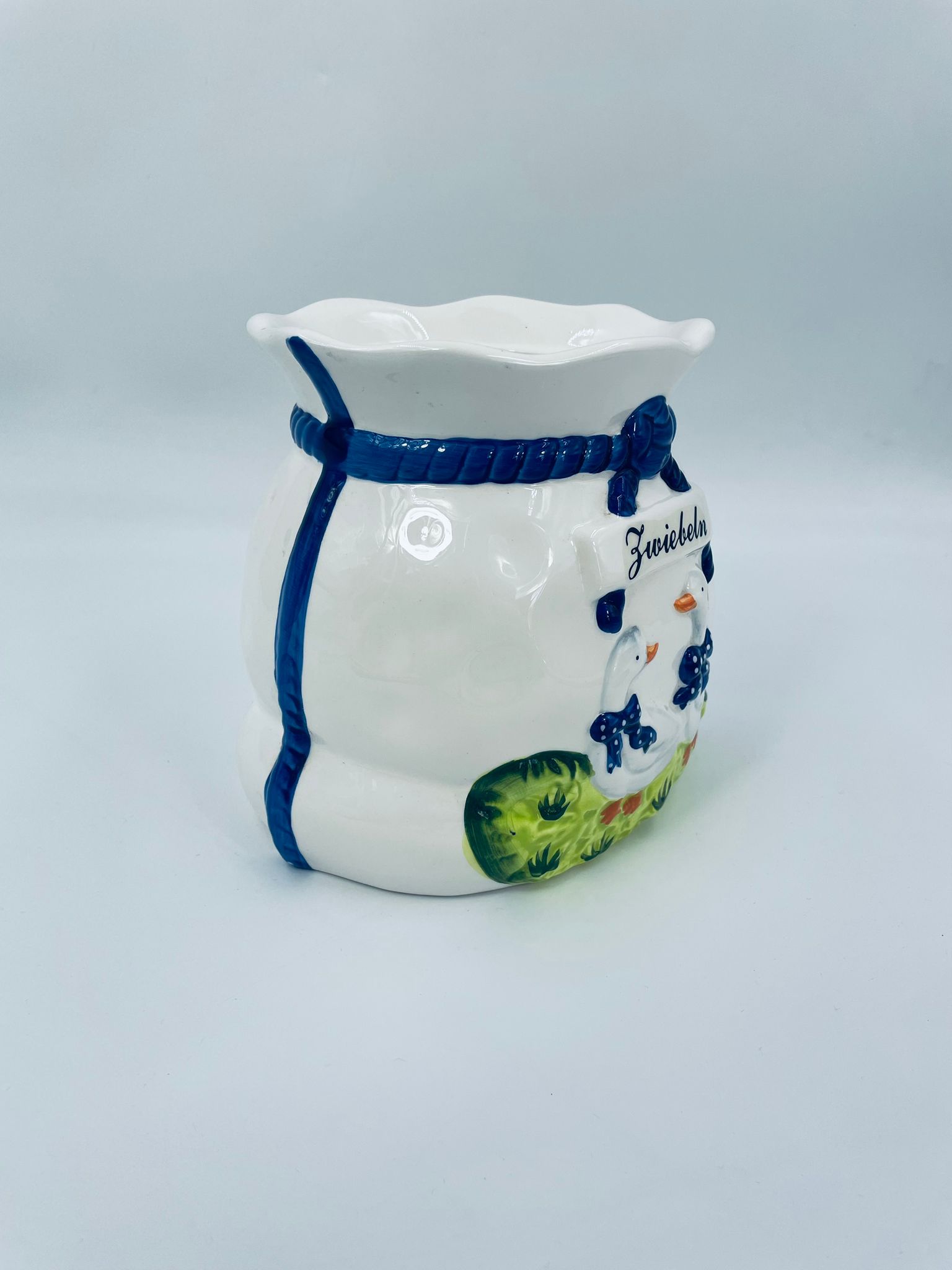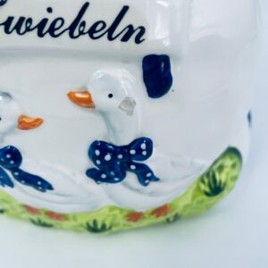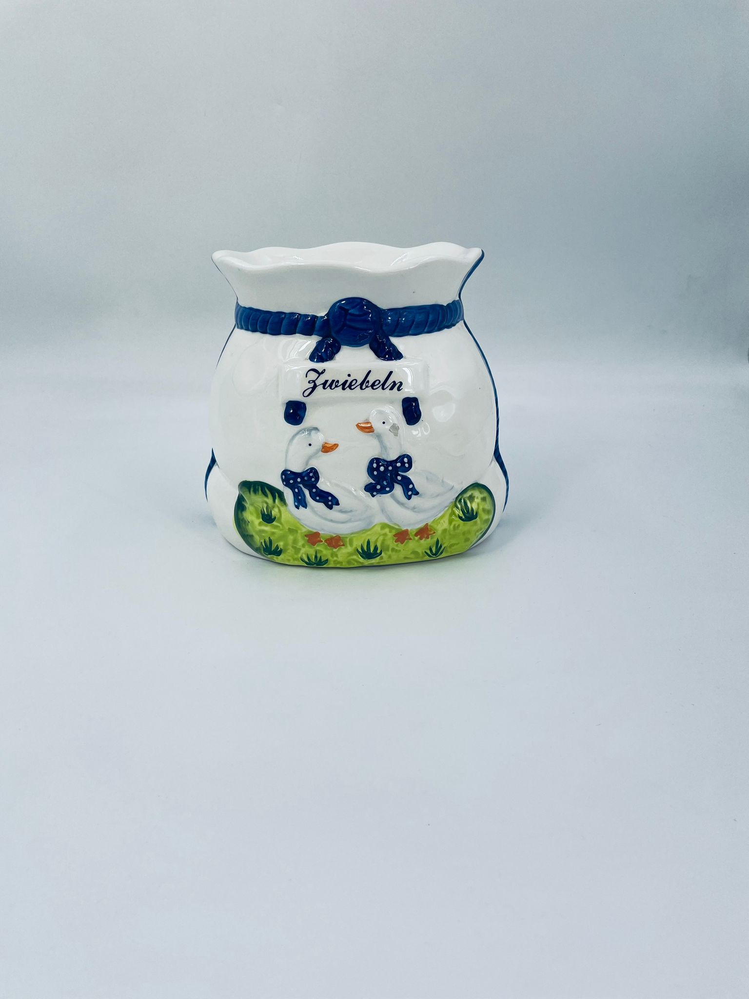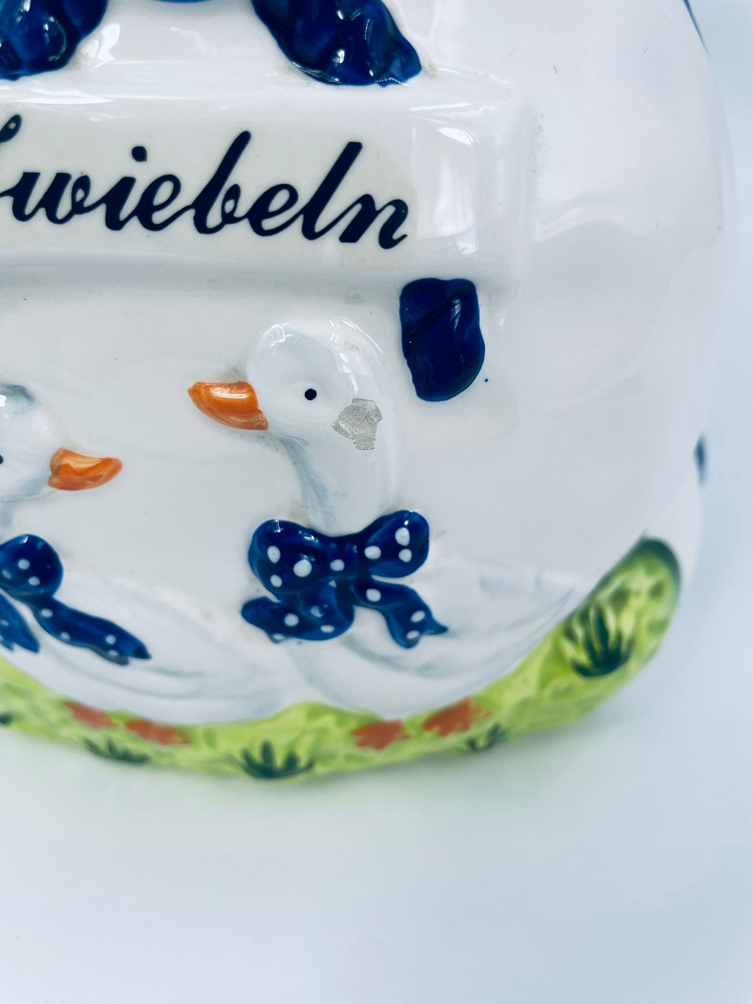 Ceramic onion container in white and with a border in navy blue. The container decorated with a decoration depicting two goose sitting on the grass with blue scarves with white dots. The decorative container is used to store onions. The container has a damage to the goose.