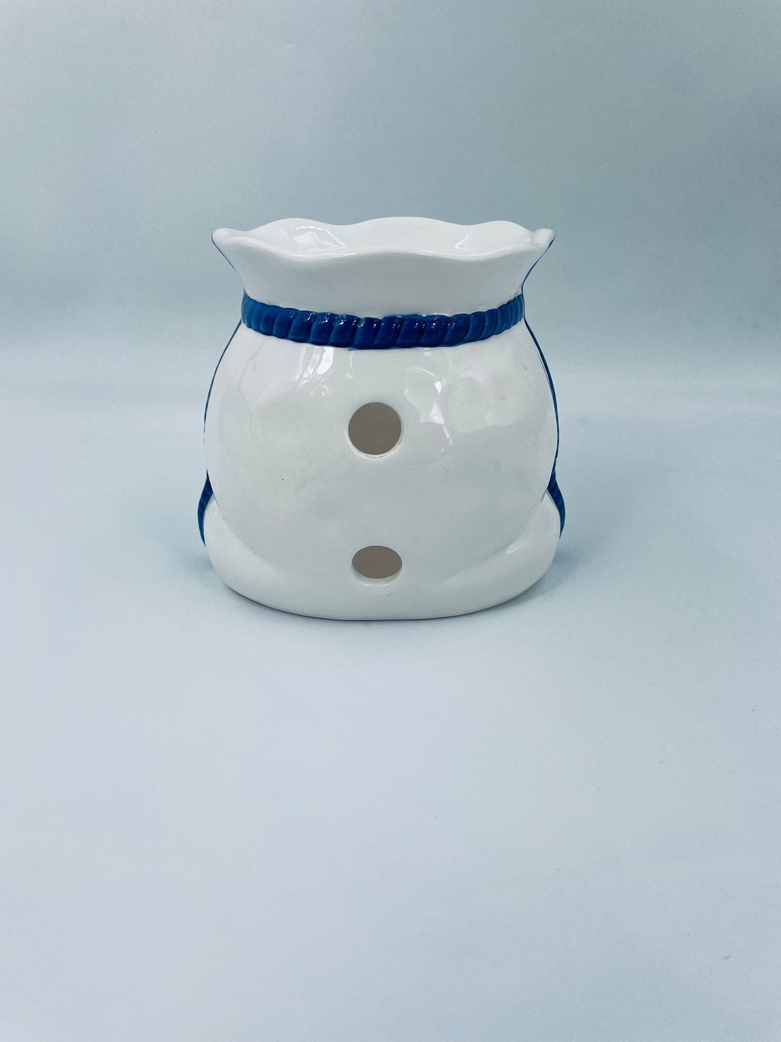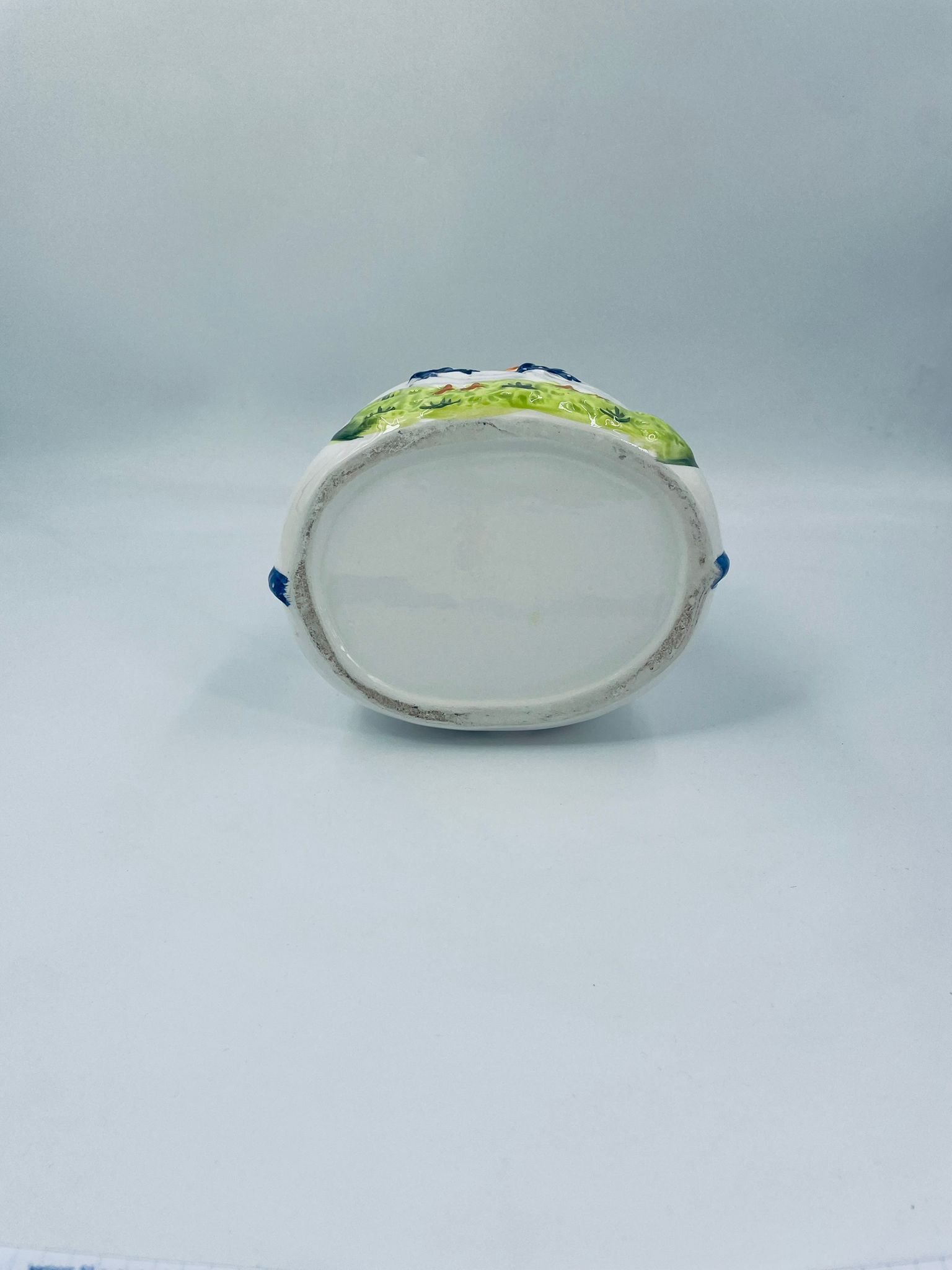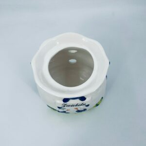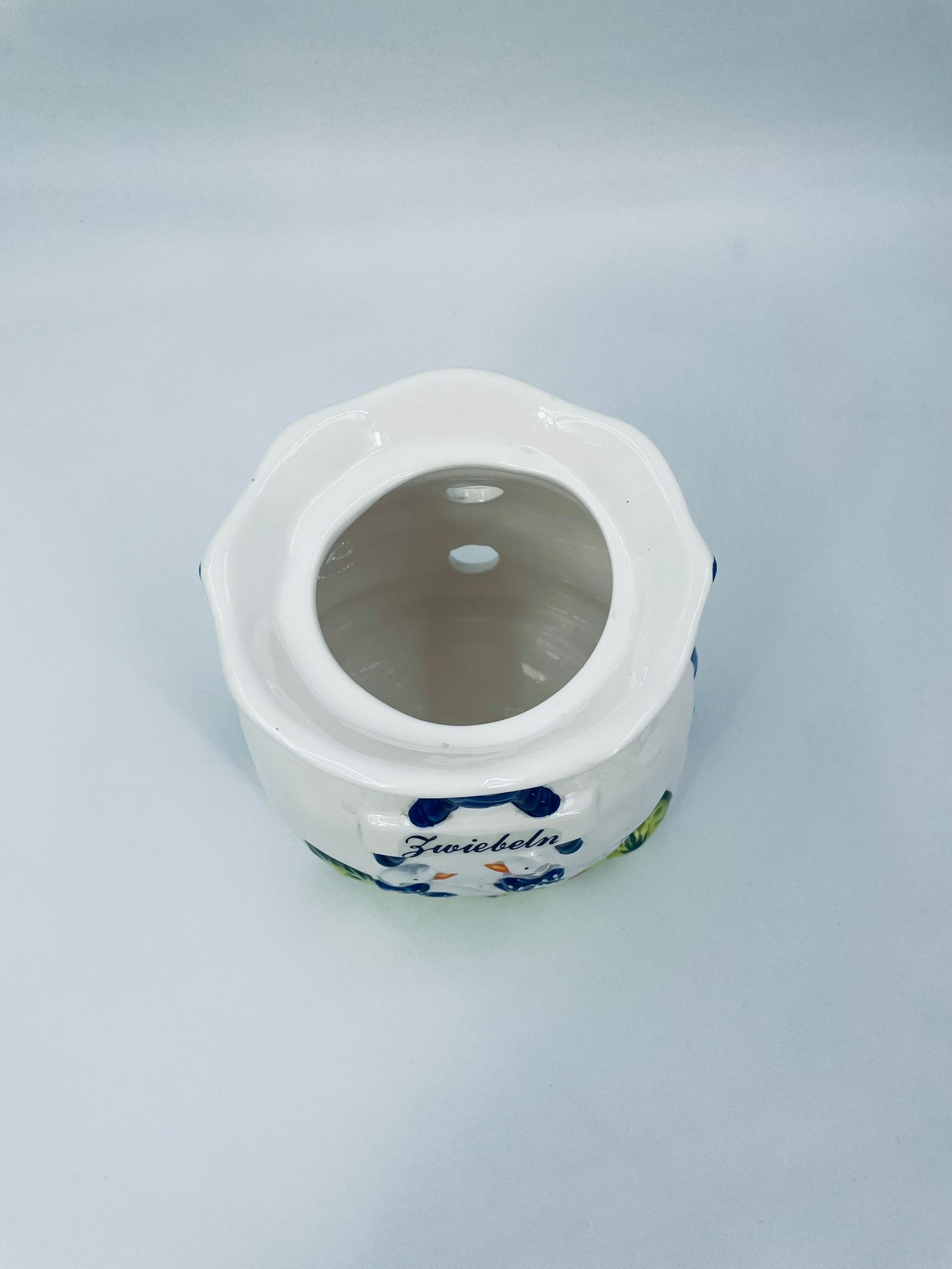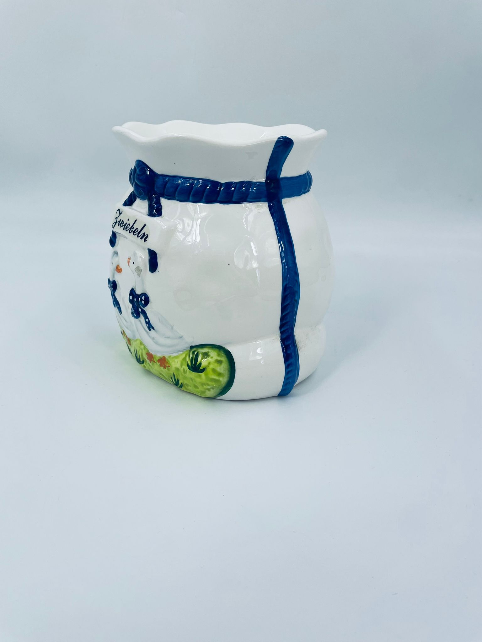 Ceramic onion container in white and with a border in navy blue. The container decorated with a decoration depicting two goose sitting on the grass with blue scarves with white dots. The decorative container is used to store onions. The container has a damage to the goose.