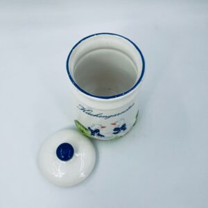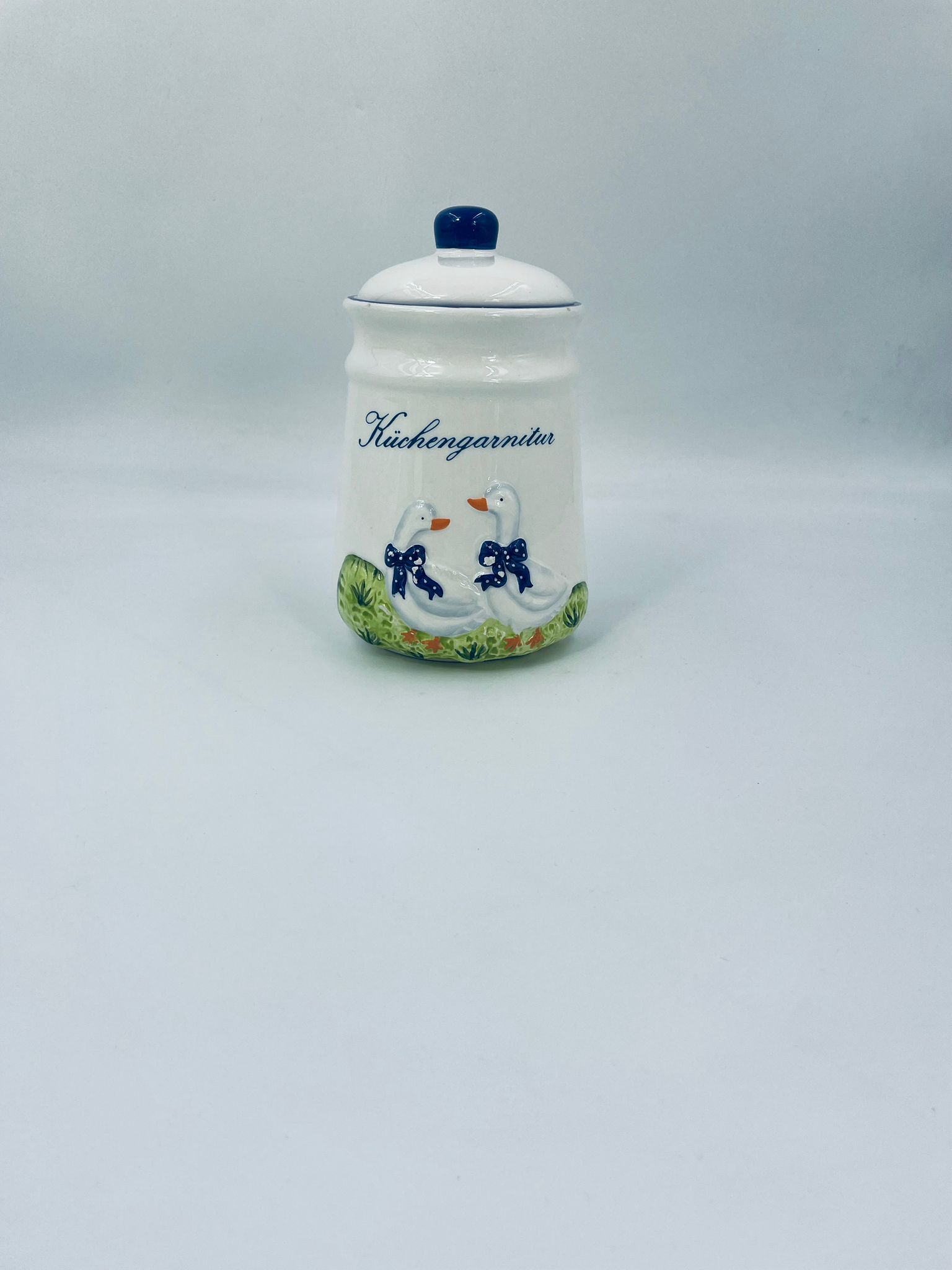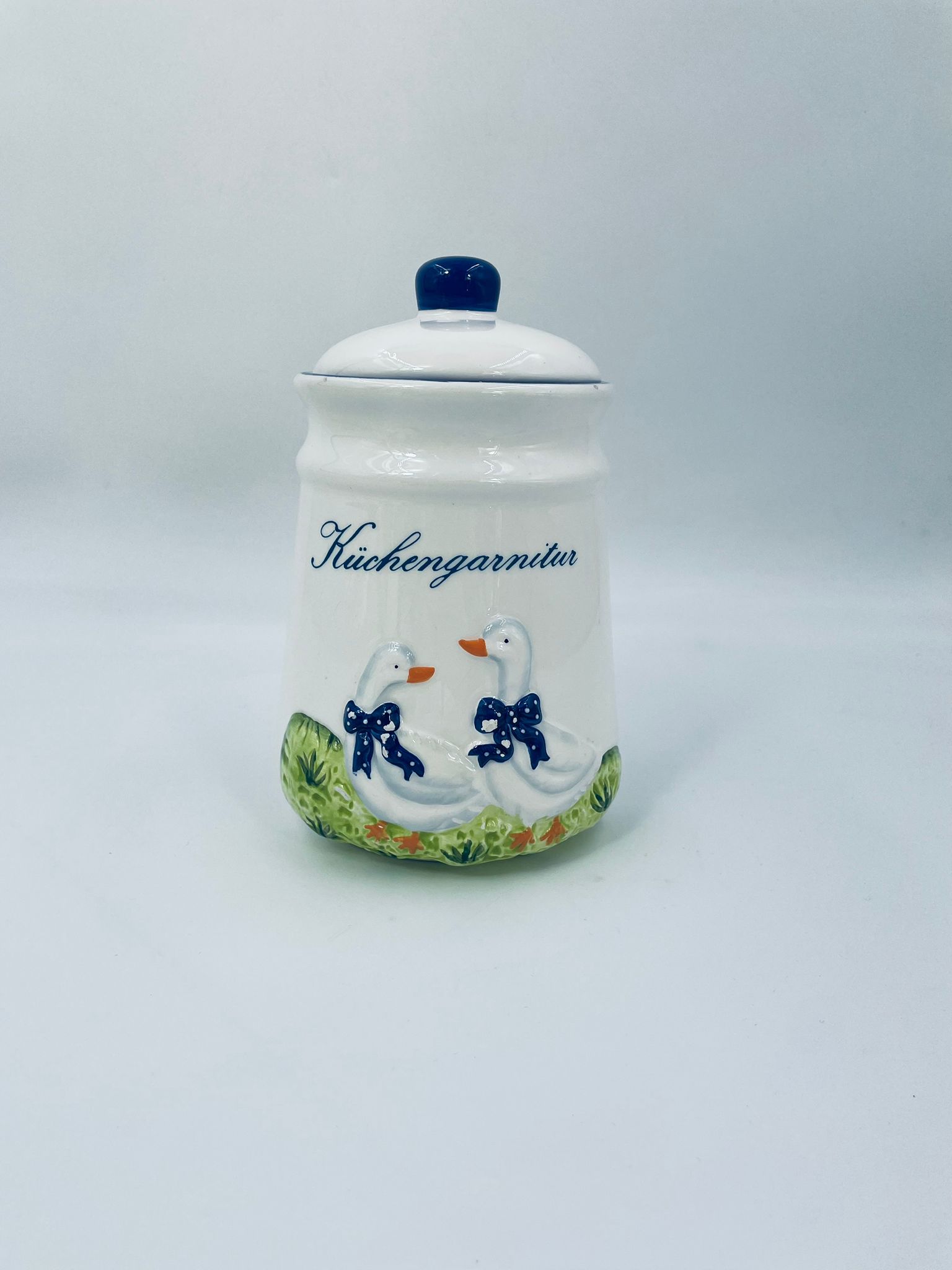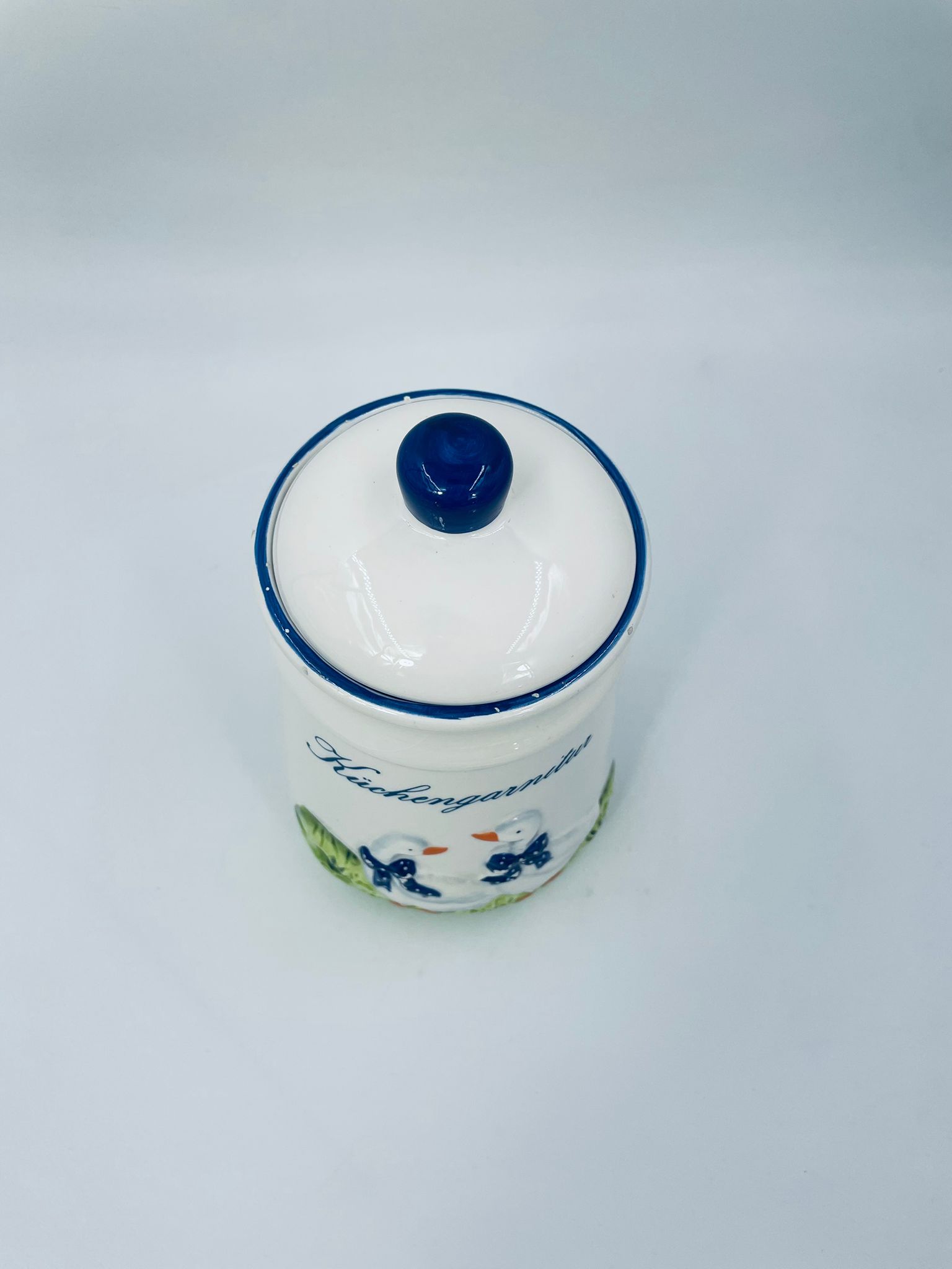 Ceramic container with lid in white with a border in navy blue. The container decorated with a decoration depicting two goose sitting on the grass with blue scarves with white dots. The decorative container can be used for food storage or for trinkets. The container has some cracks on the glaze and small damages on the top rim and on the bows