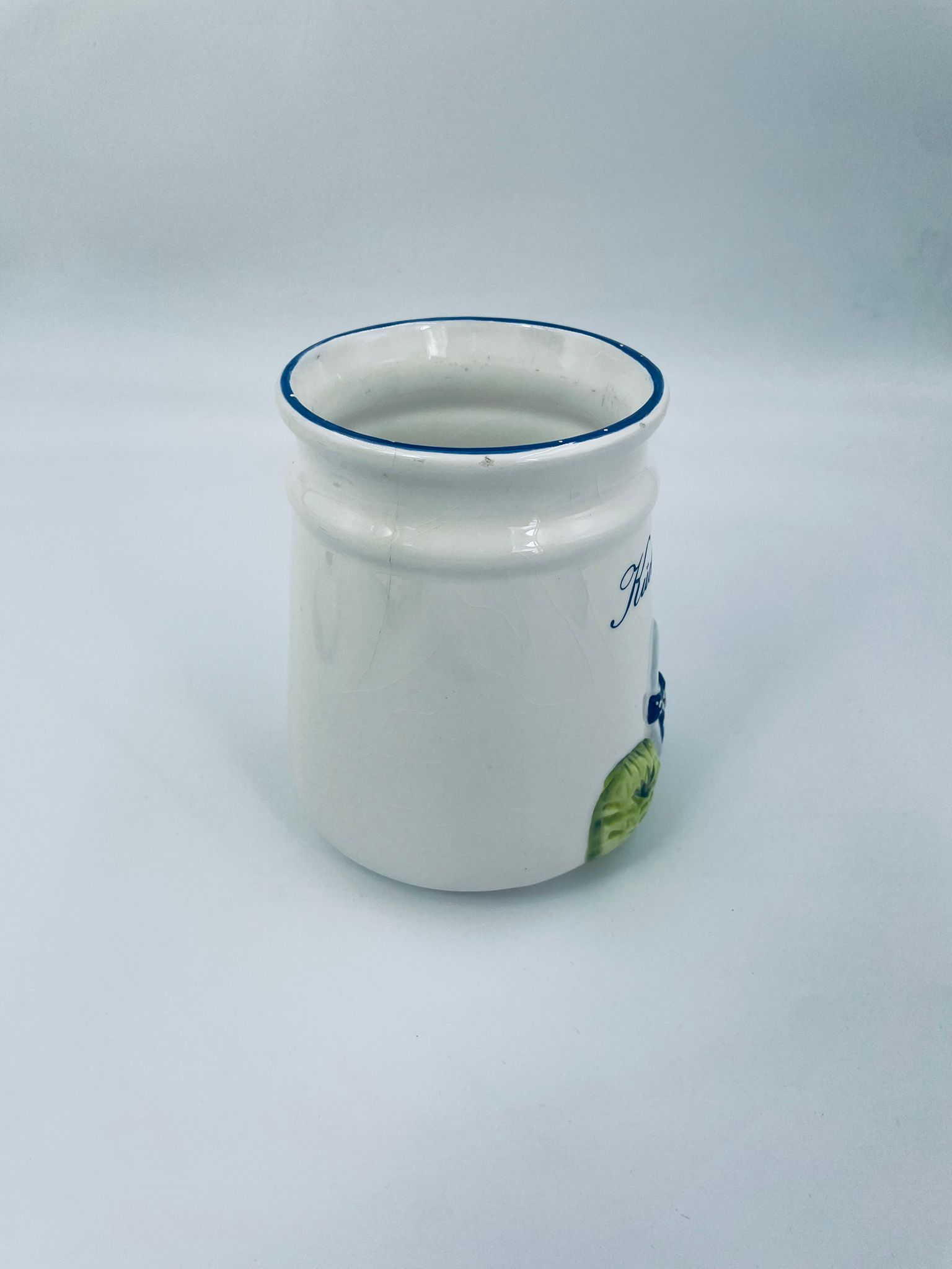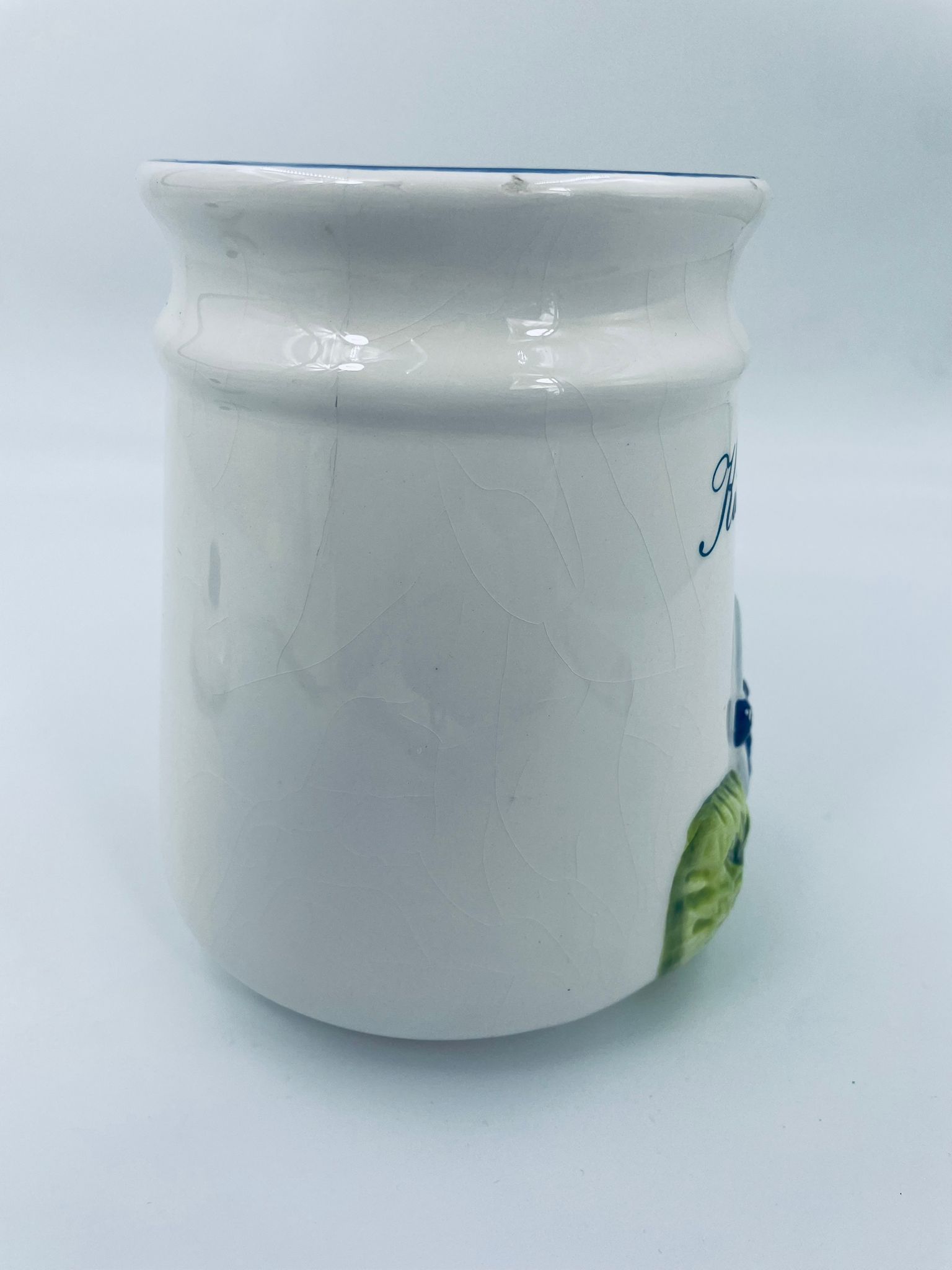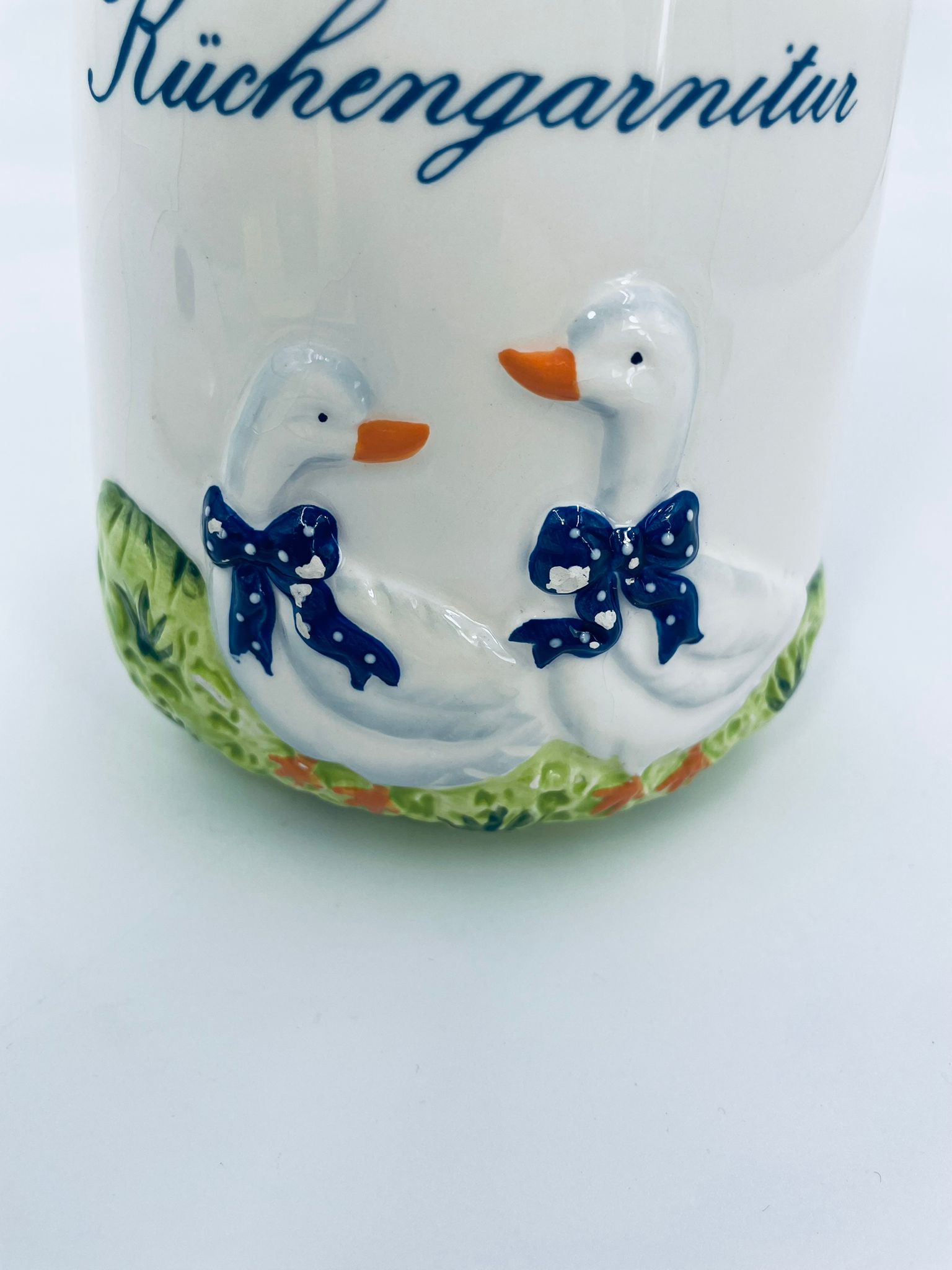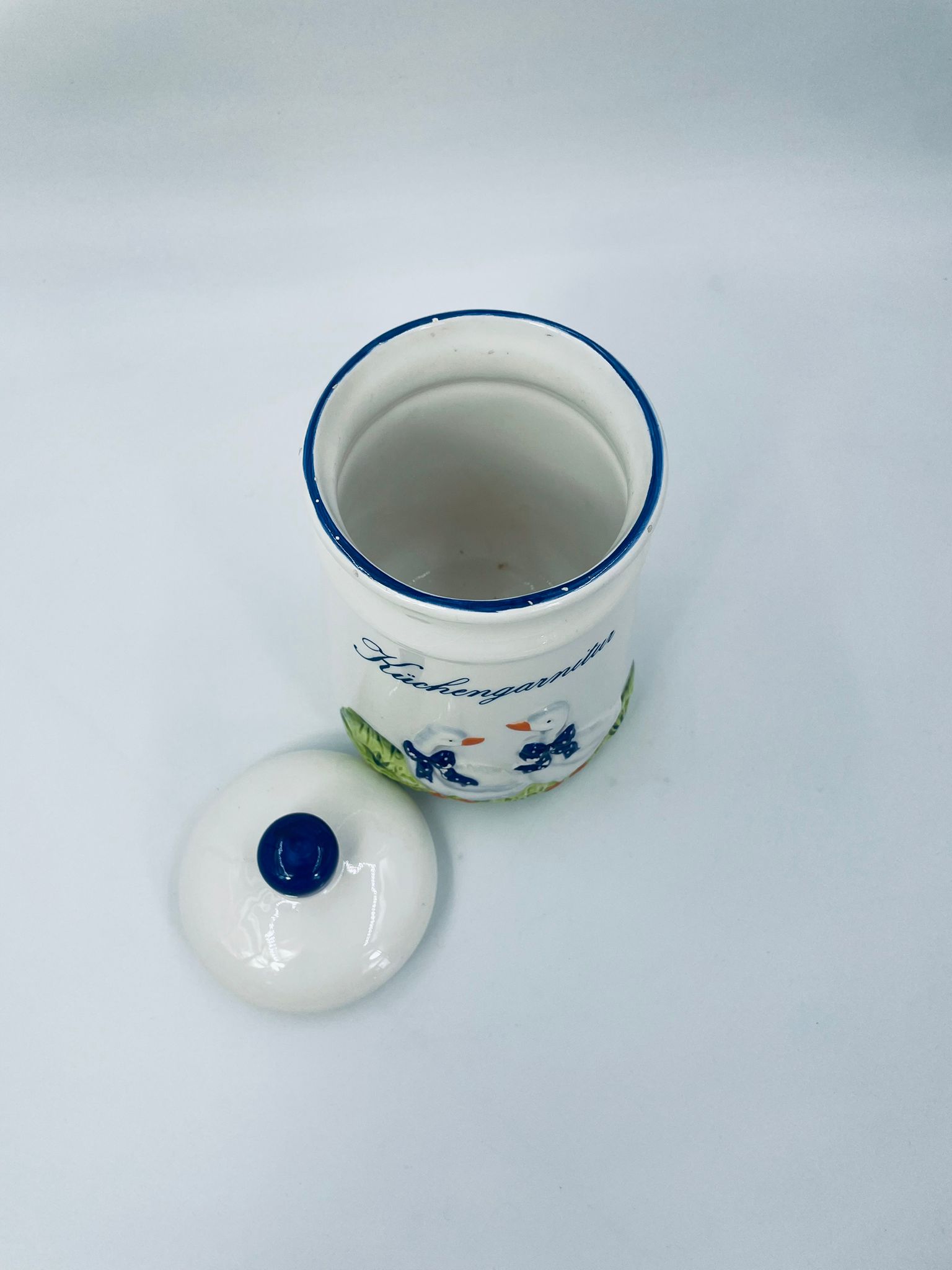 Ceramic container with lid in white with a border in navy blue. The container decorated with a decoration depicting two goose sitting on the grass with blue scarves with white dots. The decorative container can be used for food storage or for trinkets. The container has some cracks on the glaze and small damages on the top rim and on the bows