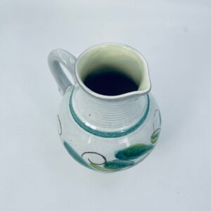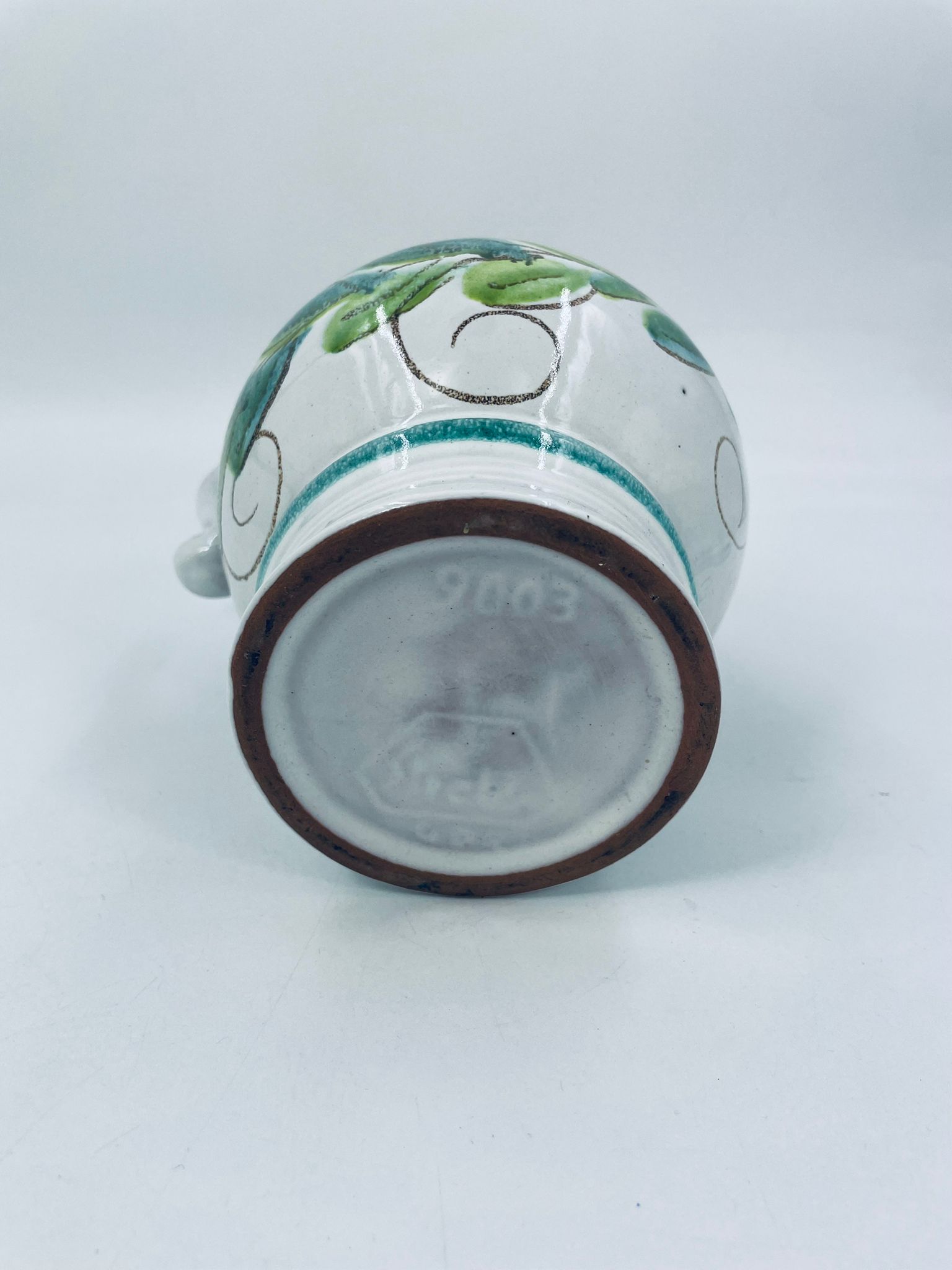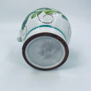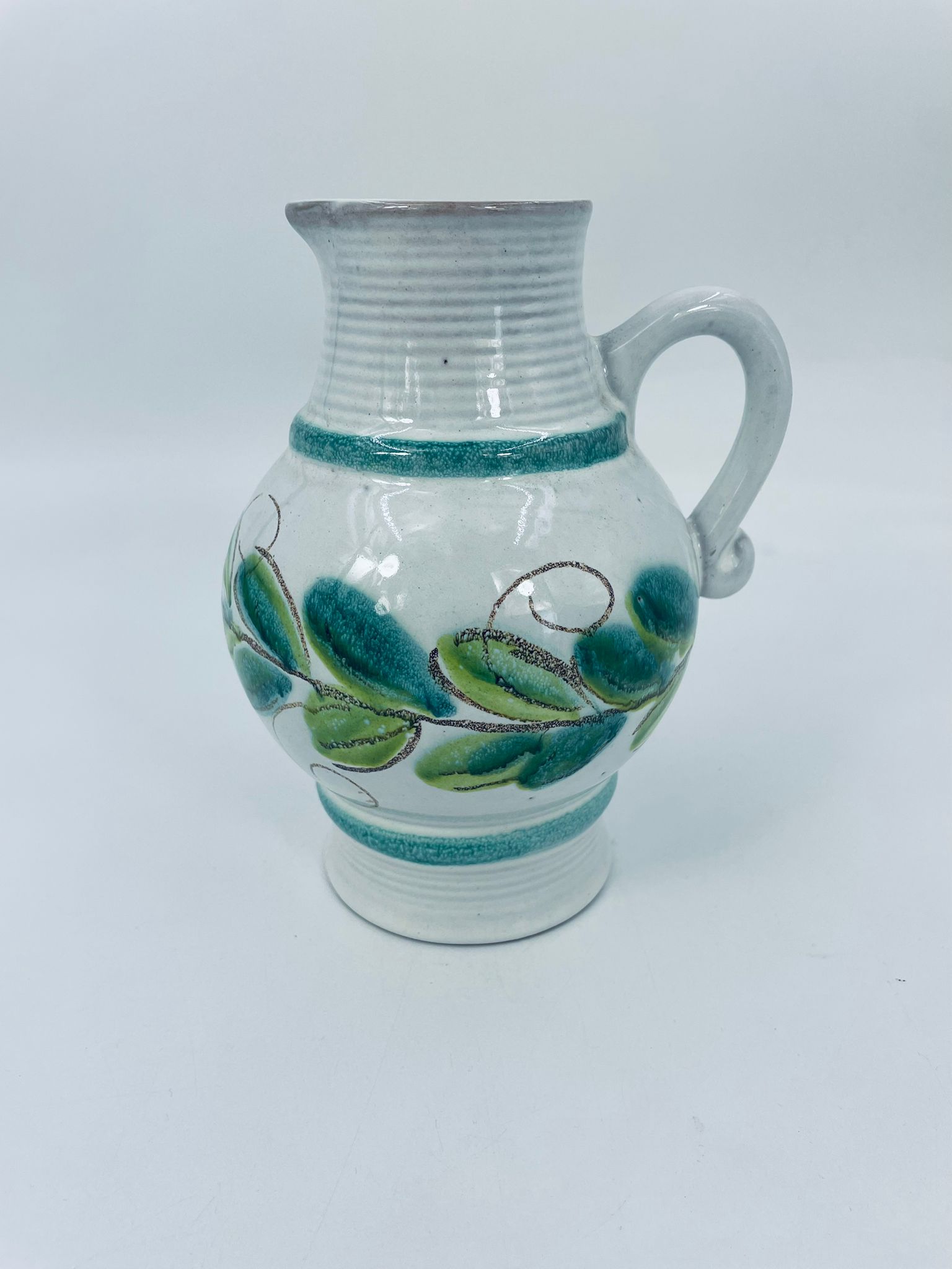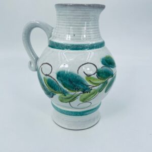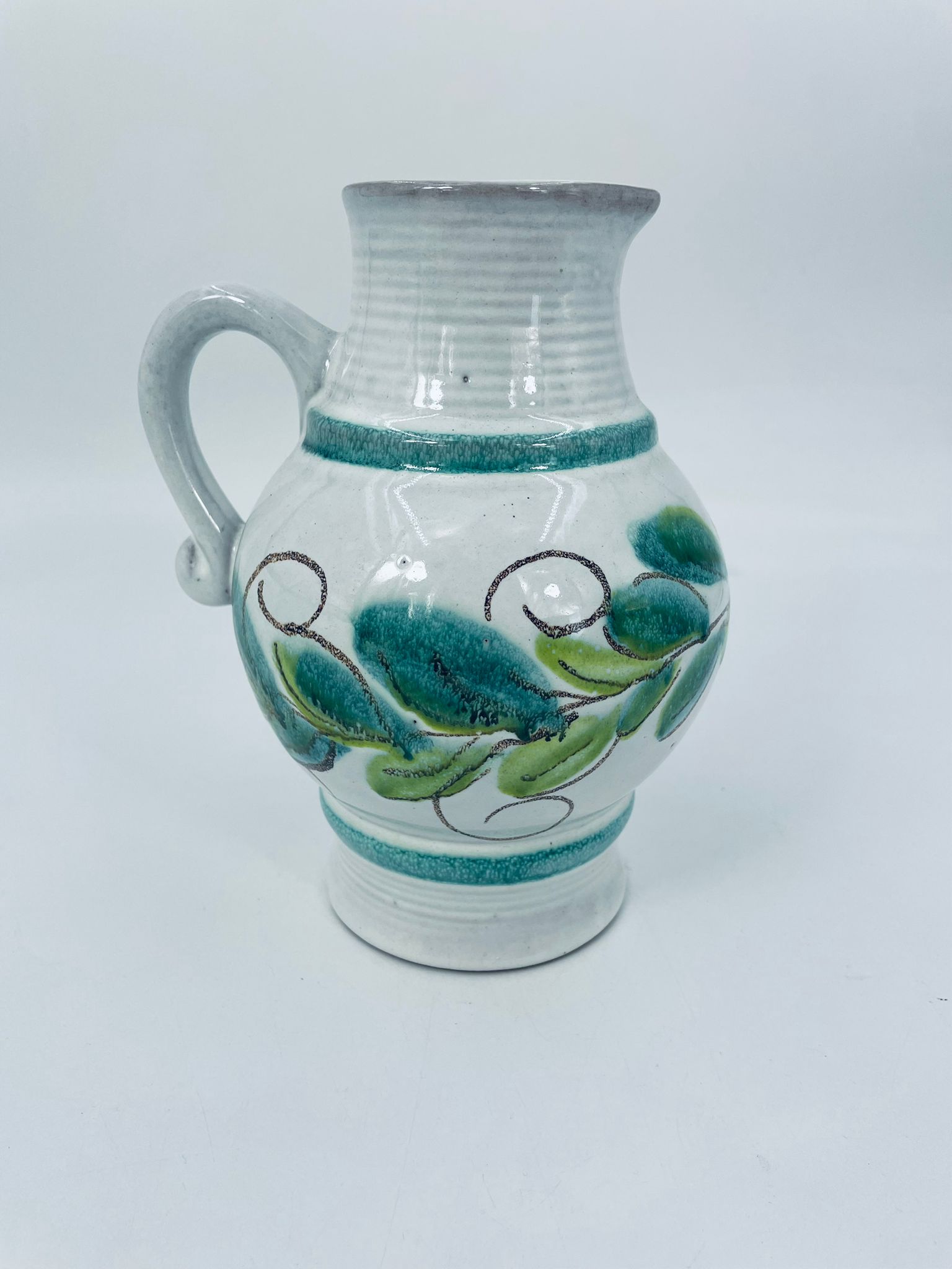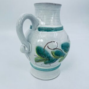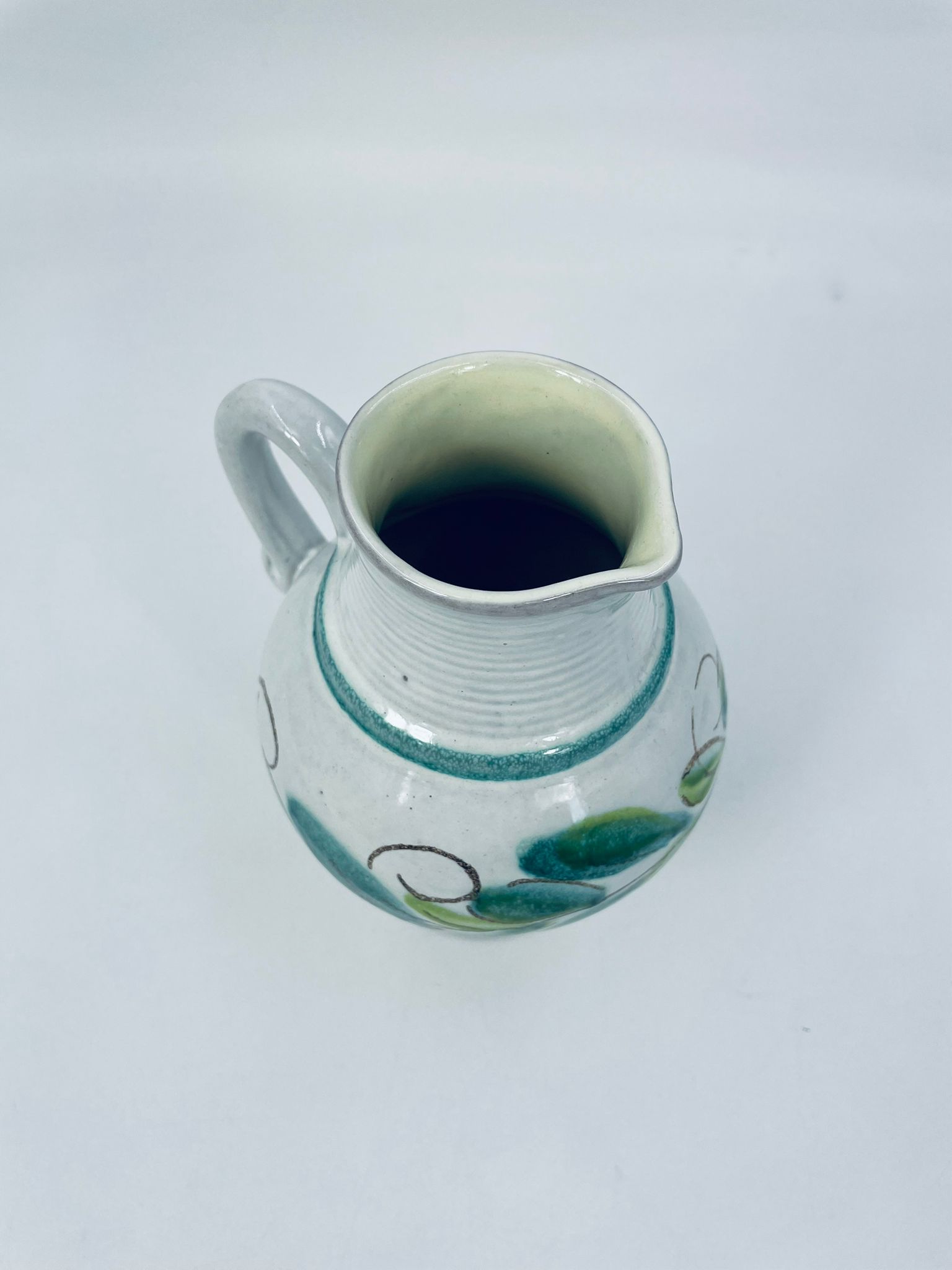 Vintage style ceramic jug, antique. Hand-painted in white, grey, with floral motifs and brown elements imitating vines. The top edge of the jug and the stripes on the body in grey.