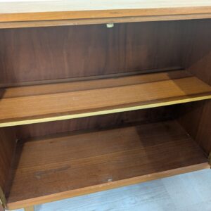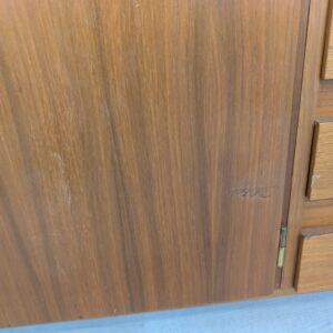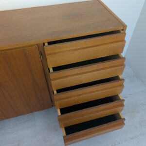 A large vintage-style wooden chest of drawers from the 1960s/70s. It has capacious drawers and lockable cabinets for convenient storage. Solid construction covered in teak veneer which gives it a timeless character. Ideal for the living room or bedroom.