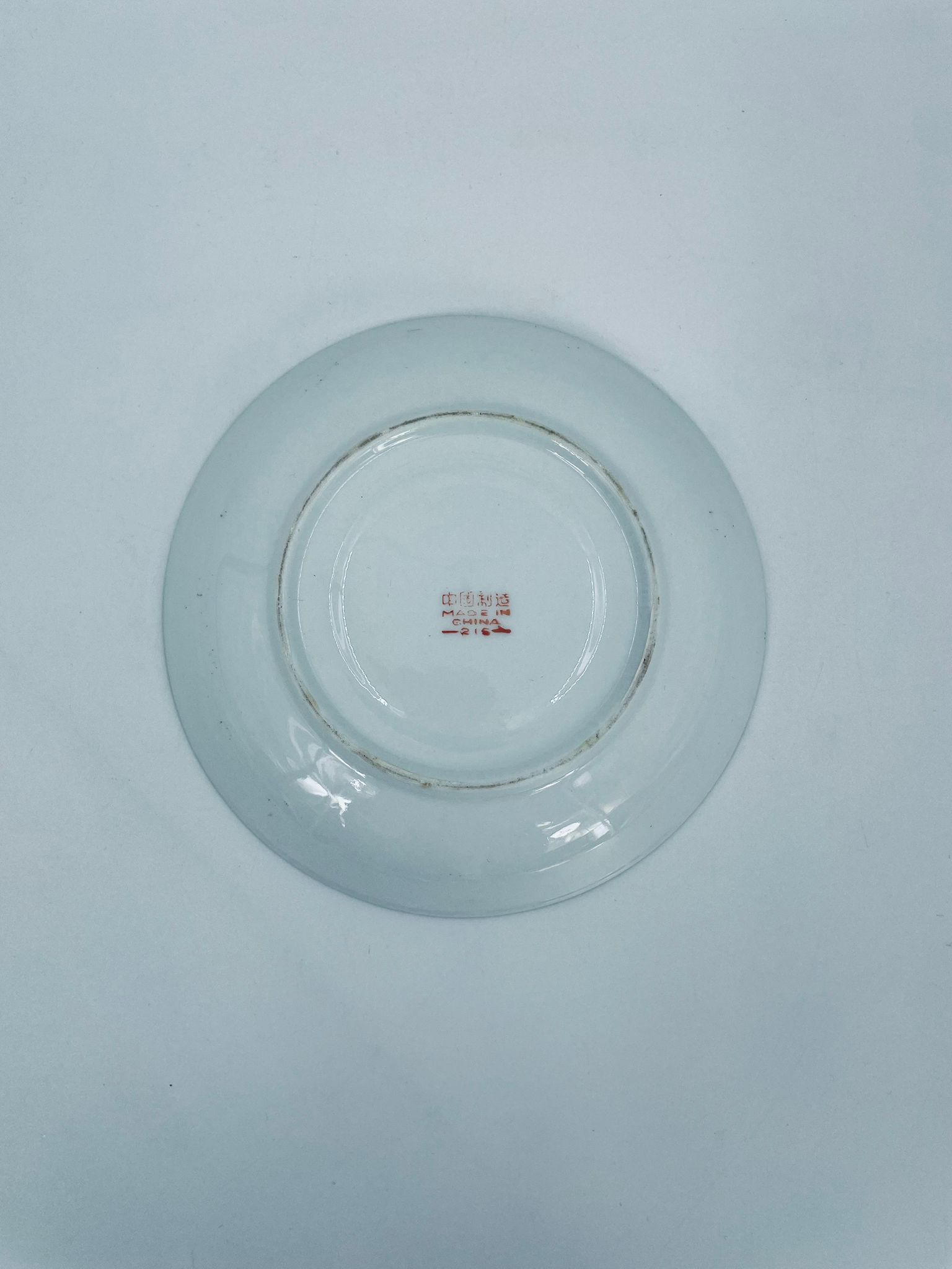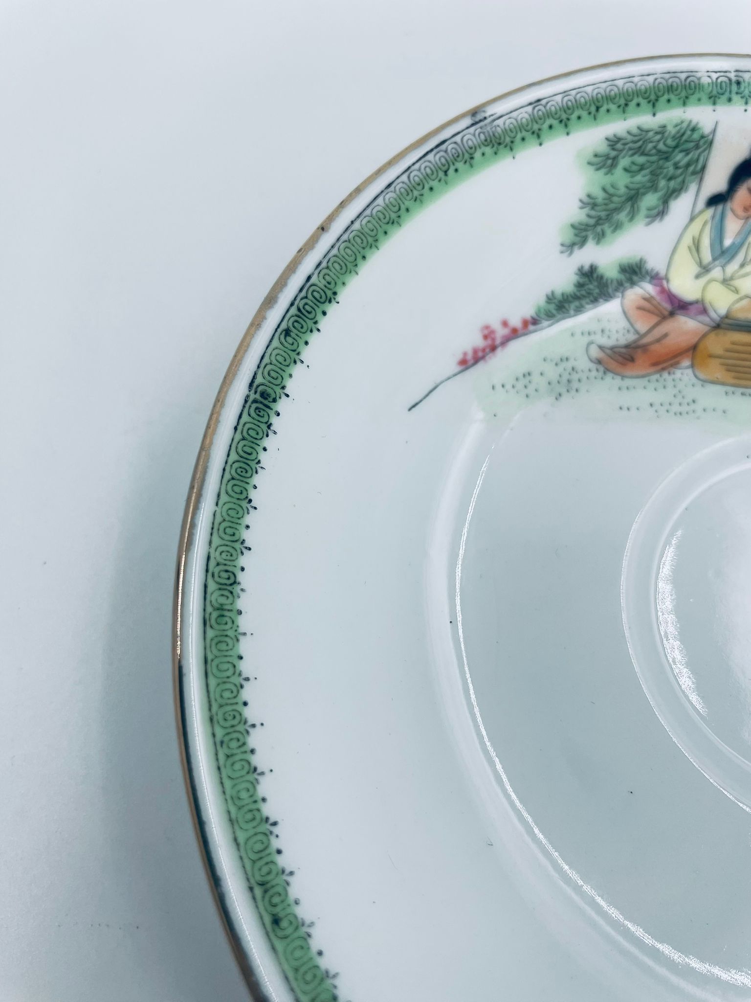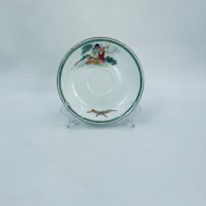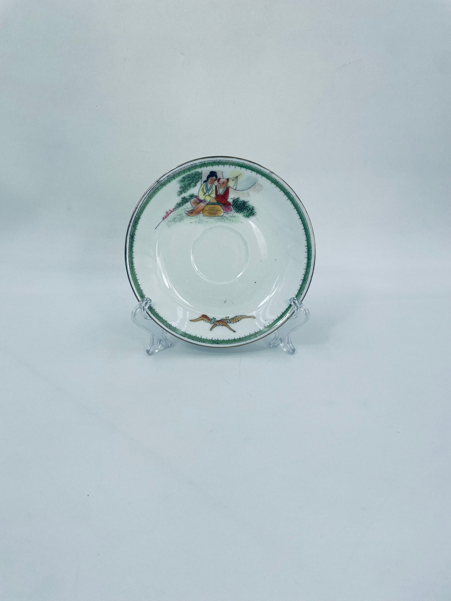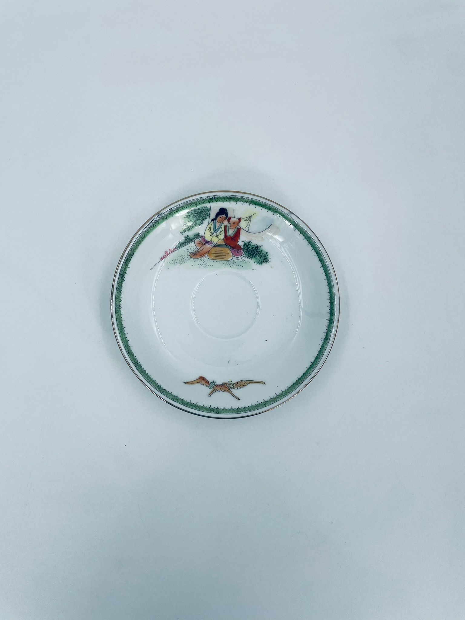 A teacup saucer made of Chinese white porcelain. The saucer is hand-painted with Chinese characters, with a painted geometric pattern on a green background, finished with a gold rim on the rim.