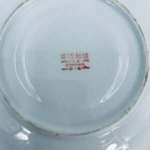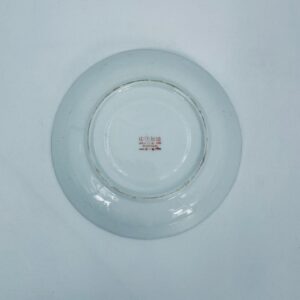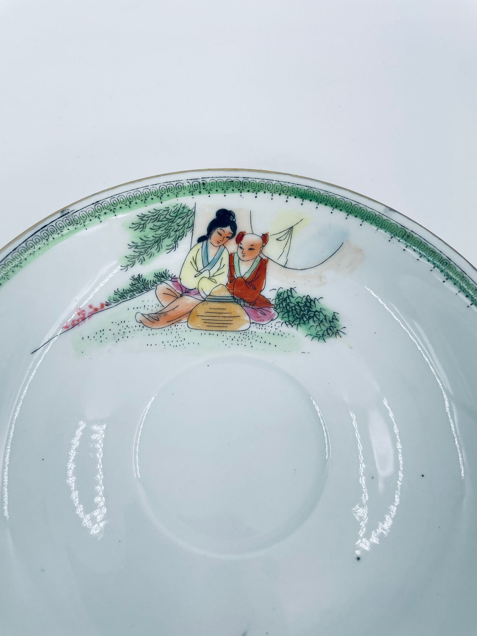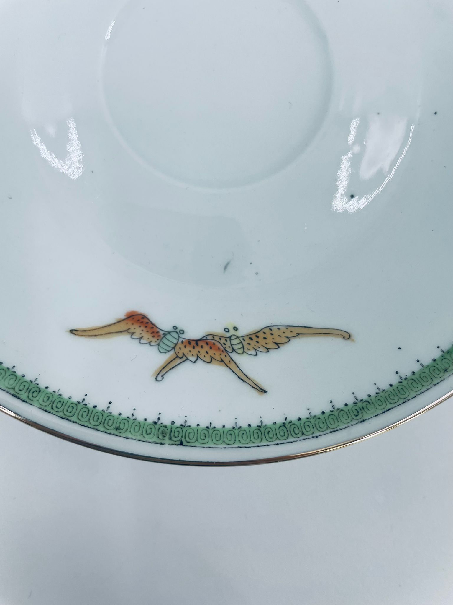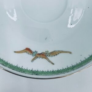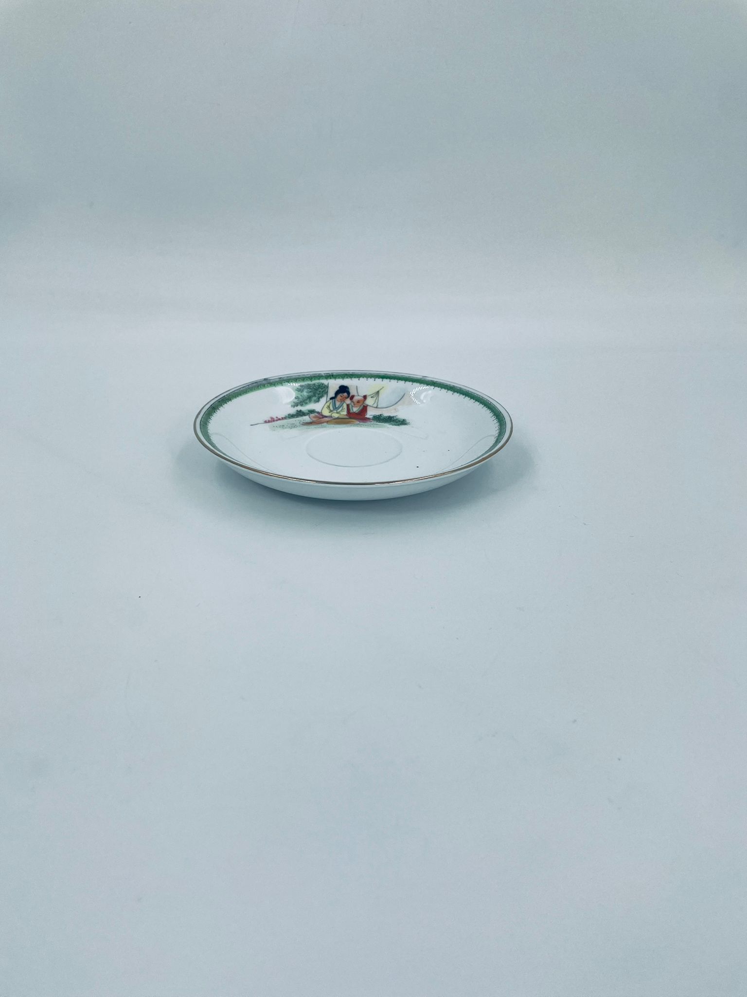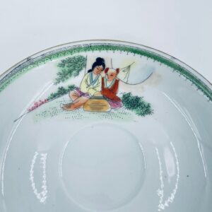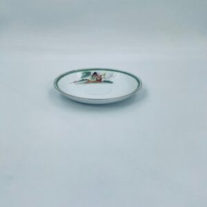 A teacup saucer made of Chinese white porcelain. The saucer is hand-painted with Chinese characters, with a painted geometric pattern on a green background, finished with a gold rim on the rim.