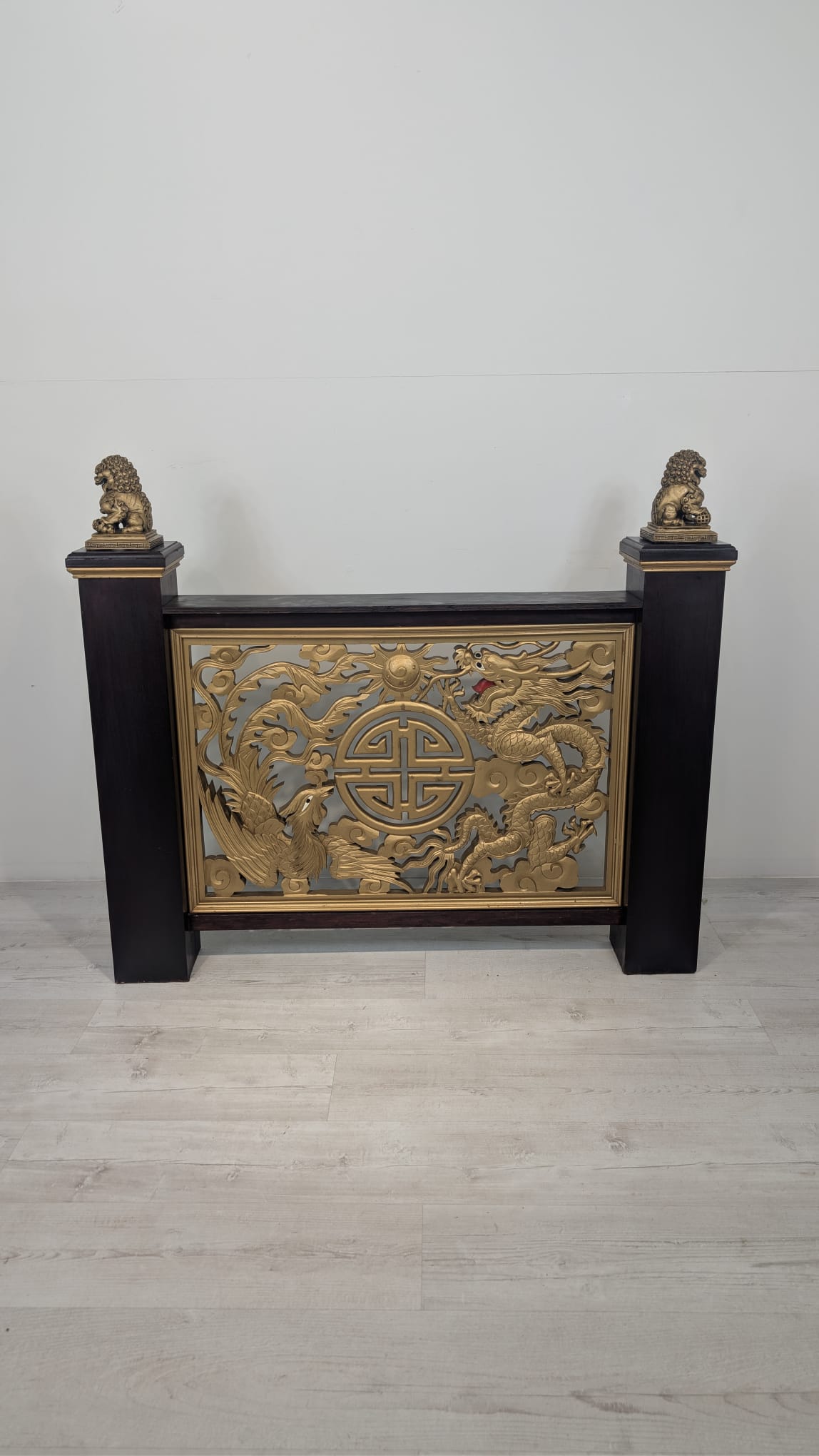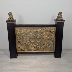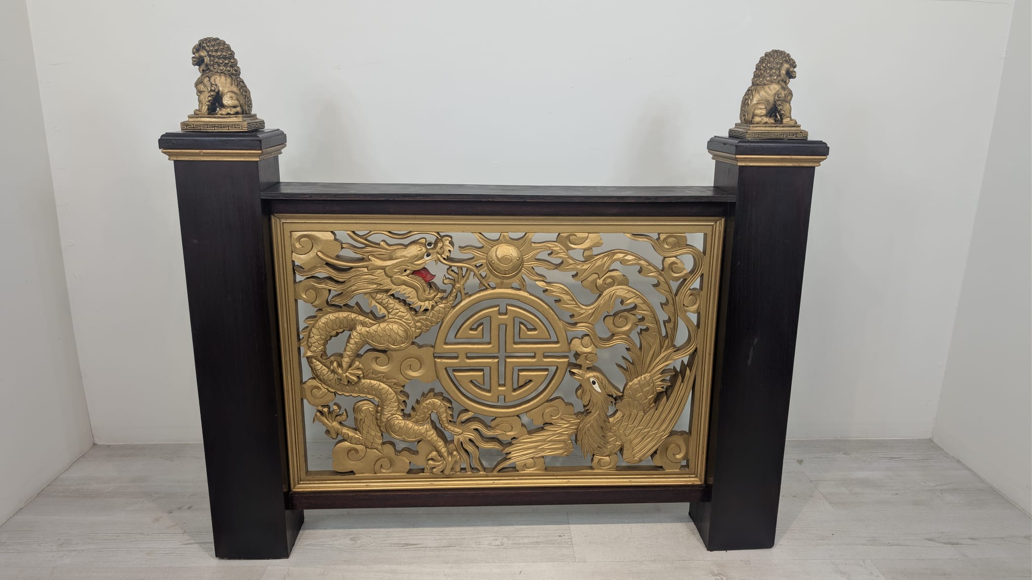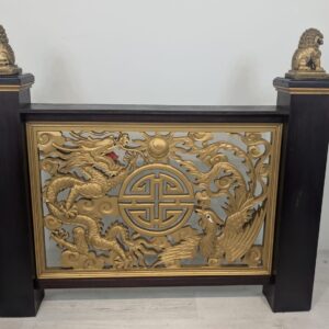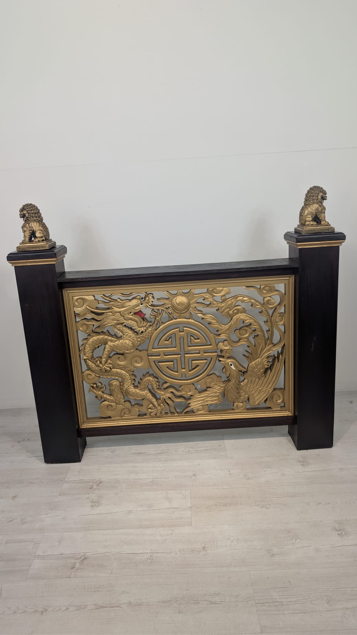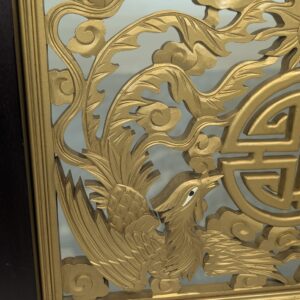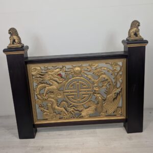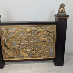 Elegancki chiński panel podłogowy z rzeźbionymi złotymi smokami i feniksami na czarnej podstawie. Piękny, tradycyjny wzór z symbolami szczęścia i pomyślności. Doskonała dekoracja do wnętrza w stylu azjatyckim.
