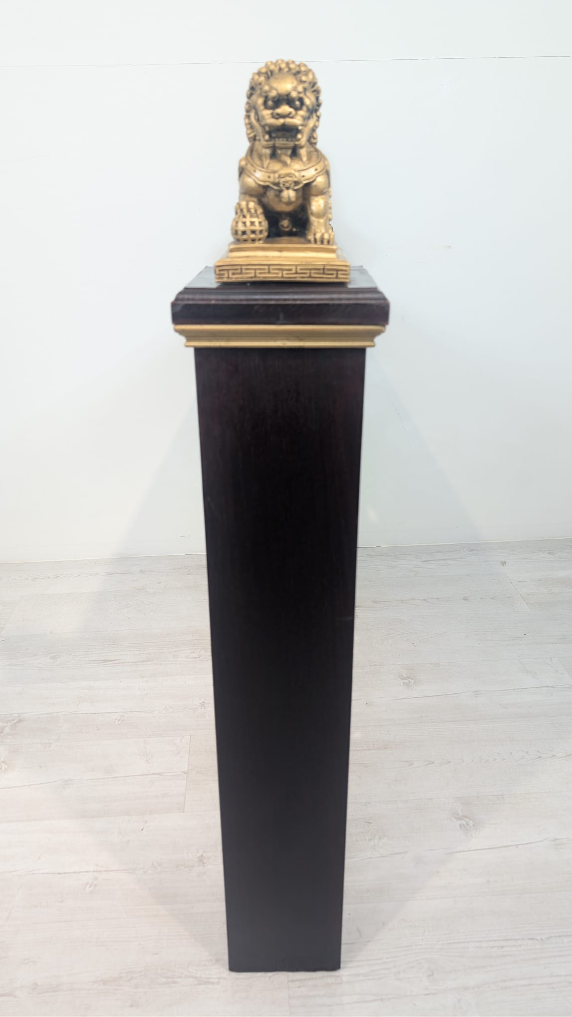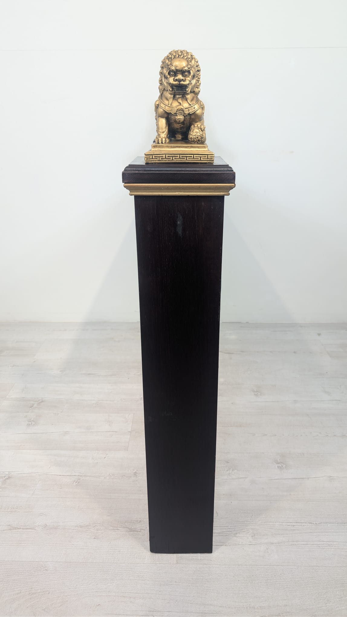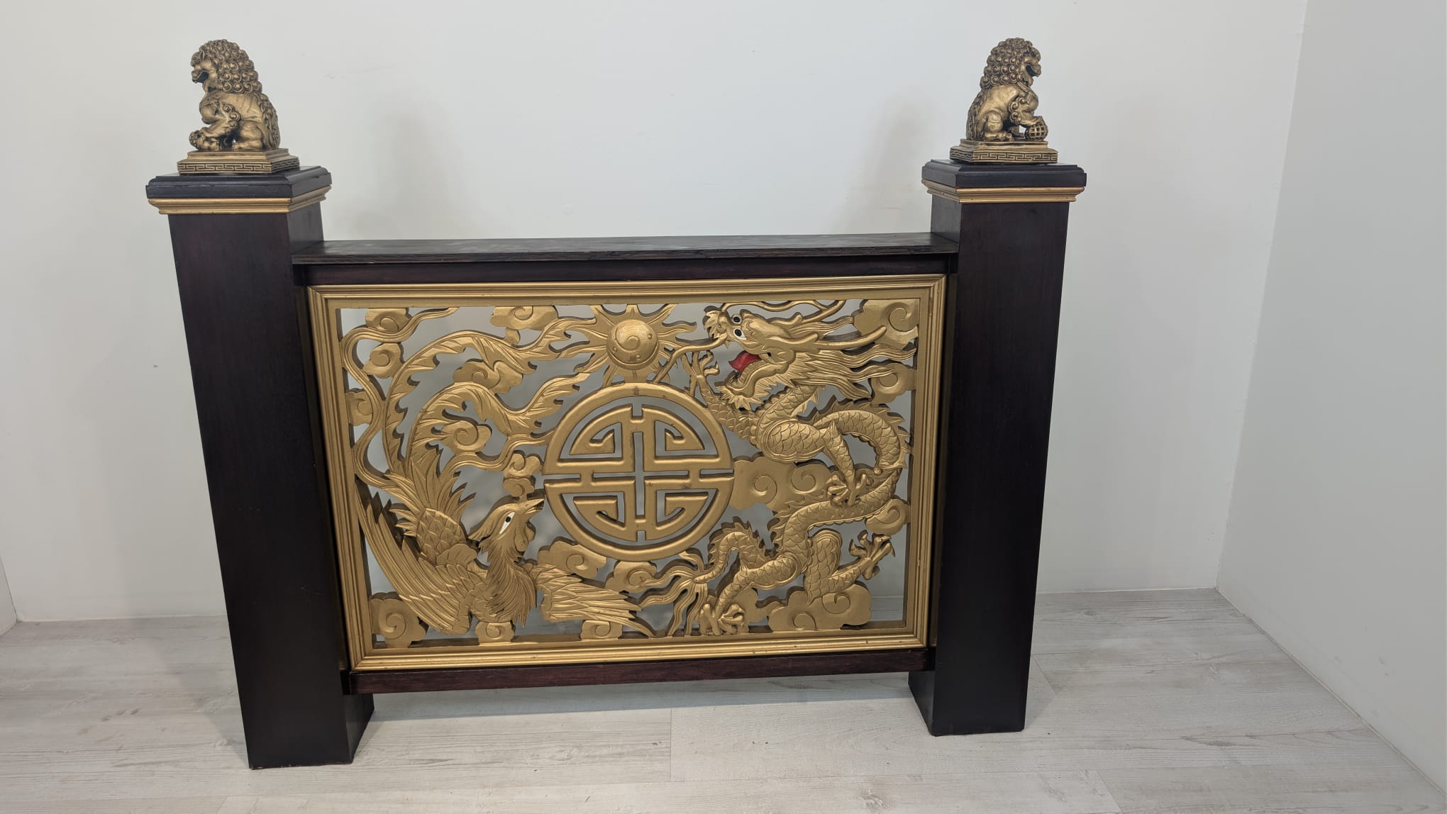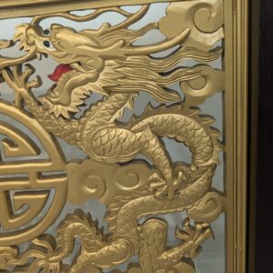 Elegancki chiński panel podłogowy z rzeźbionymi złotymi smokami i feniksami na czarnej podstawie. Piękny, tradycyjny wzór z symbolami szczęścia i pomyślności. Doskonała dekoracja do wnętrza w stylu azjatyckim.