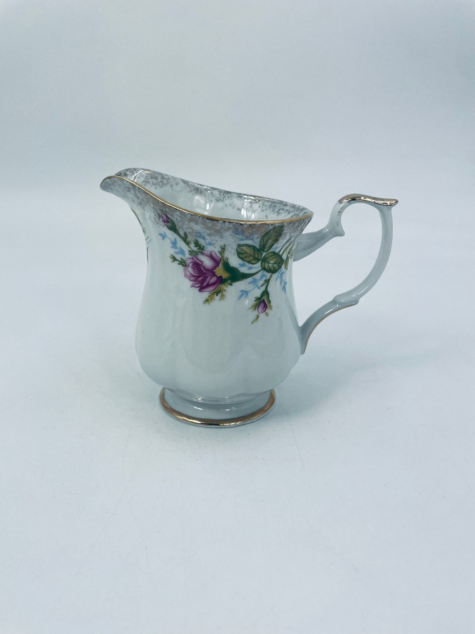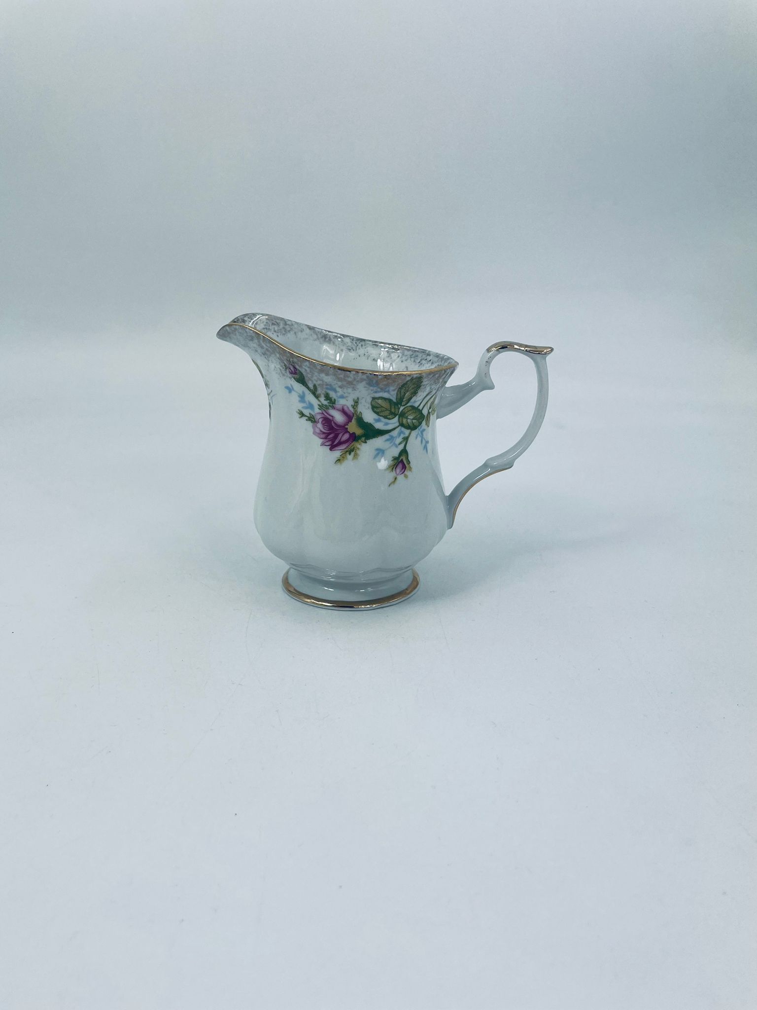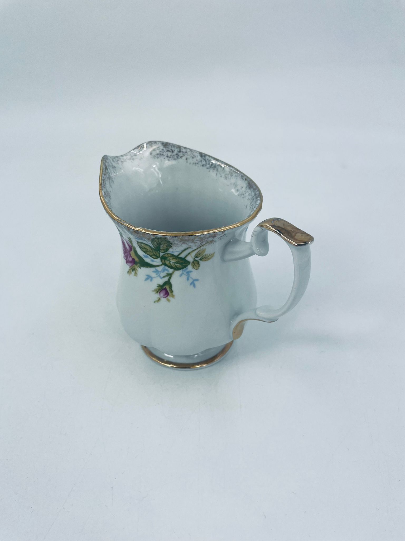 Milk jug by the Polish porcelain factory Chodzież, cut Iwona golden rose. Milk jug made of high quality white porcelain with a distinctive stylish decoration of beautiful burgundy roses with green branches. The pitcher is richly decorated and finished with gilding. It has rubbing on the gilding.