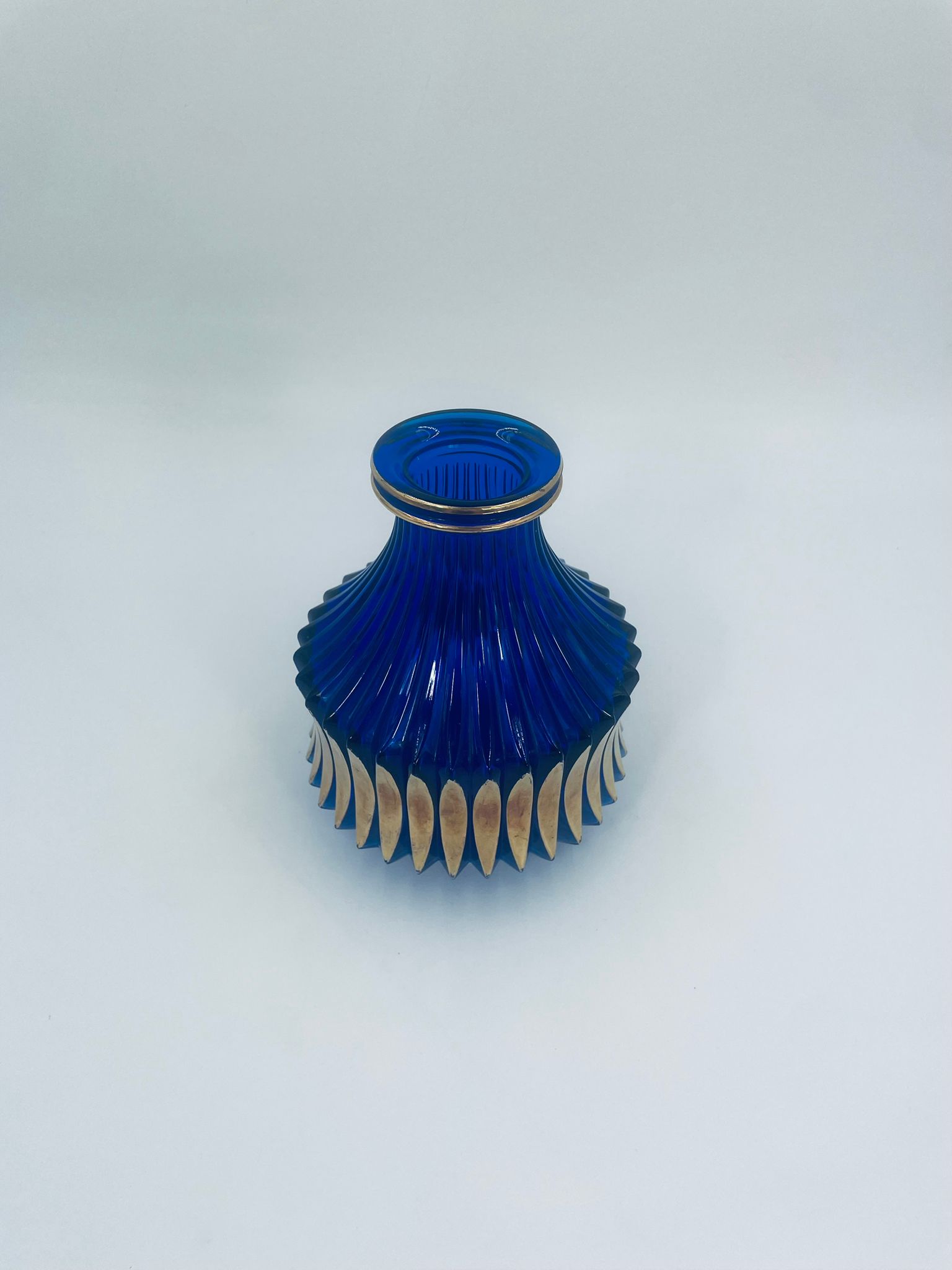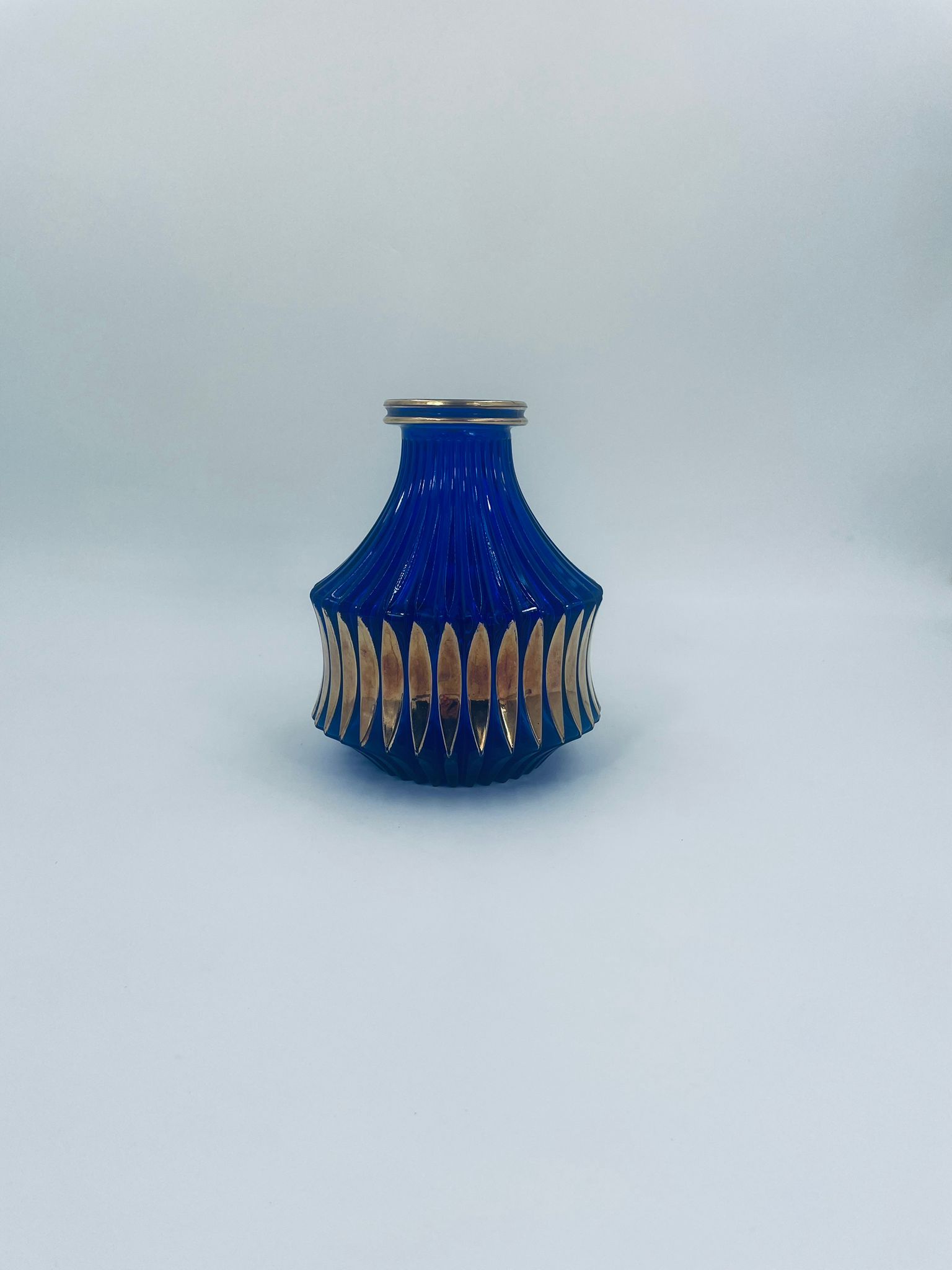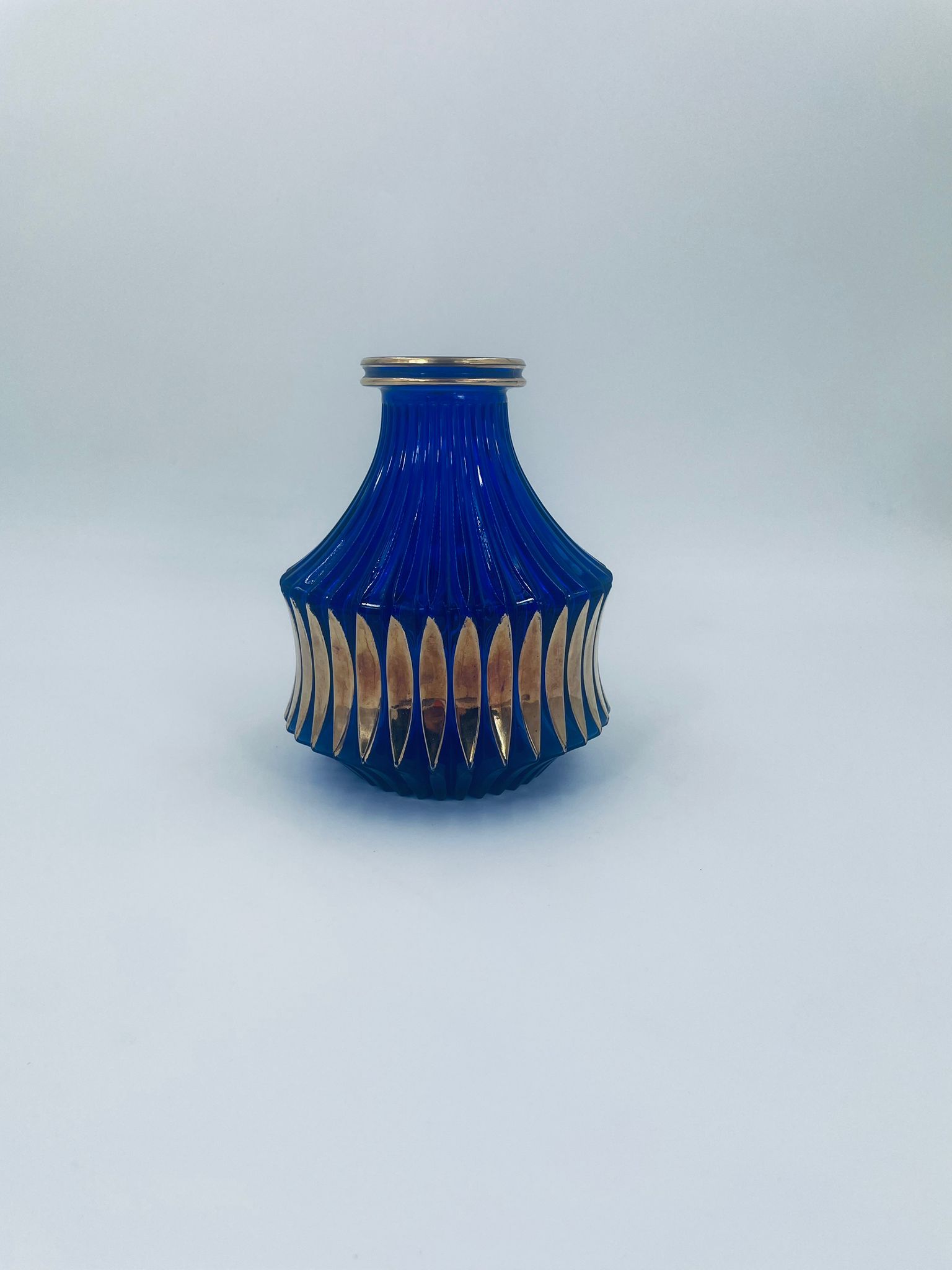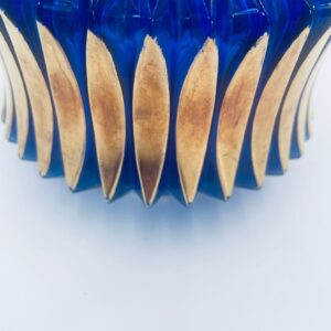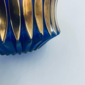 Vintage style decorative vase, made of cobalt art glass. It features vertical fluting and gold decoration. It has delicate rubbing on the gilding and damage.