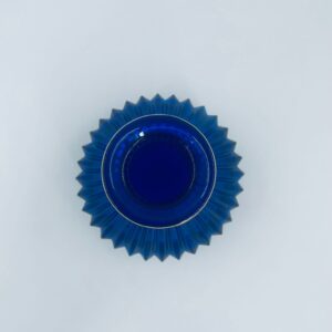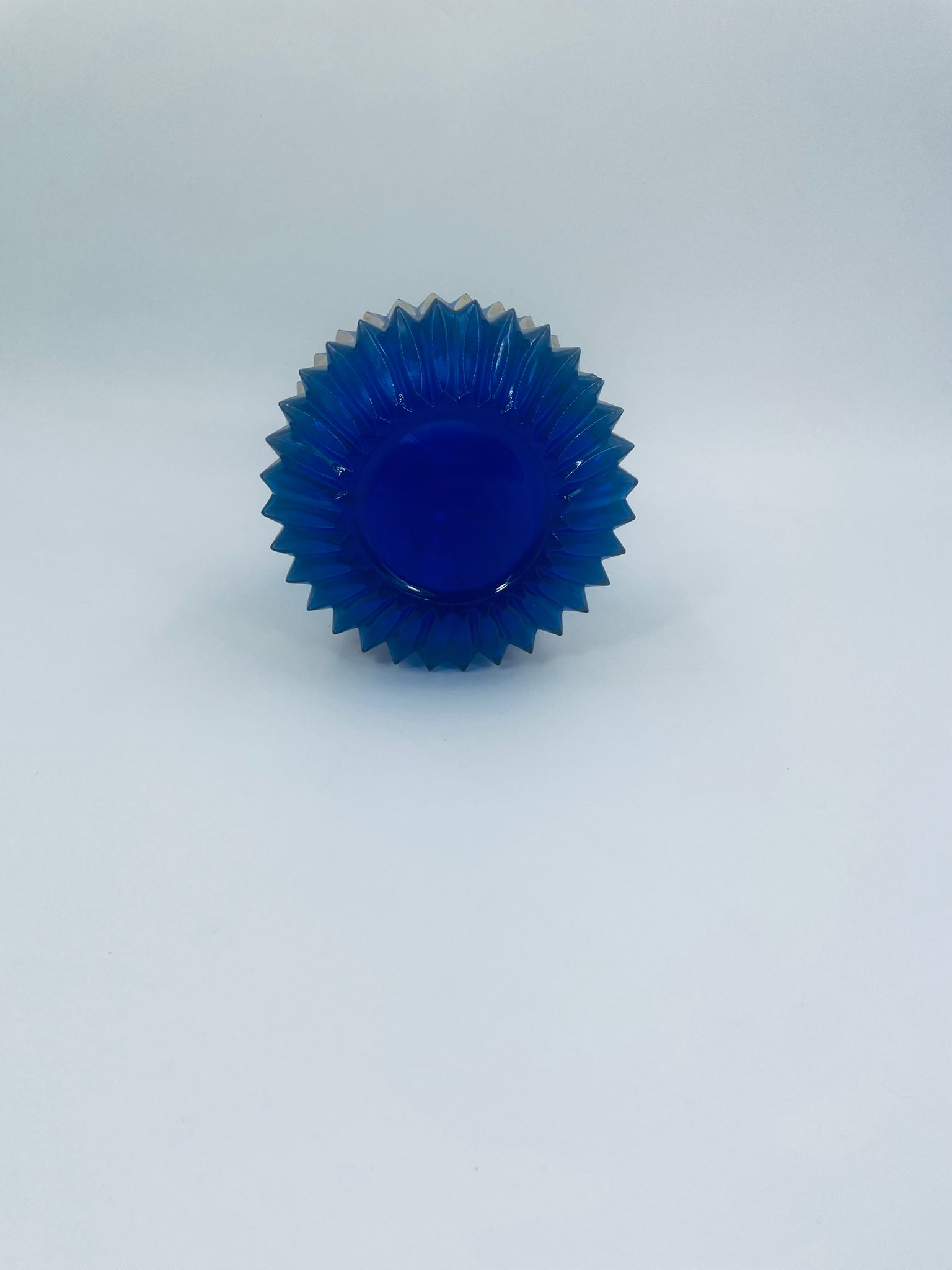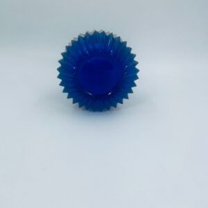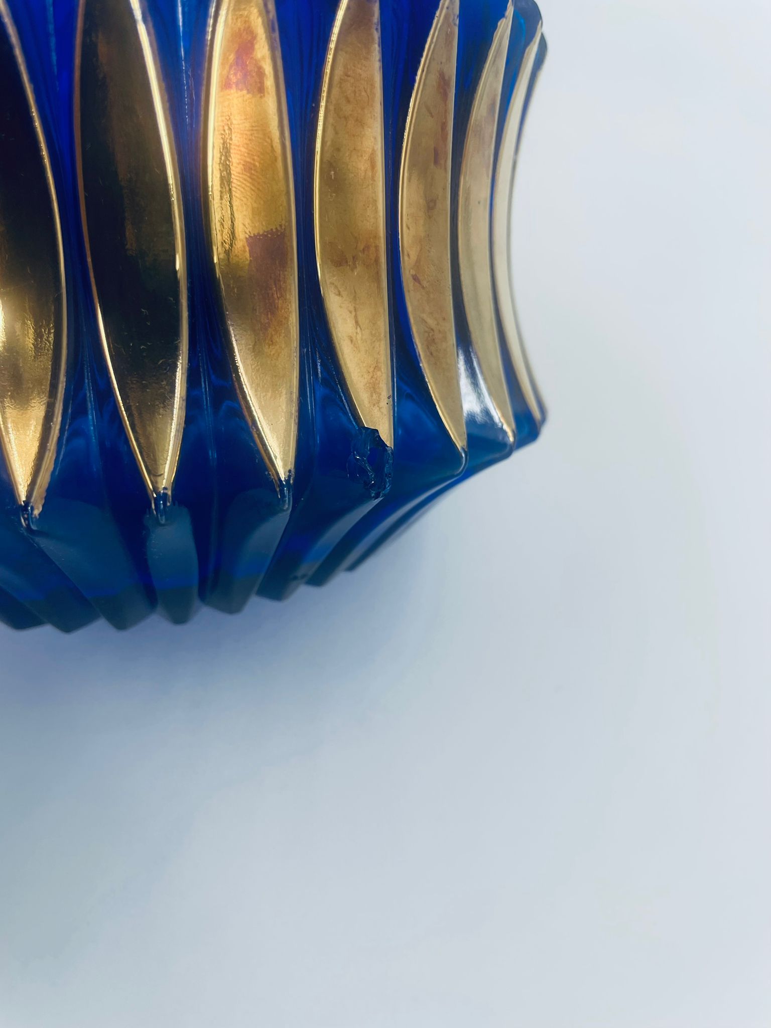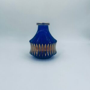 Vintage style decorative vase, made of cobalt art glass. It features vertical fluting and gold decoration. It has delicate rubbing on the gilding and damage.