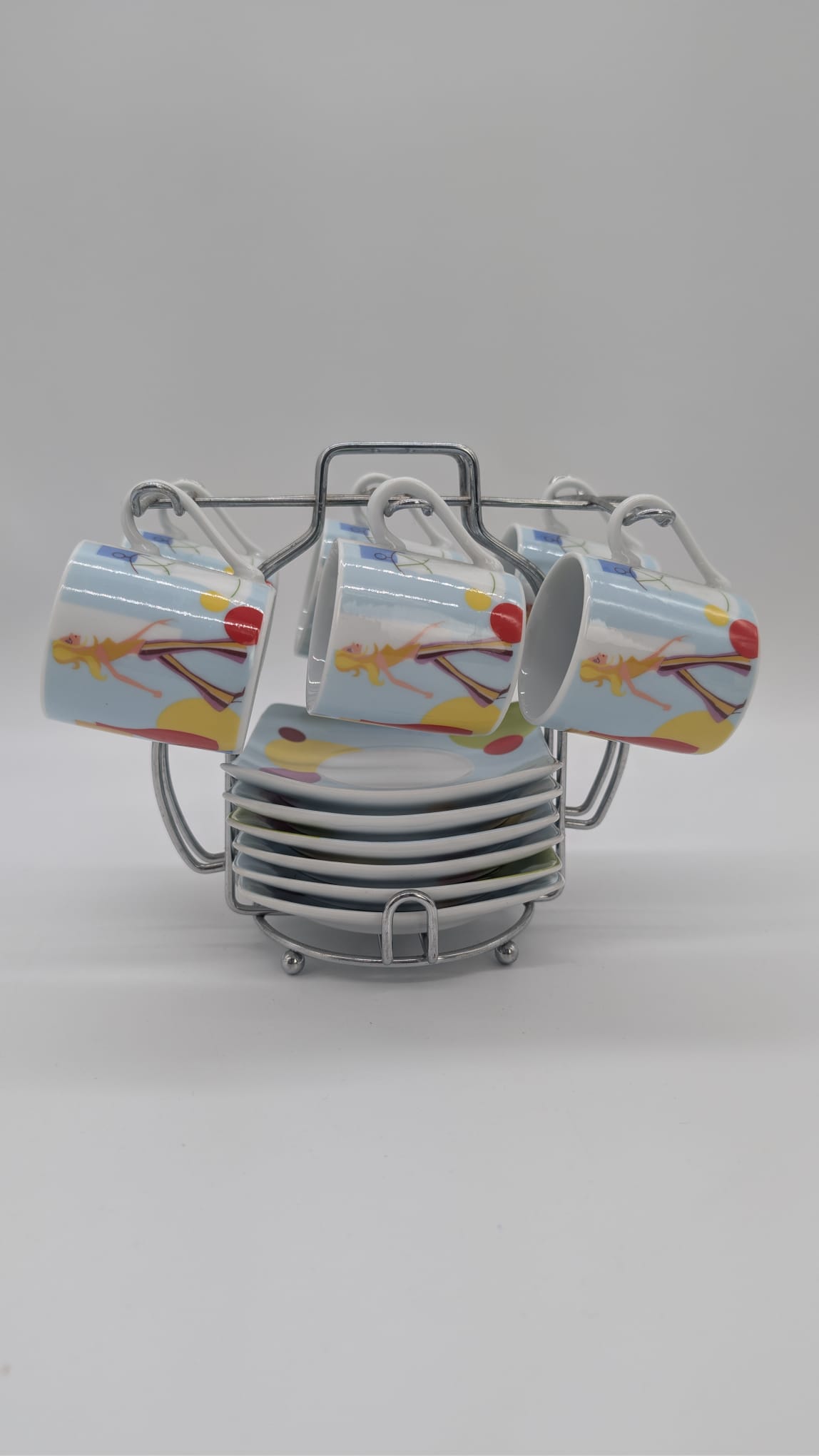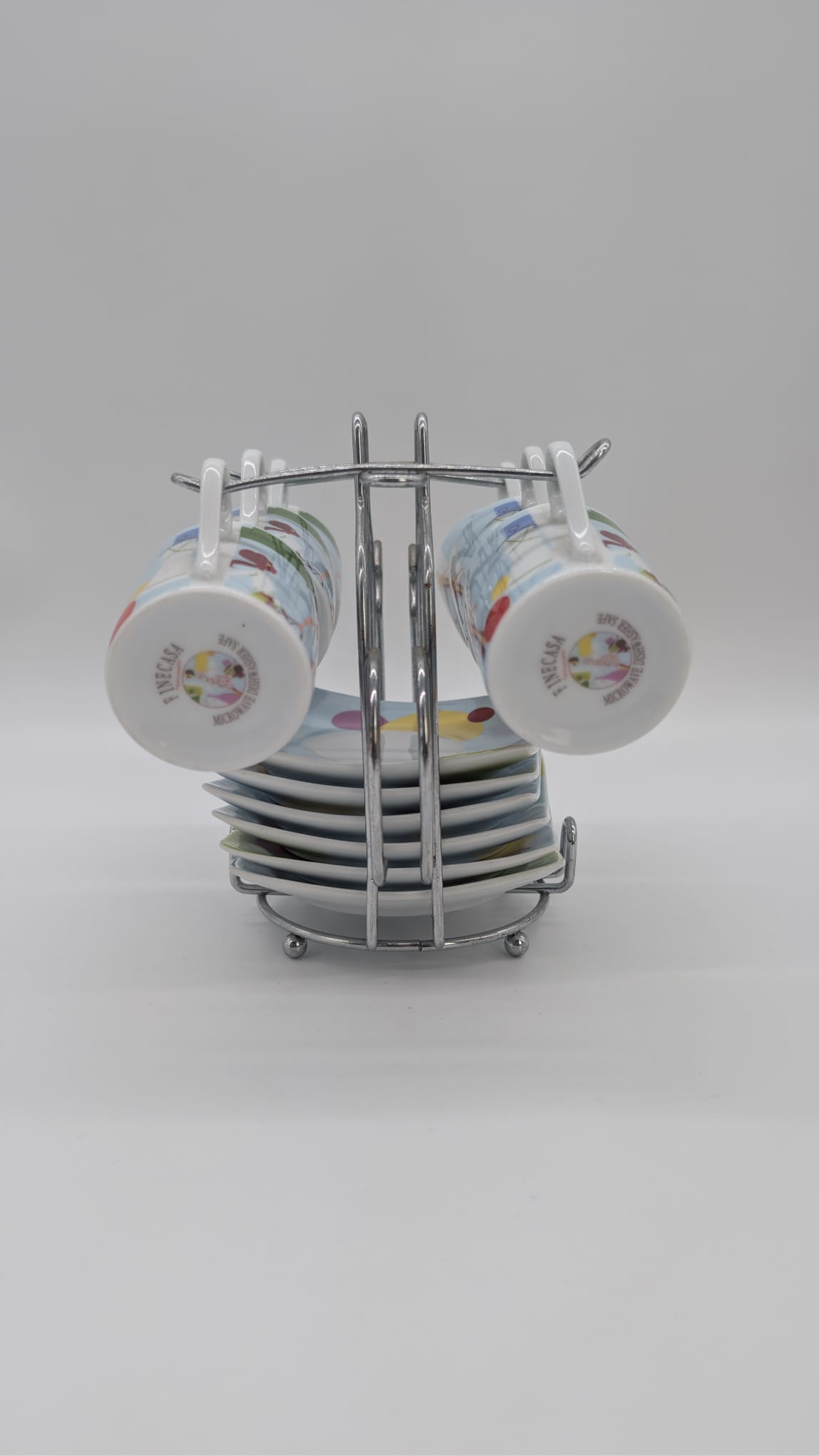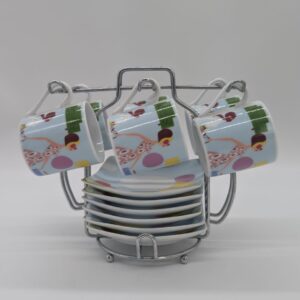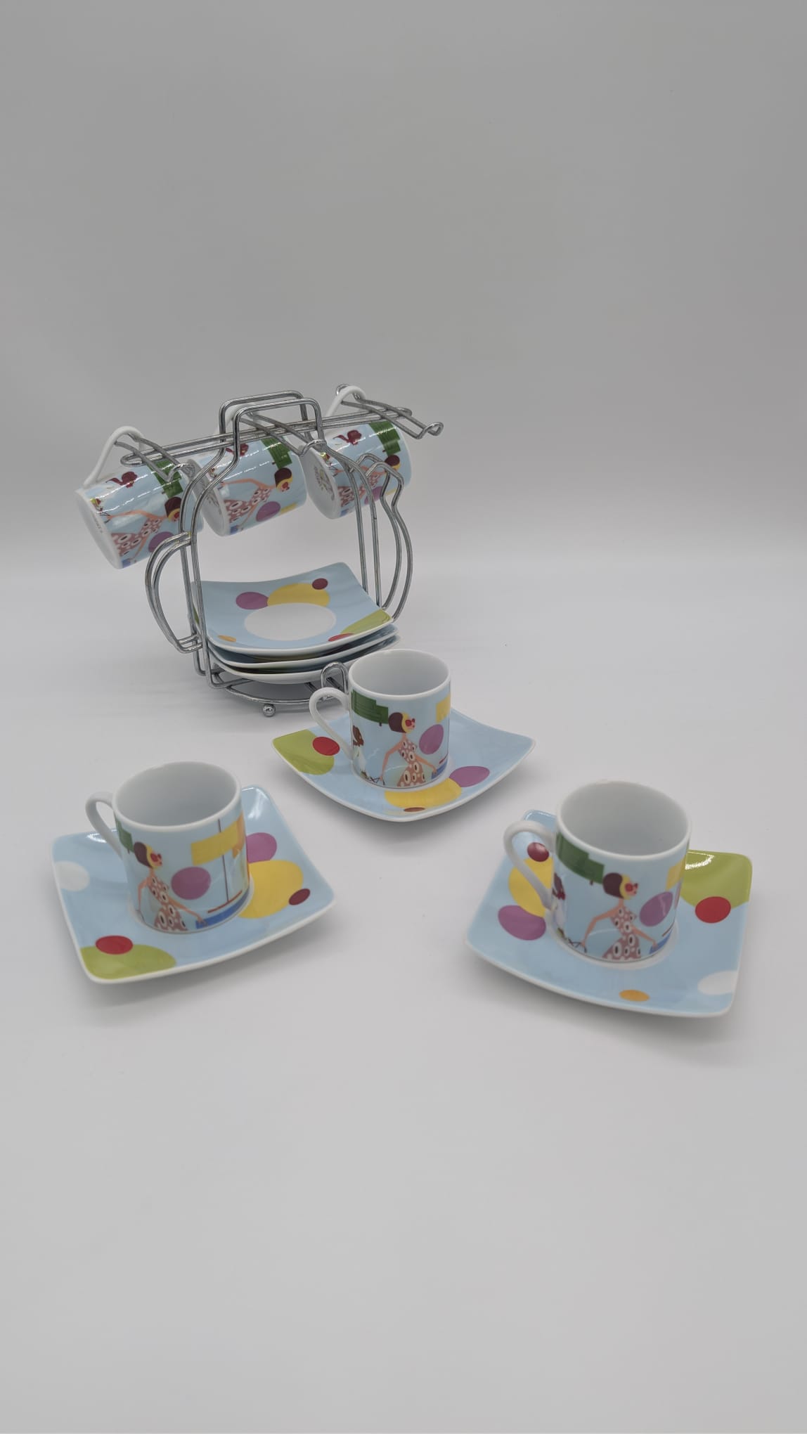 Elegant coffee set for 6 people on an espresso stand. Porcelain mug with colourful patterns, ideal for everyday use or as a gift.