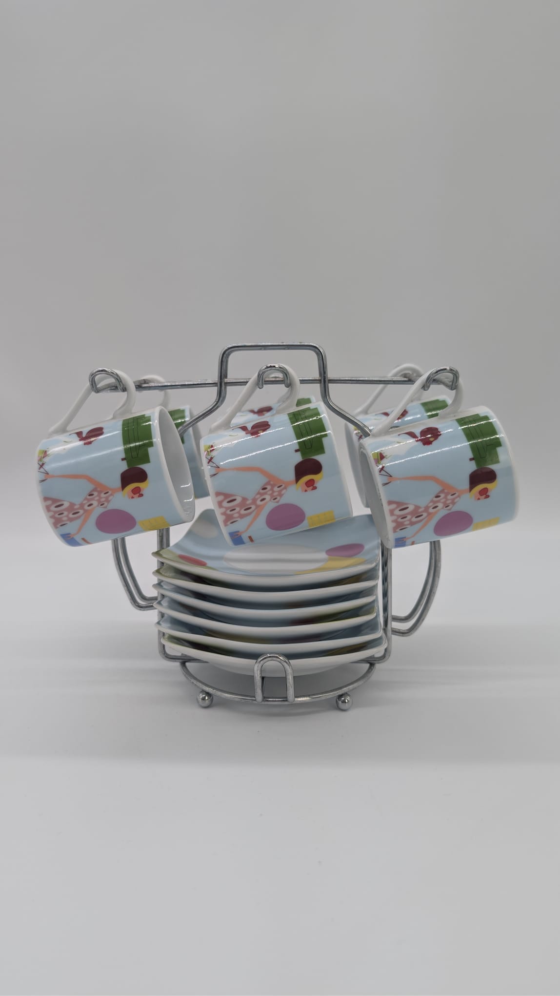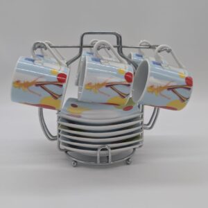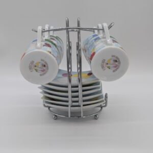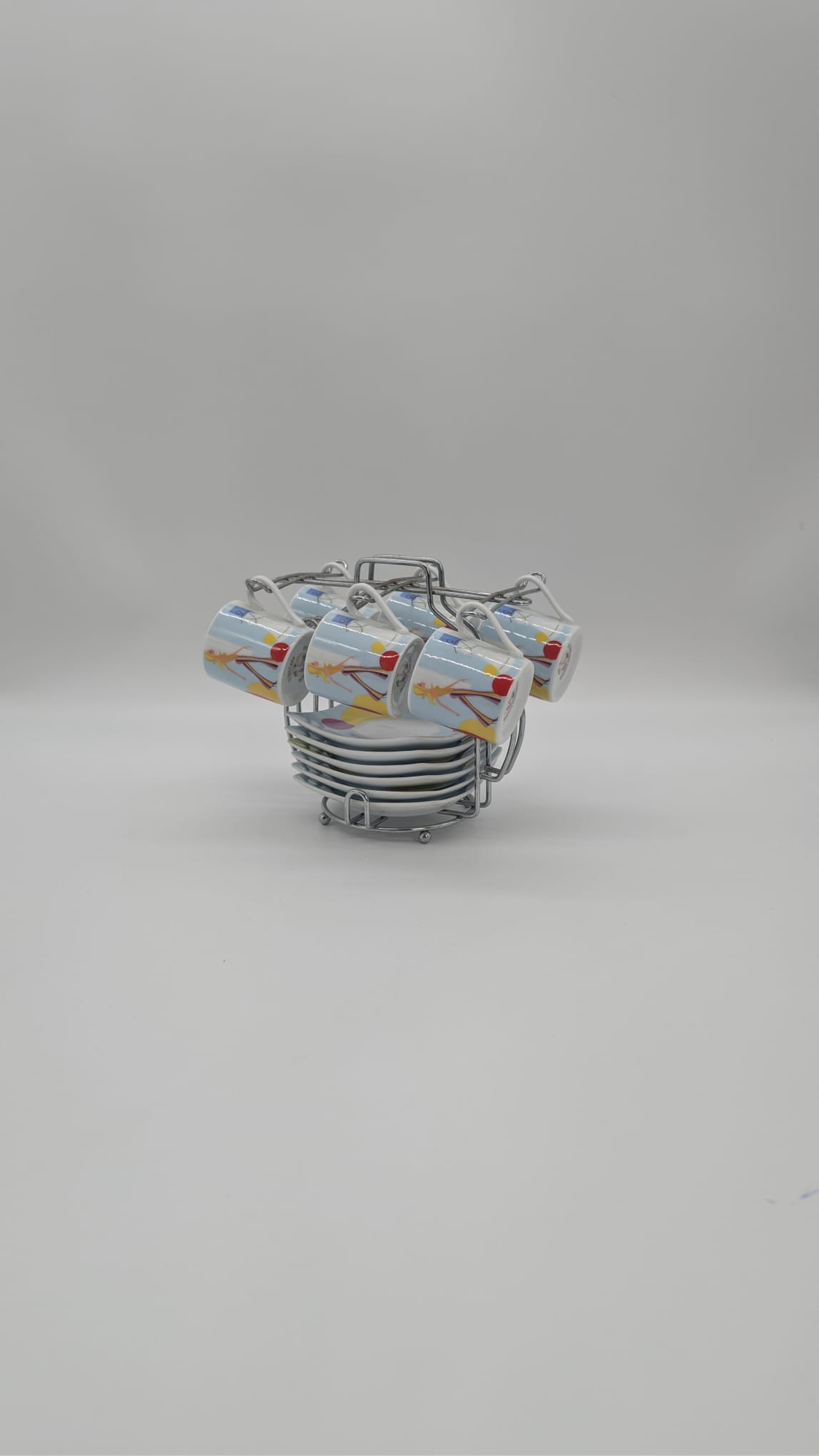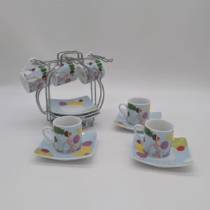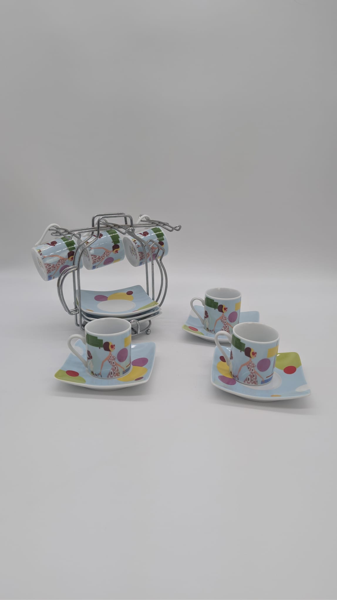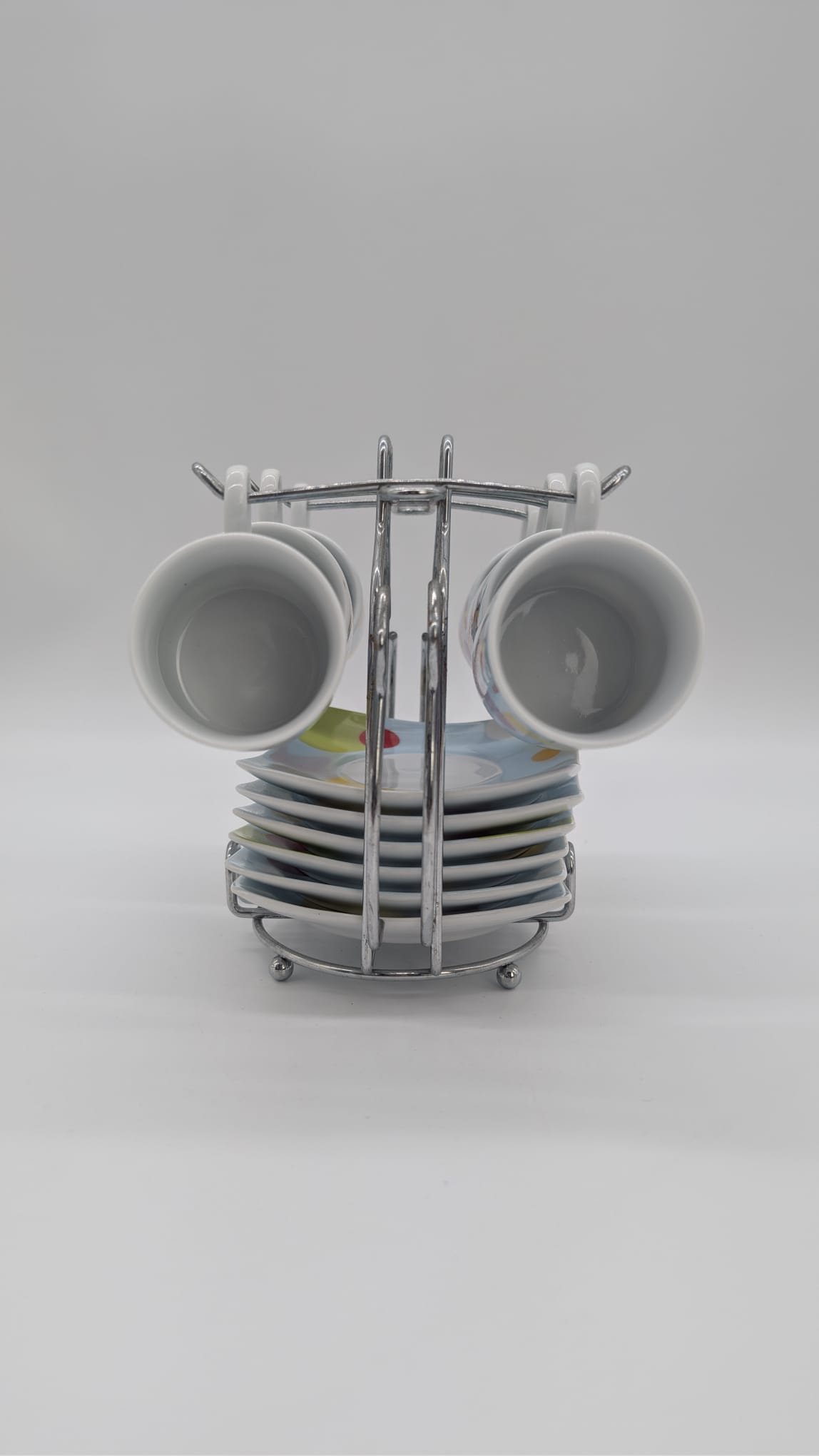 Elegant coffee set for 6 people on an espresso stand. Porcelain mug with colourful patterns, ideal for everyday use or as a gift.