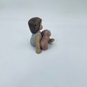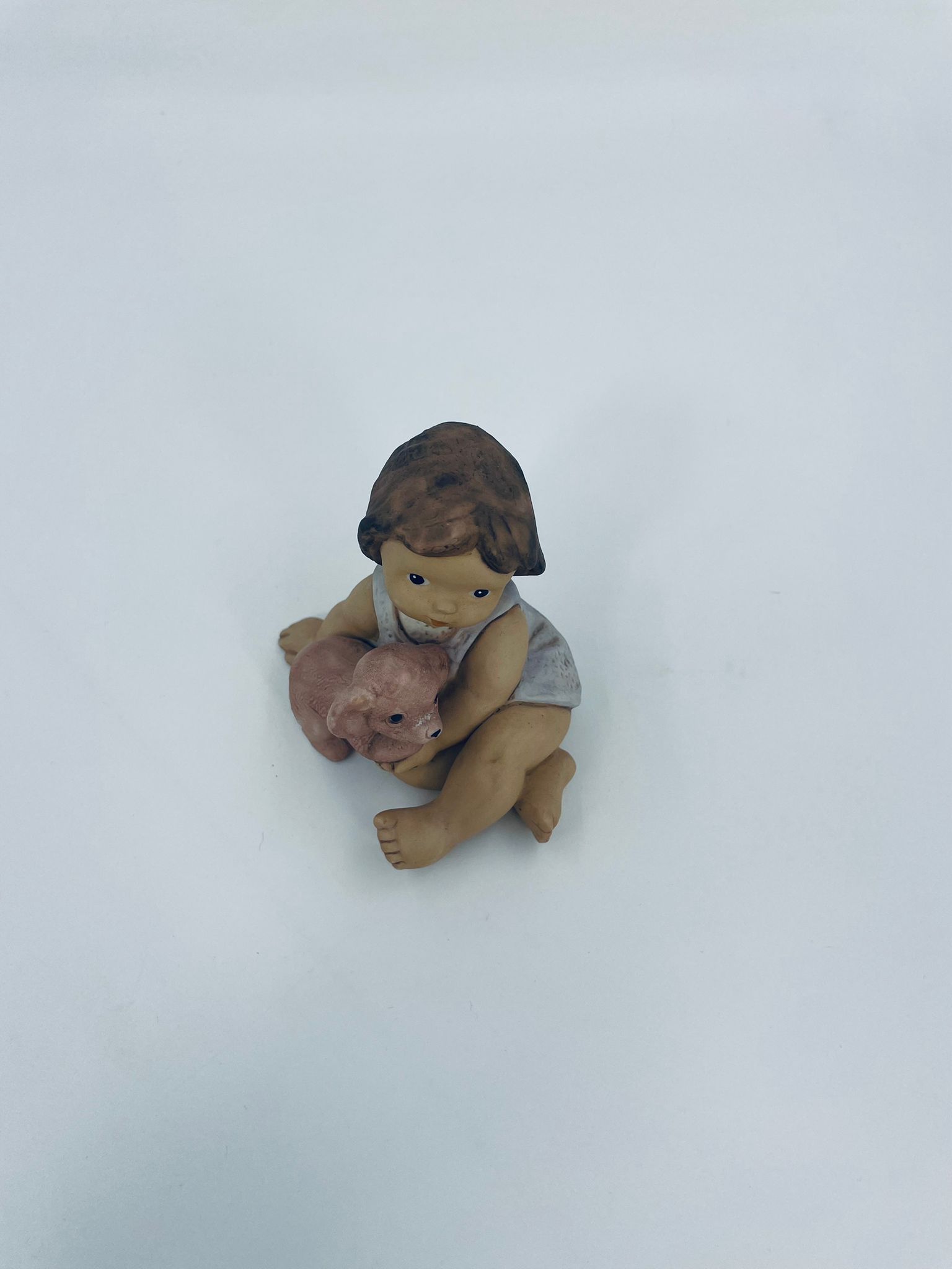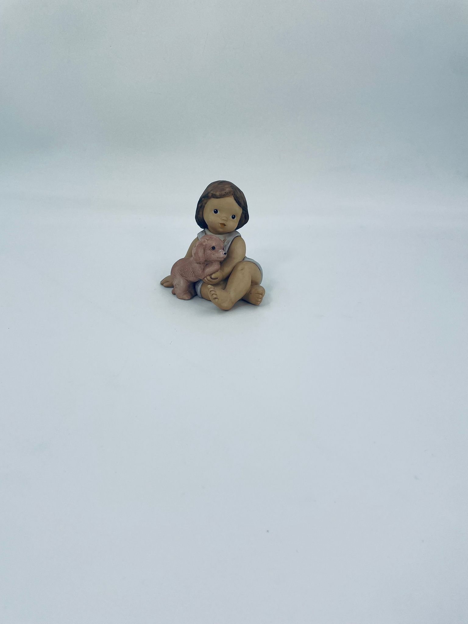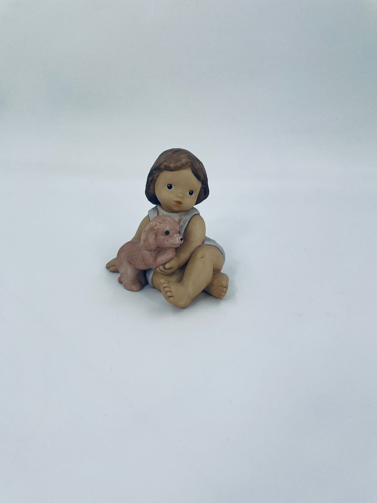 Decorative figurine by Goebel Nina Marco, made of porcelain. The figurine depicts a smiling girl, seated, holding a small dog.