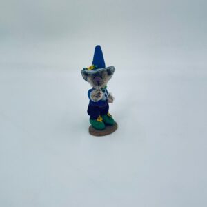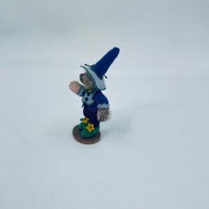 Mr. Munchkin collectible figurine from the Oz 2 collection , by Deb Canhan Artist Designs. The figurine was designed by Laurie Sasaki, the Oz collection was released in two sets of 6pcs , Mr Munchkin is part of the second set. the blonde mohair bear has dark purple suede clothing, a suede purple hat and green shoes with a flower. The figure has movable arms, legs and head.