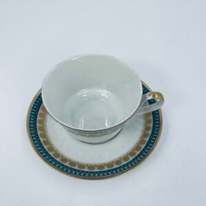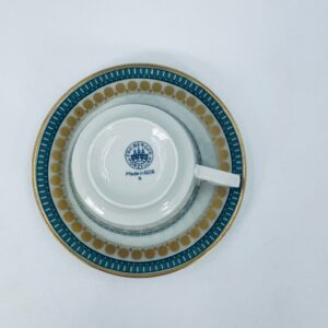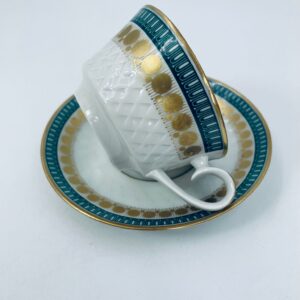 Porcelain duo set by the Freiberger label. The predominant colour is white with a motif of gold circles and a green design, finished with gilding on the rims and ear of the cup.