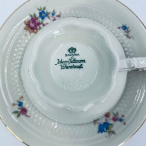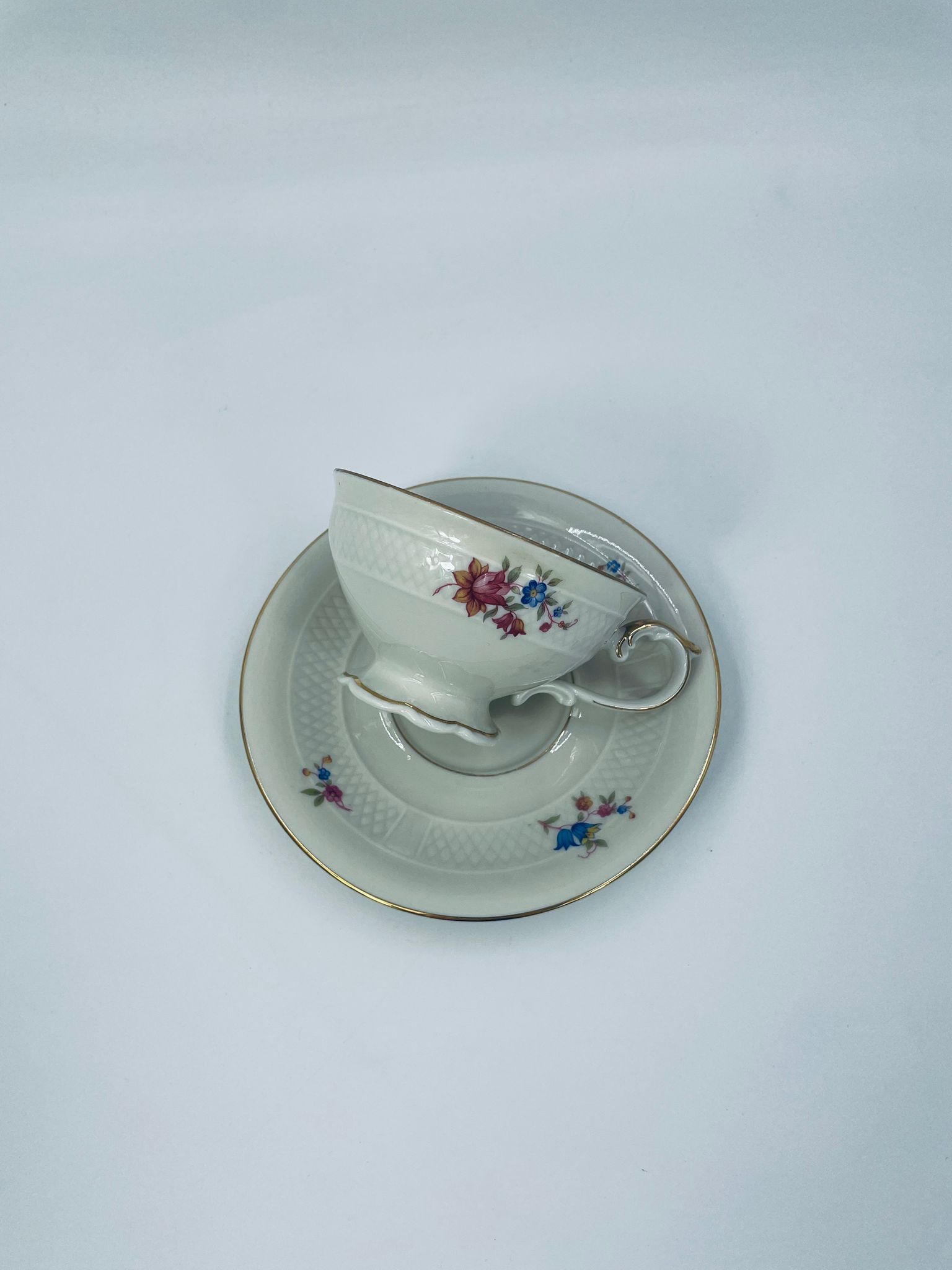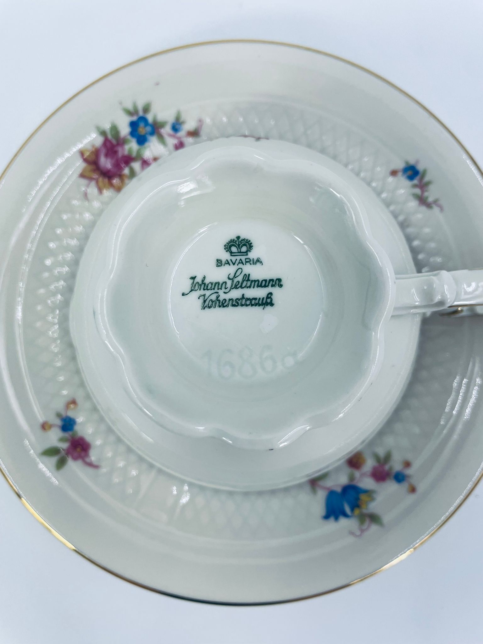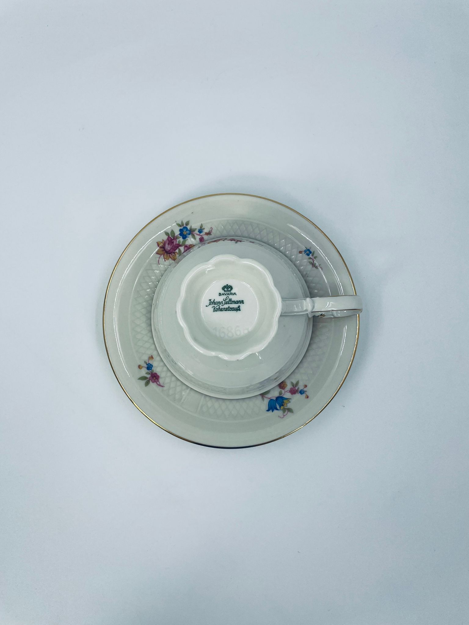 A collector's cup in duo set by the Johann Seltmann label, made of high-quality ecru porcelain with a floral pattern and gilded edges. The set features an embossed design on the surface.