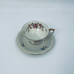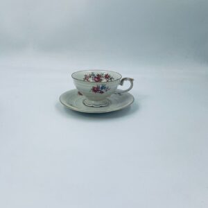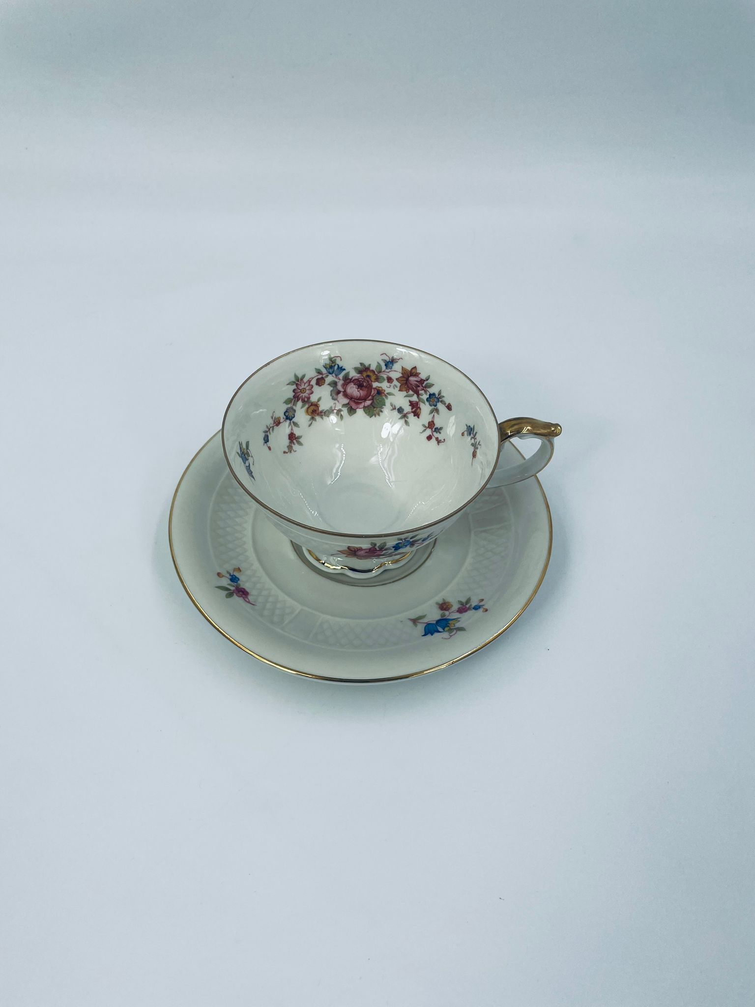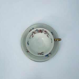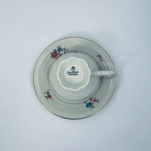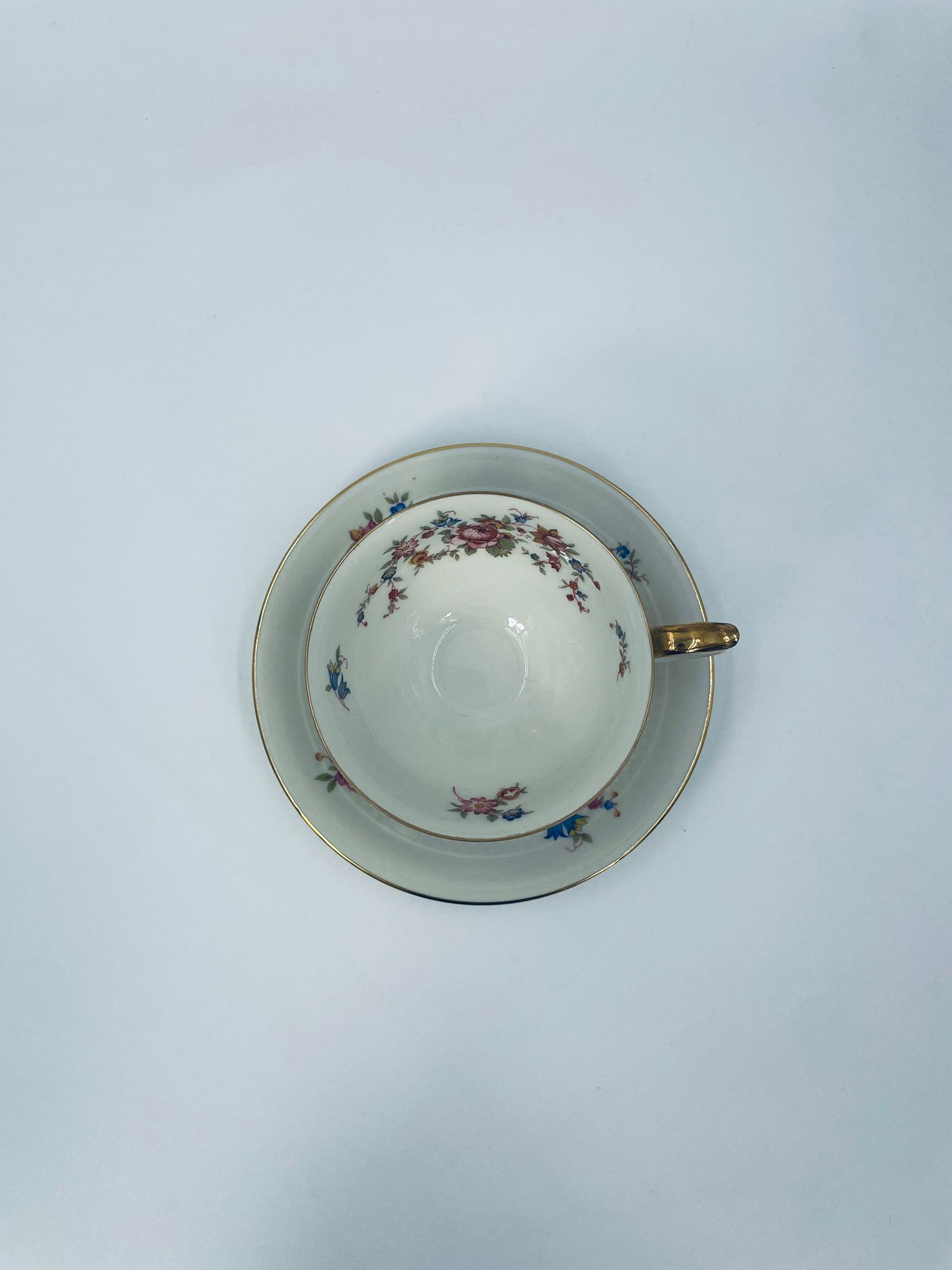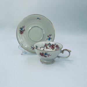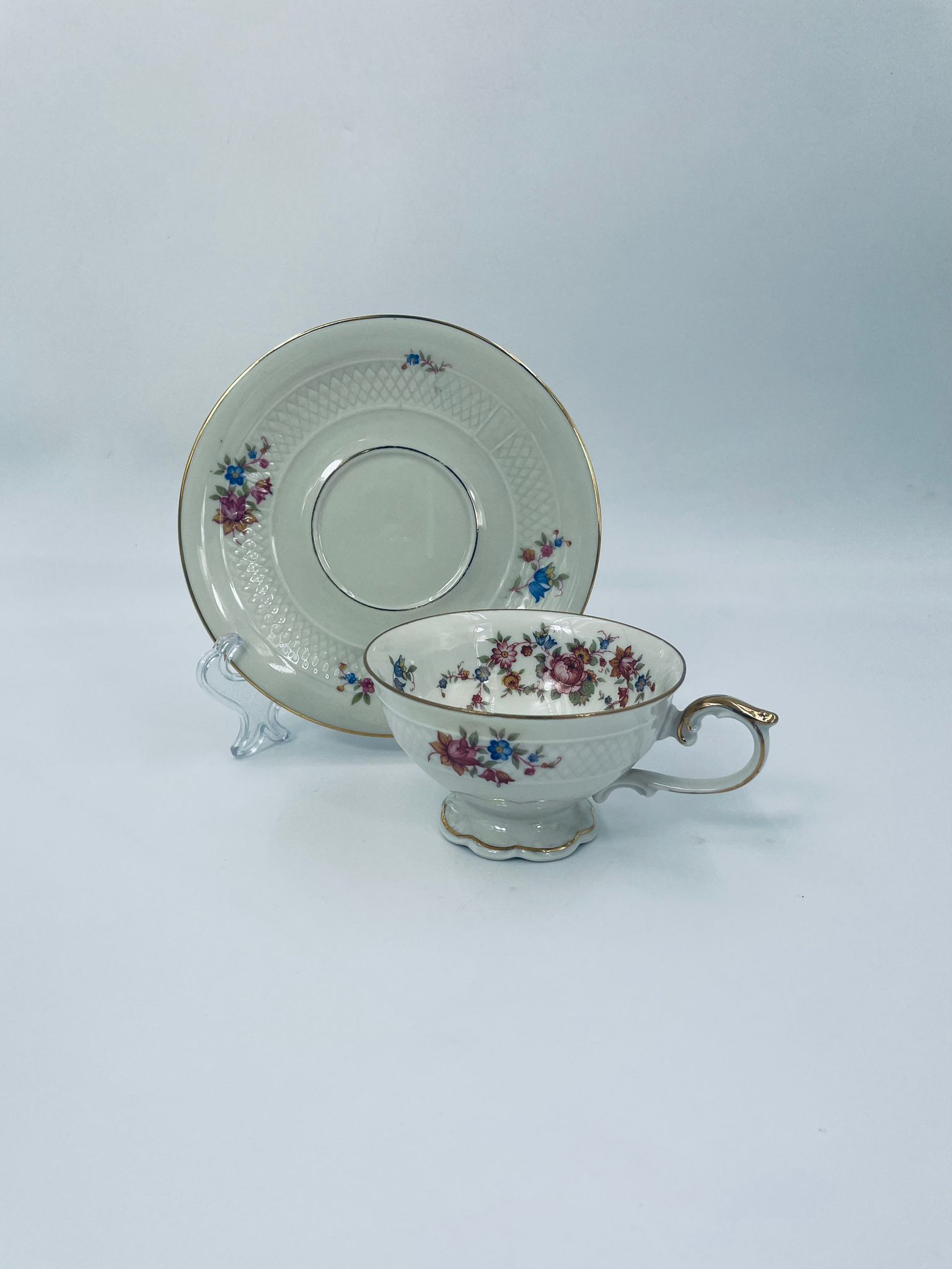 A collector's cup in duo set by the Johann Seltmann label, made of high-quality ecru porcelain with a floral pattern and gilded edges. The set features an embossed design on the surface.
