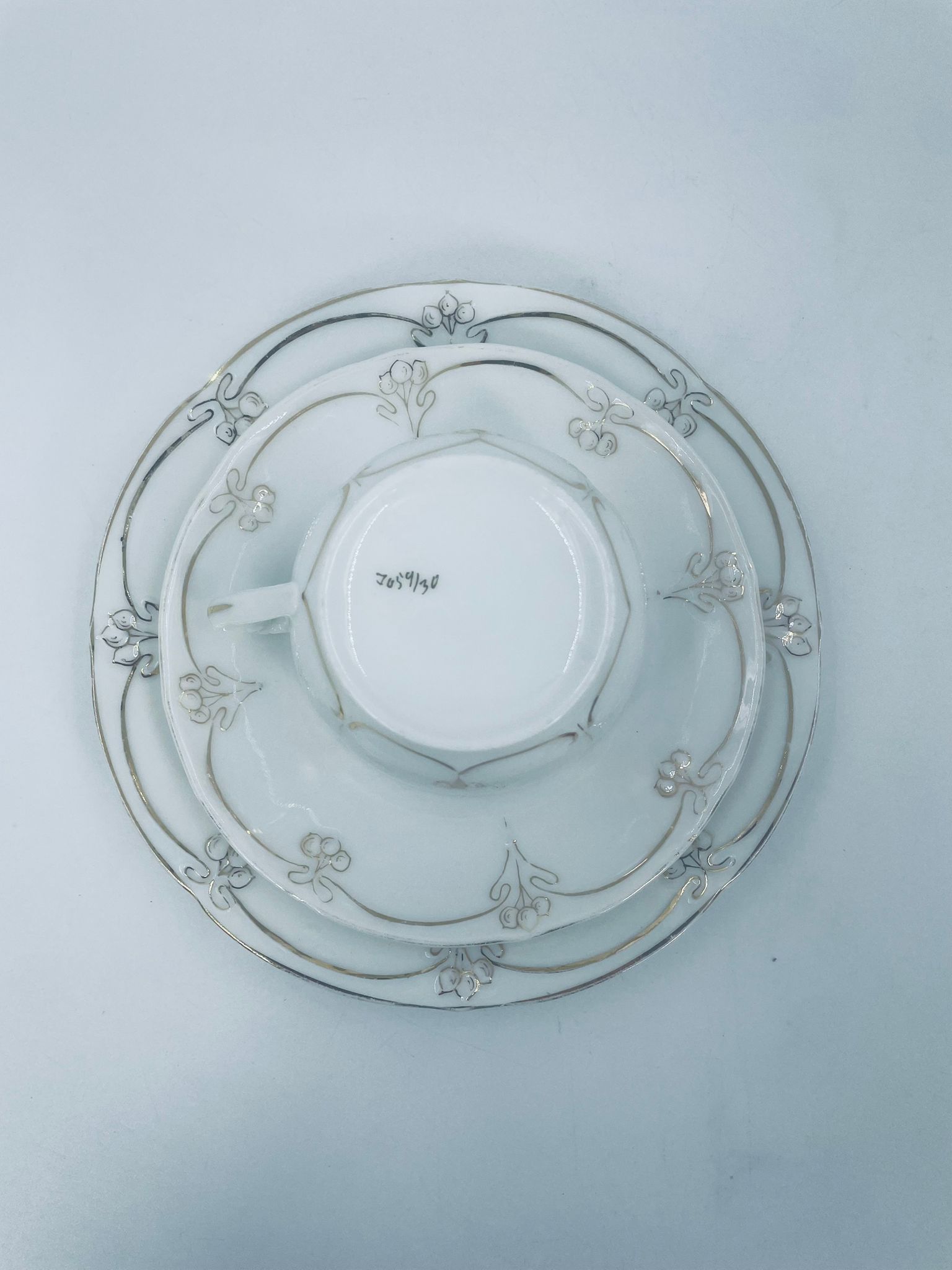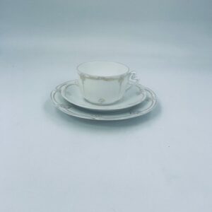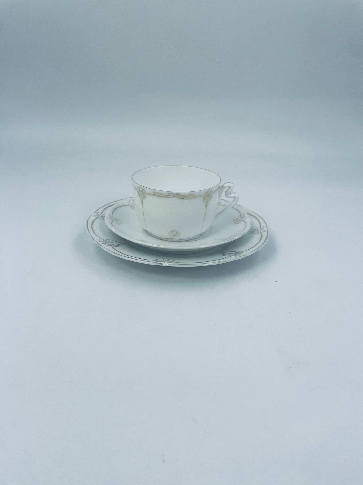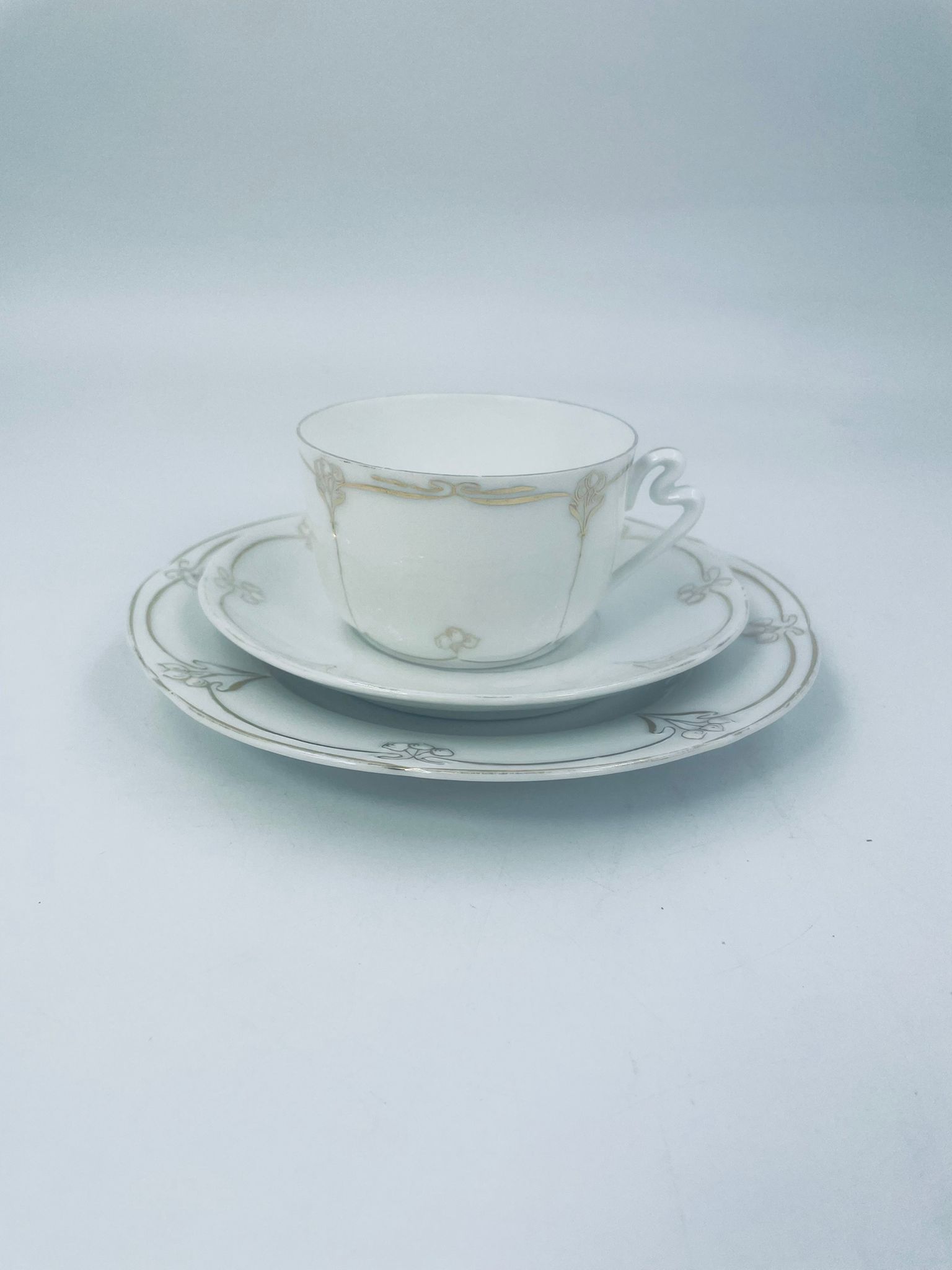 Cup in trio set. Set in white porcelain with gilt elements. The saucer has slight rubbing to the gilding.