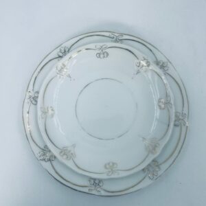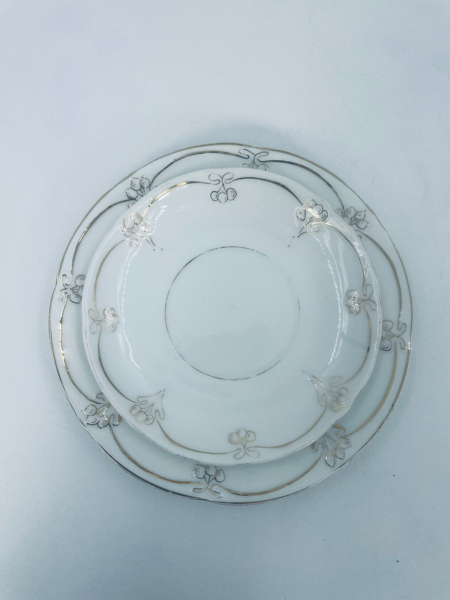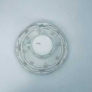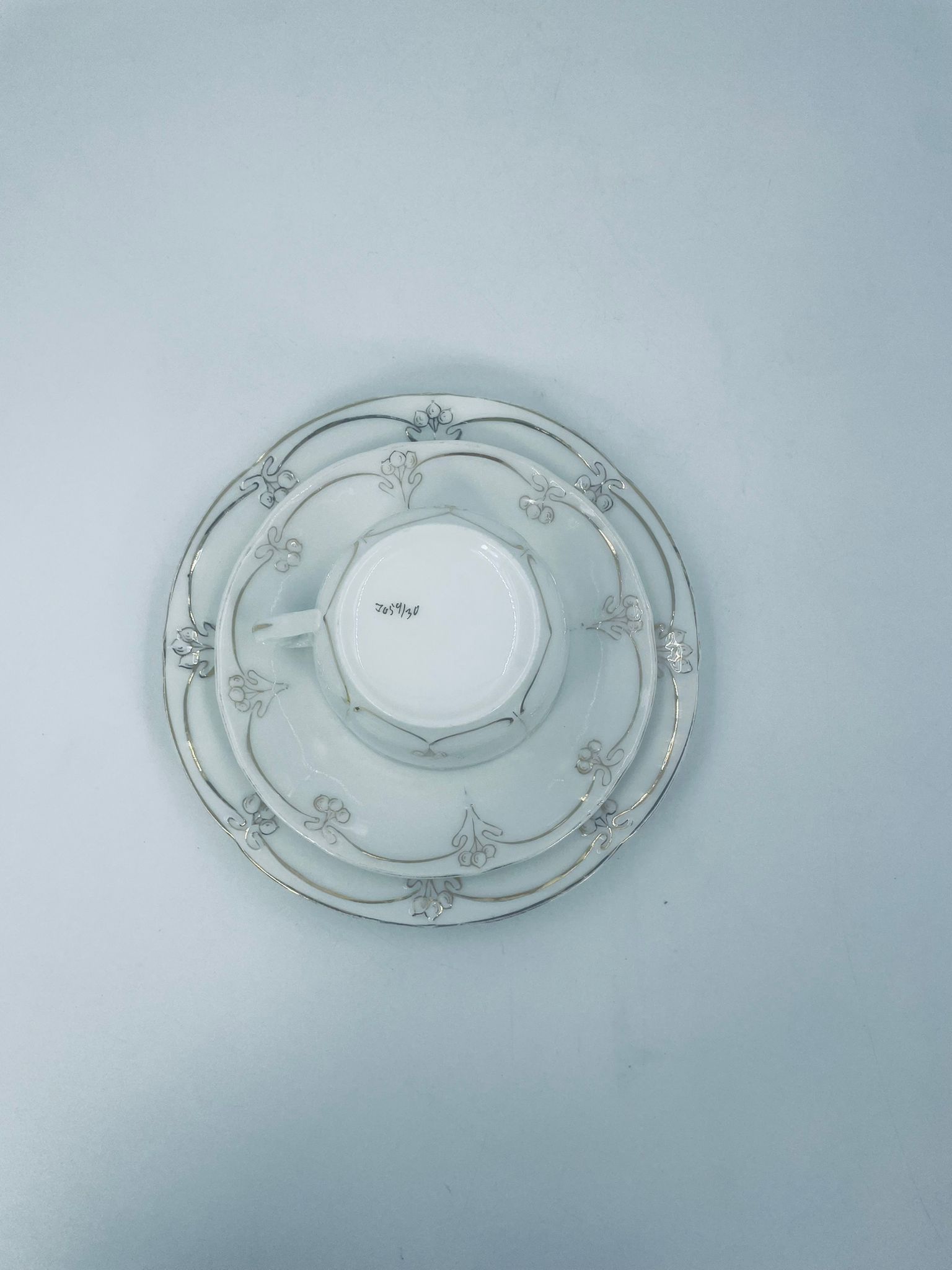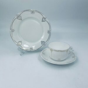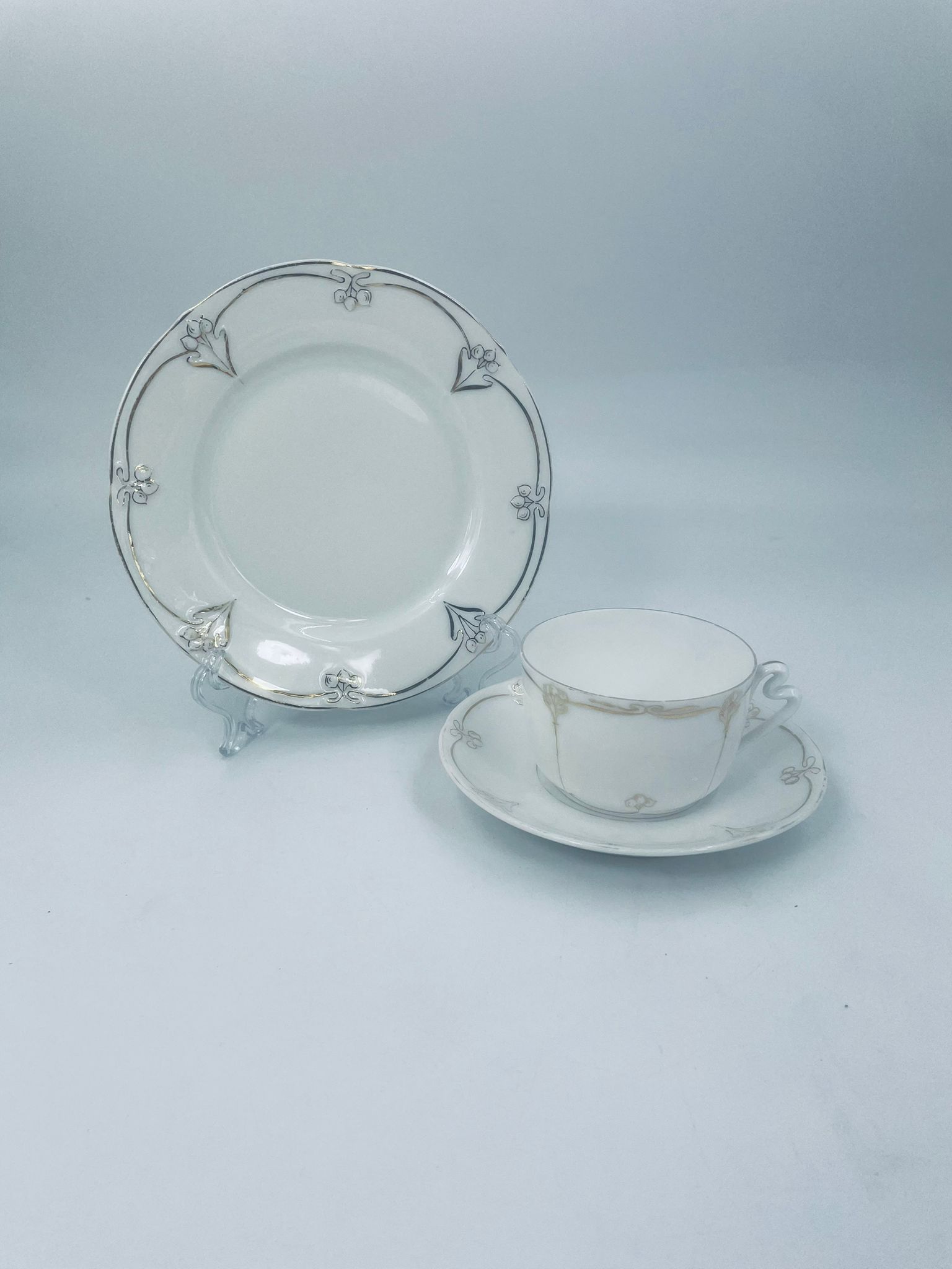Cup in trio set. Set in white porcelain with gilt elements. The saucer has slight rubbing to the gilding.