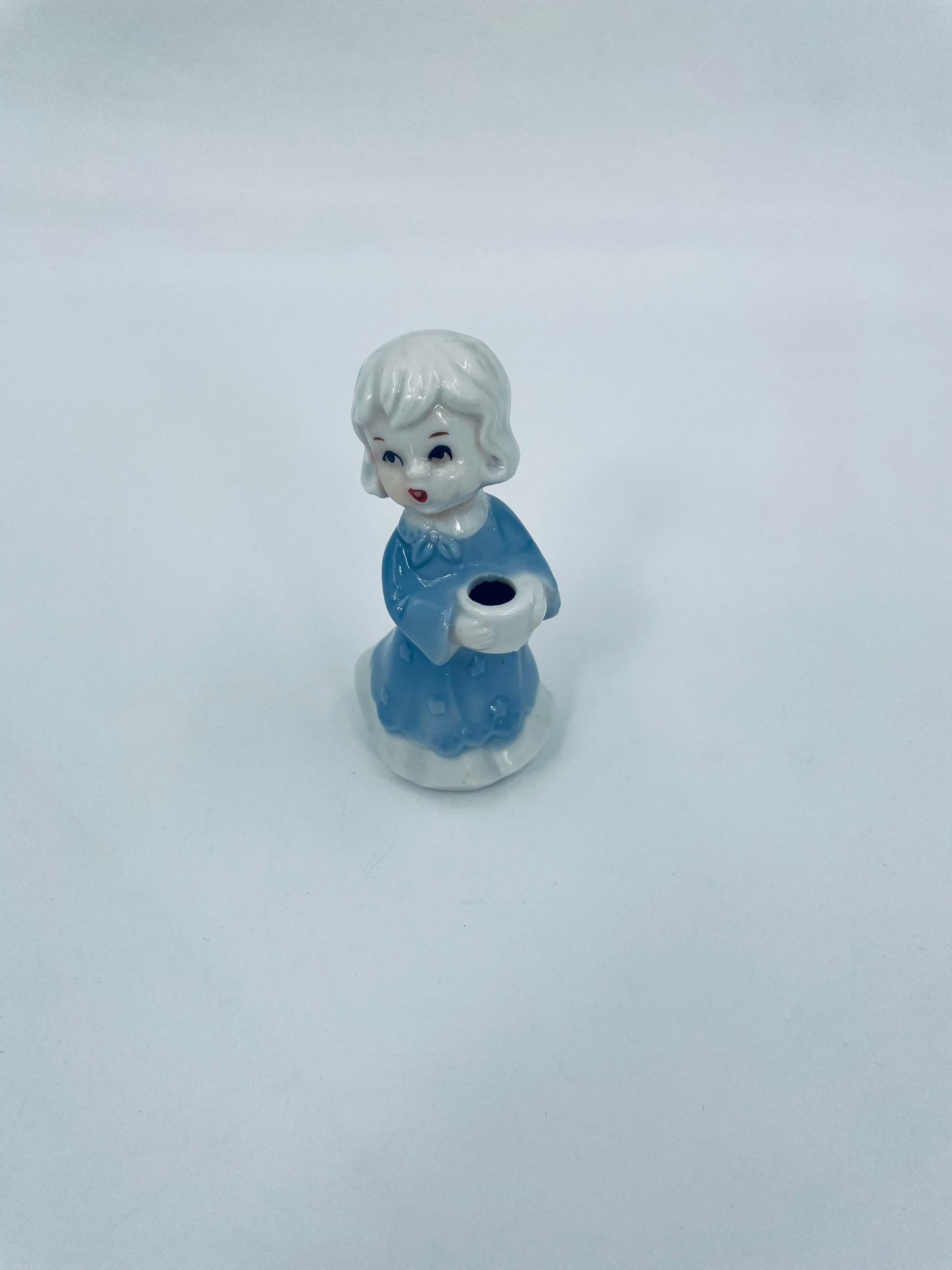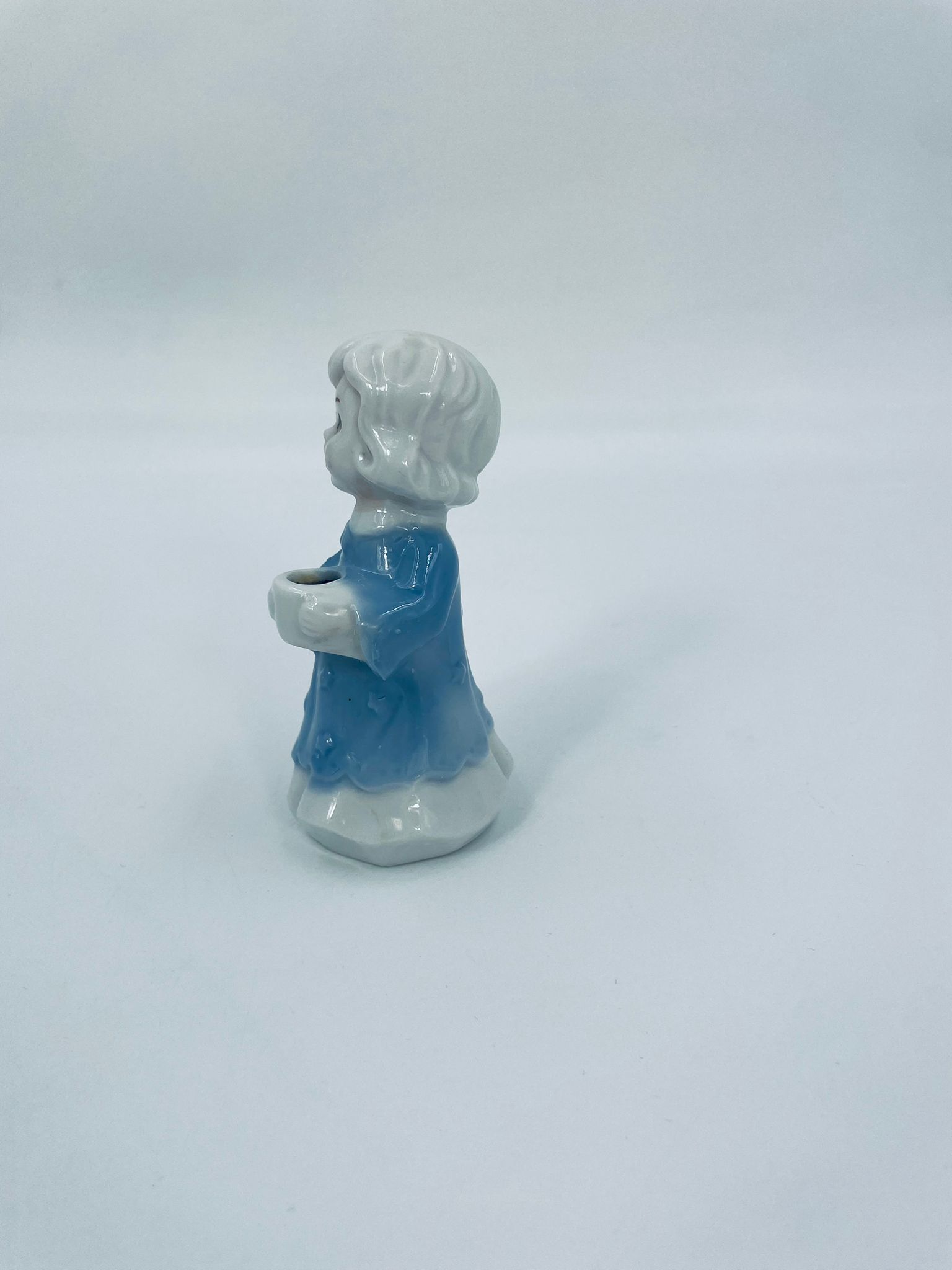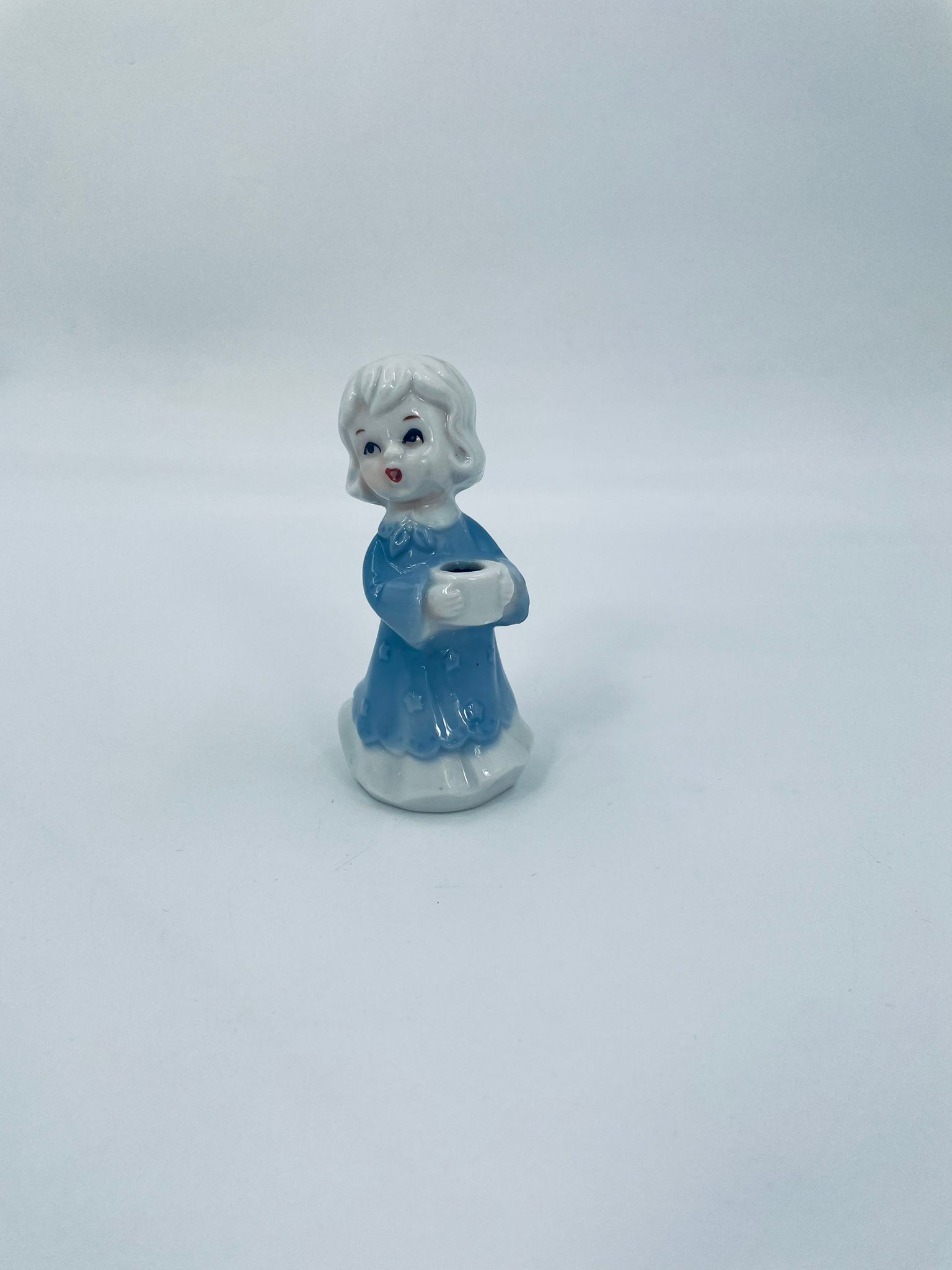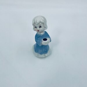 Vintage style collector's figurine, made of porcelain. A Christmas choir figurine, it depicts a girl dressed in a blue dress, holding a small candlestick.