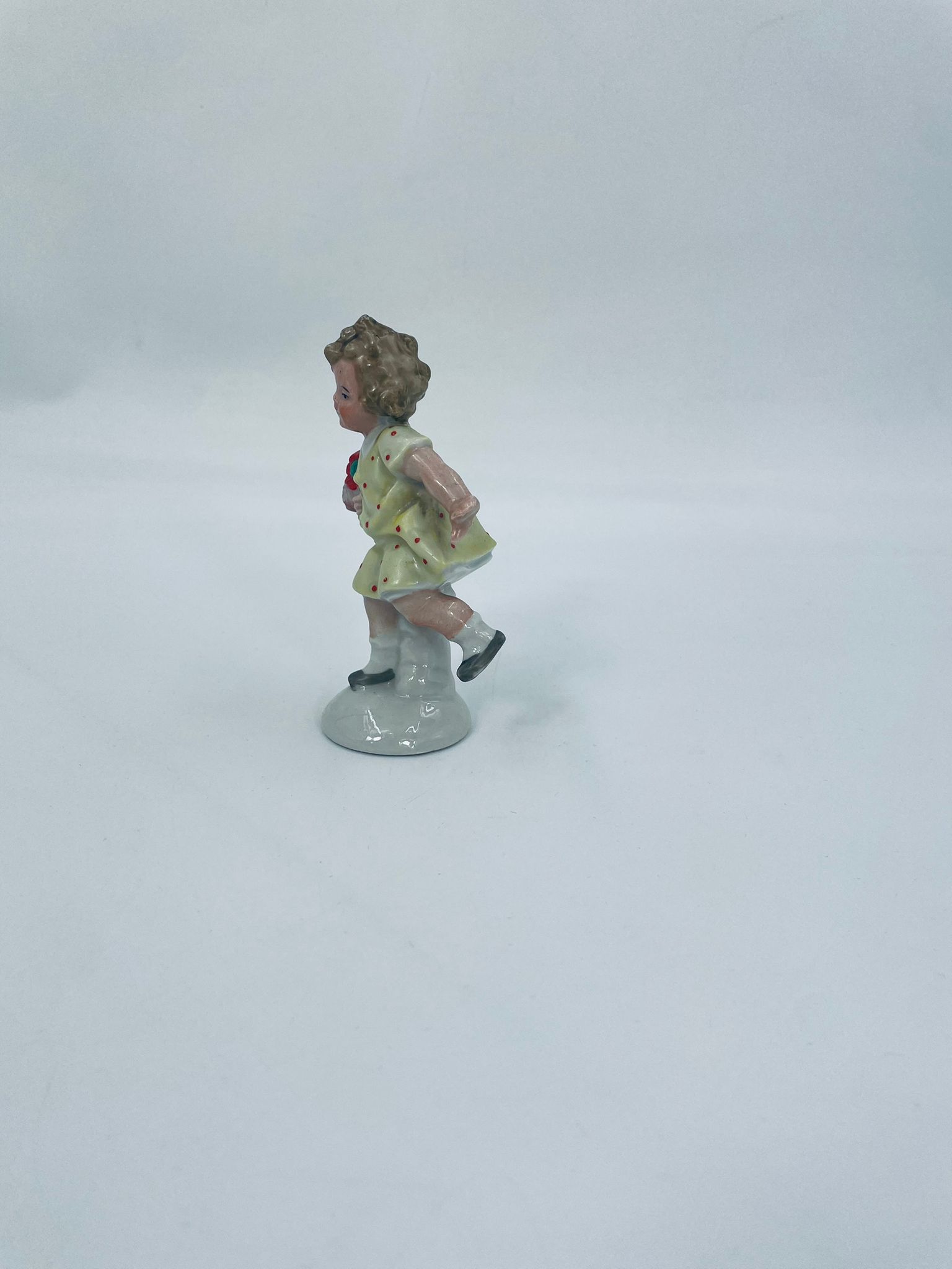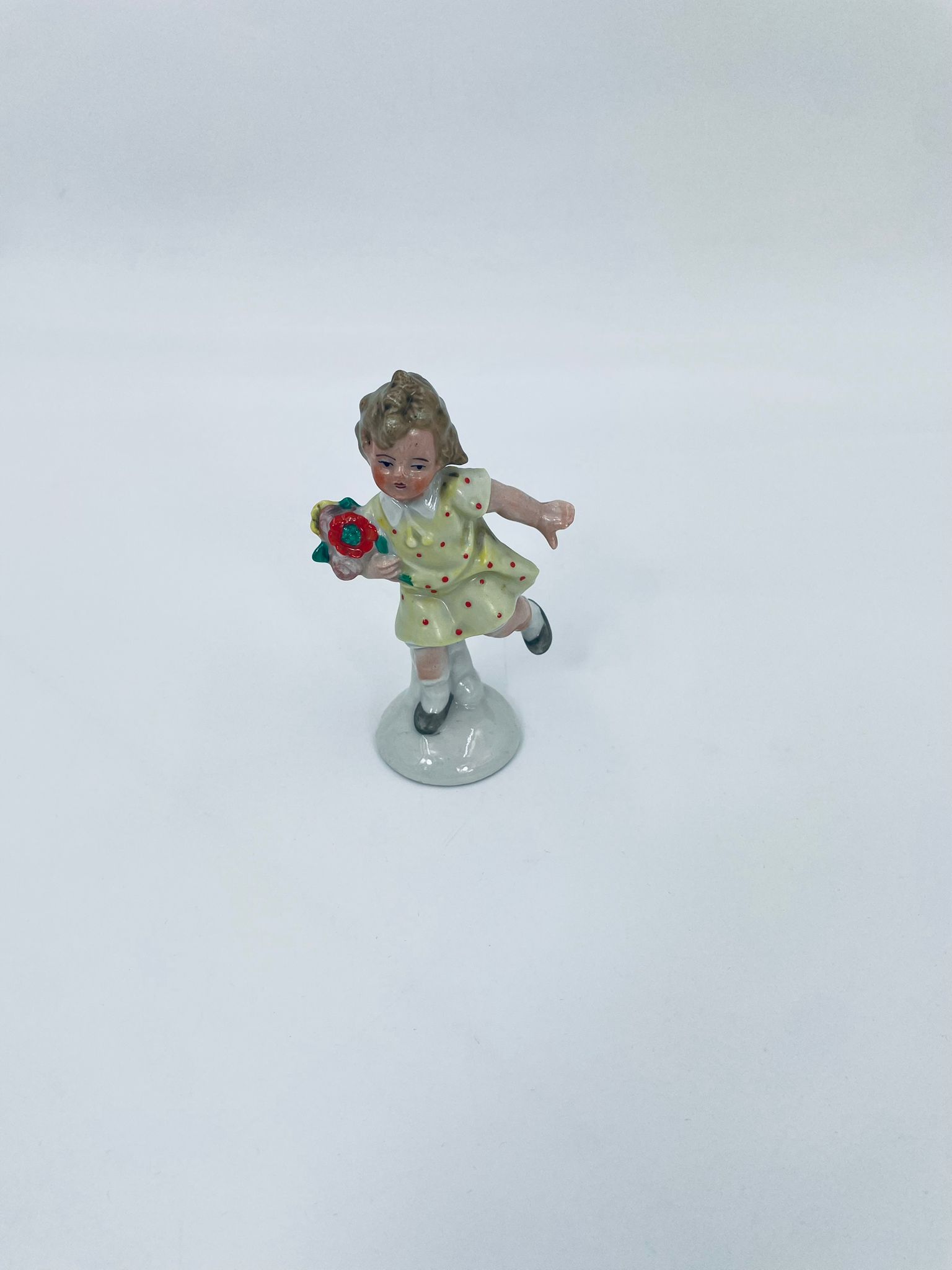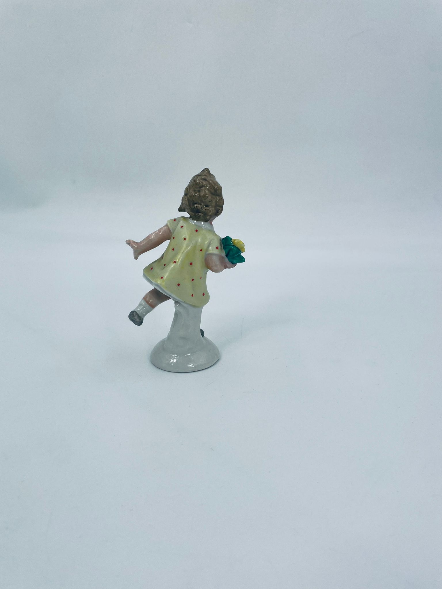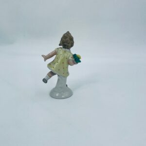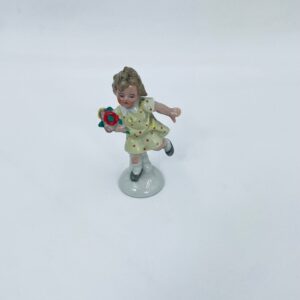 Collector's figurine of the Royal Worcester label, made of porcelain. The figurine depicts a girl standing on one leg, wearing a yellow dress with red dots and holding a bouquet of flowers.