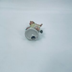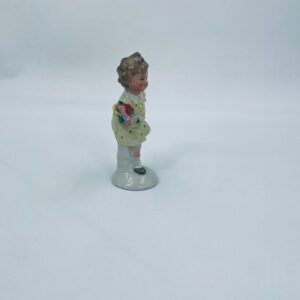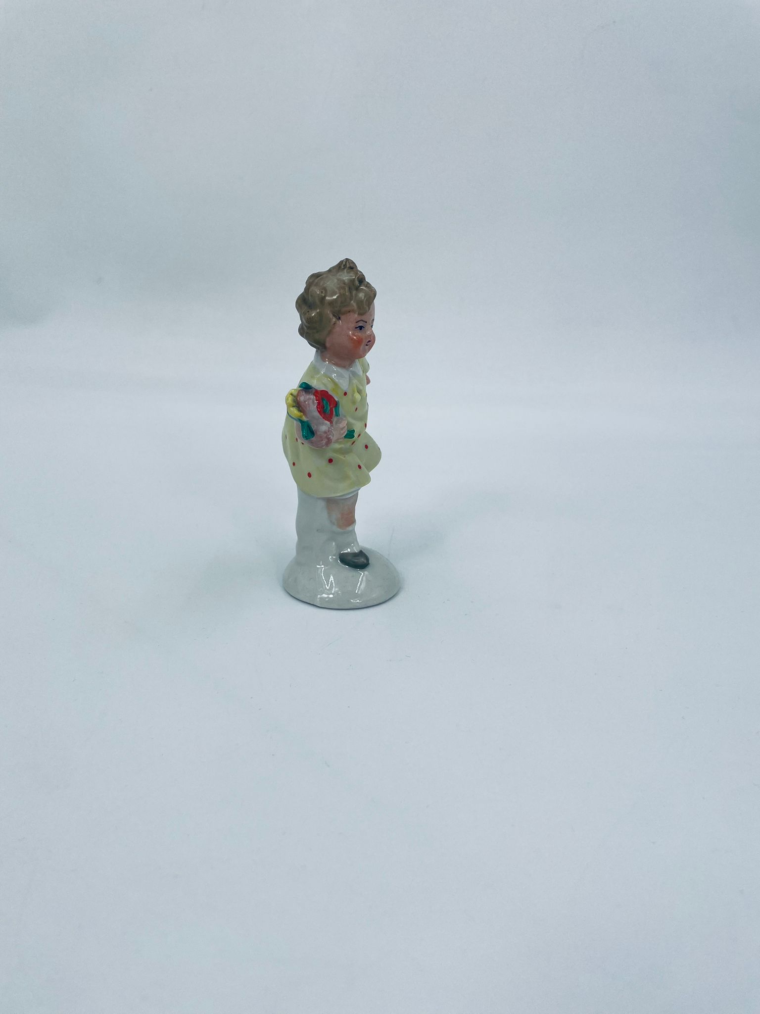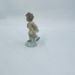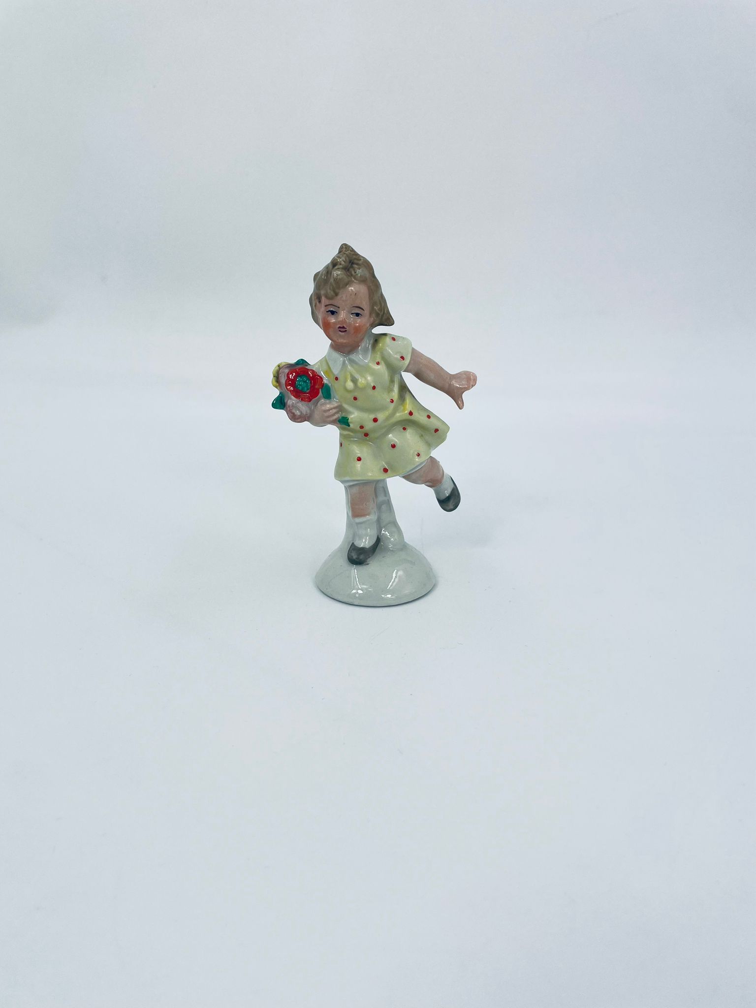 Collector's figurine of the Royal Worcester label, made of porcelain. The figurine depicts a girl standing on one leg, wearing a yellow dress with red dots and holding a bouquet of flowers.