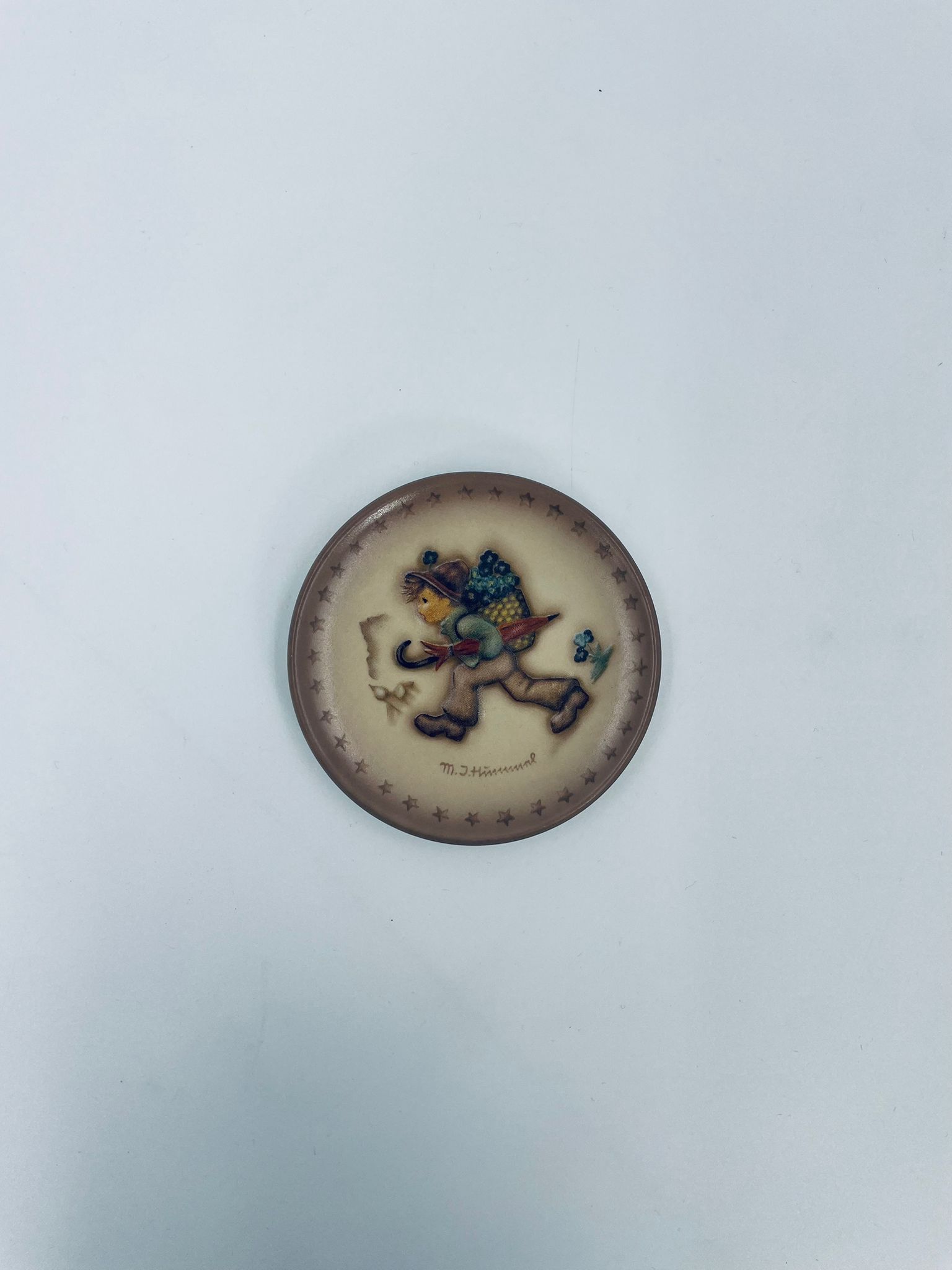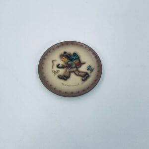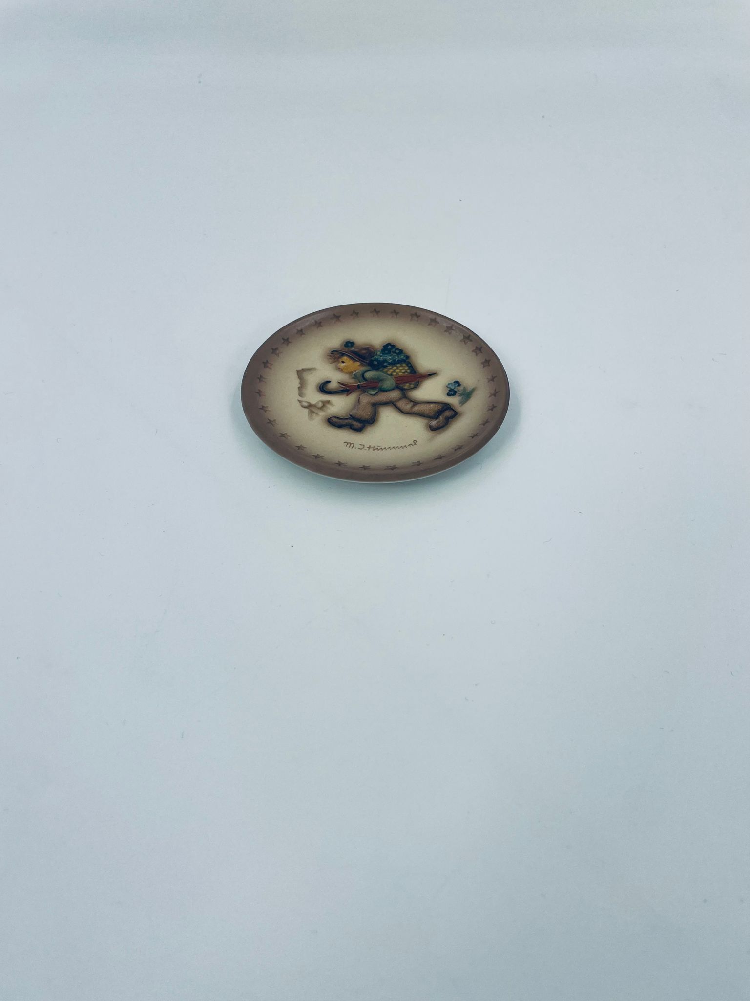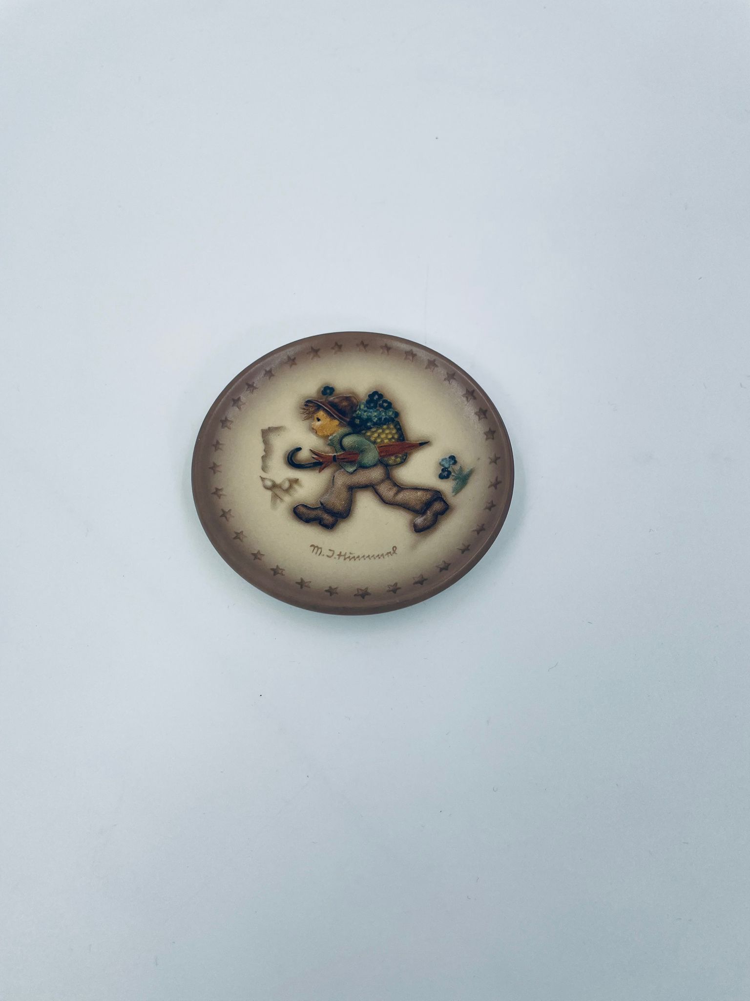 A collector's plate from the Goebel label, designed by M.J Hummel in 1995. The plate is part of a licensed reproduction line that exudes Vintage charm. The item is handmade, in porcelain, vintage, with a motif depicting a boy with a backpack and an umbrella.