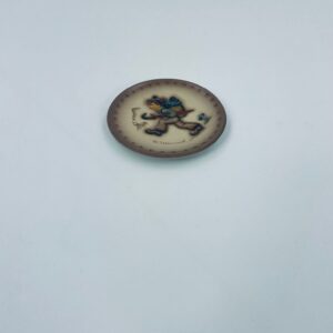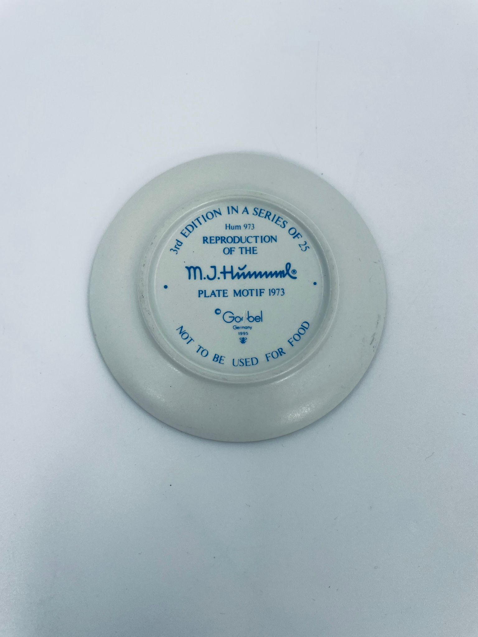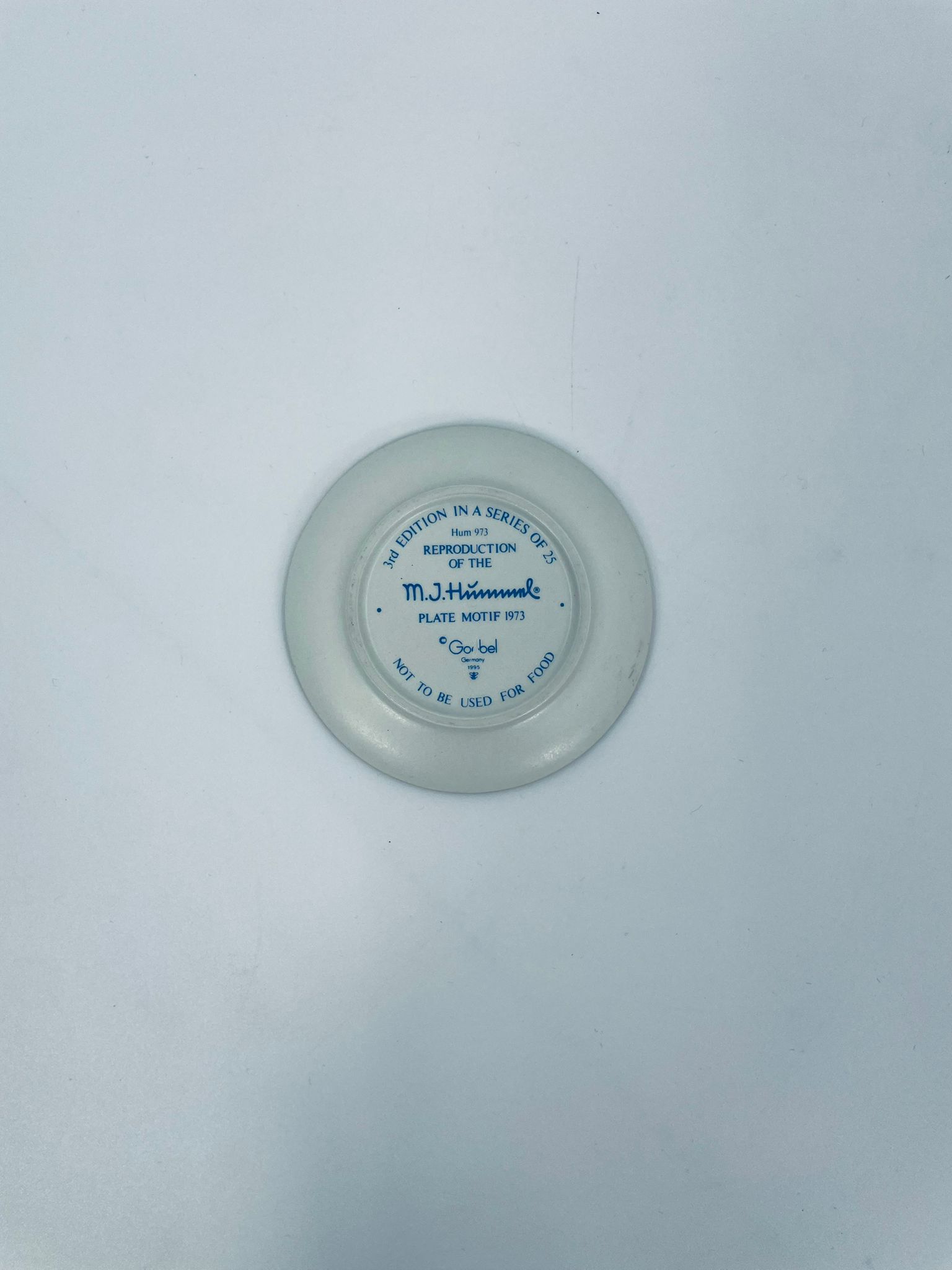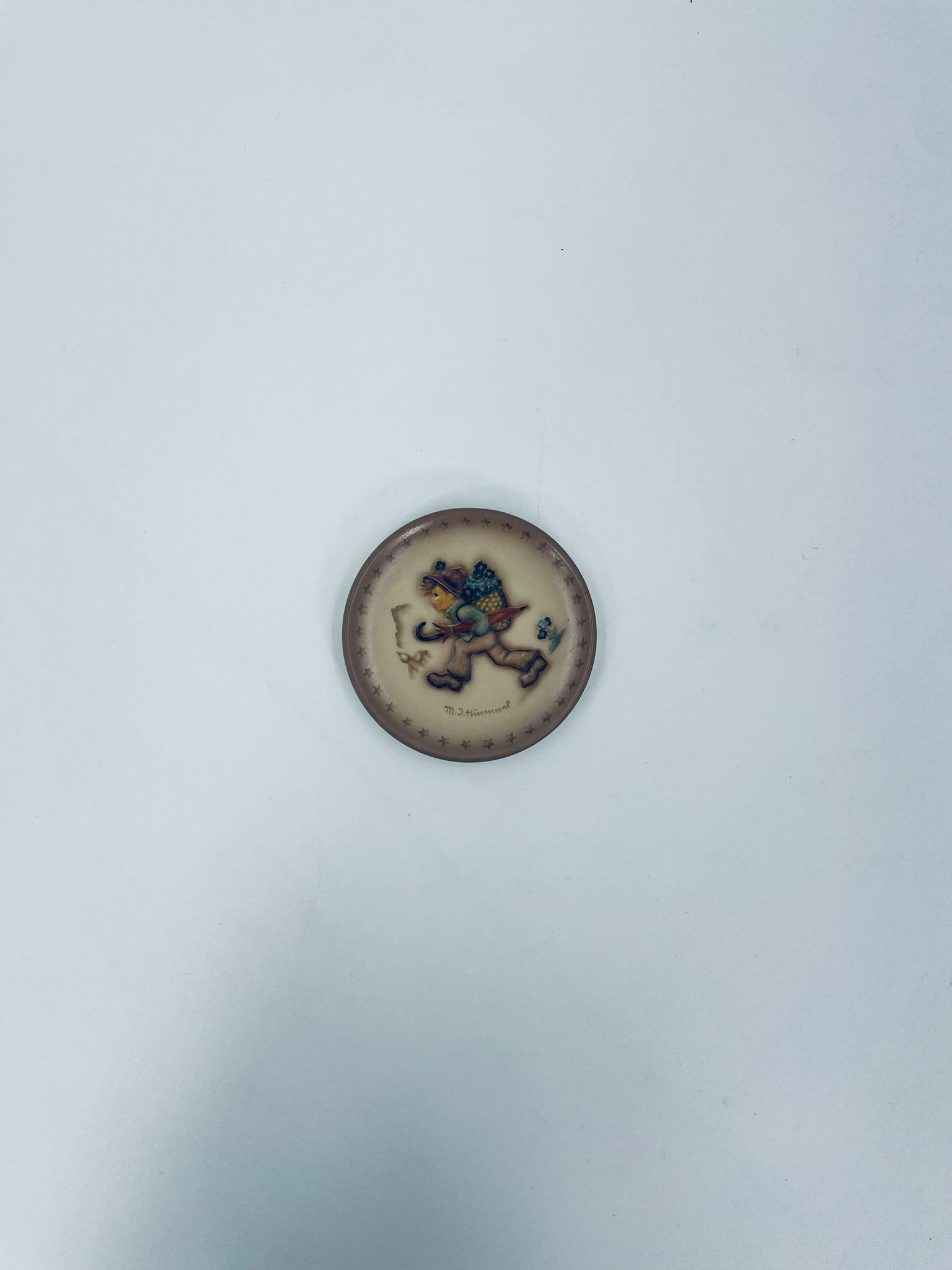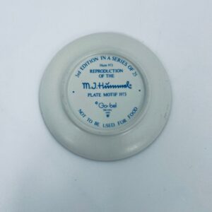 A collector's plate from the Goebel label, designed by M.J Hummel in 1995. The plate is part of a licensed reproduction line that exudes Vintage charm. The item is handmade, in porcelain, vintage, with a motif depicting a boy with a backpack and an umbrella.