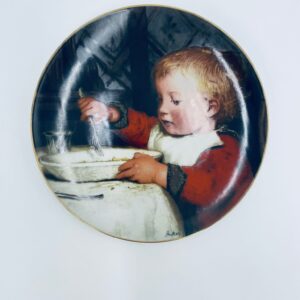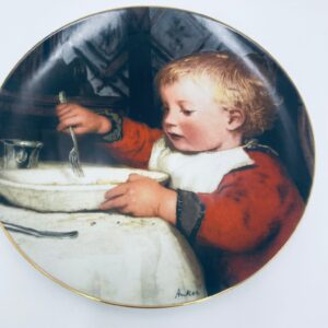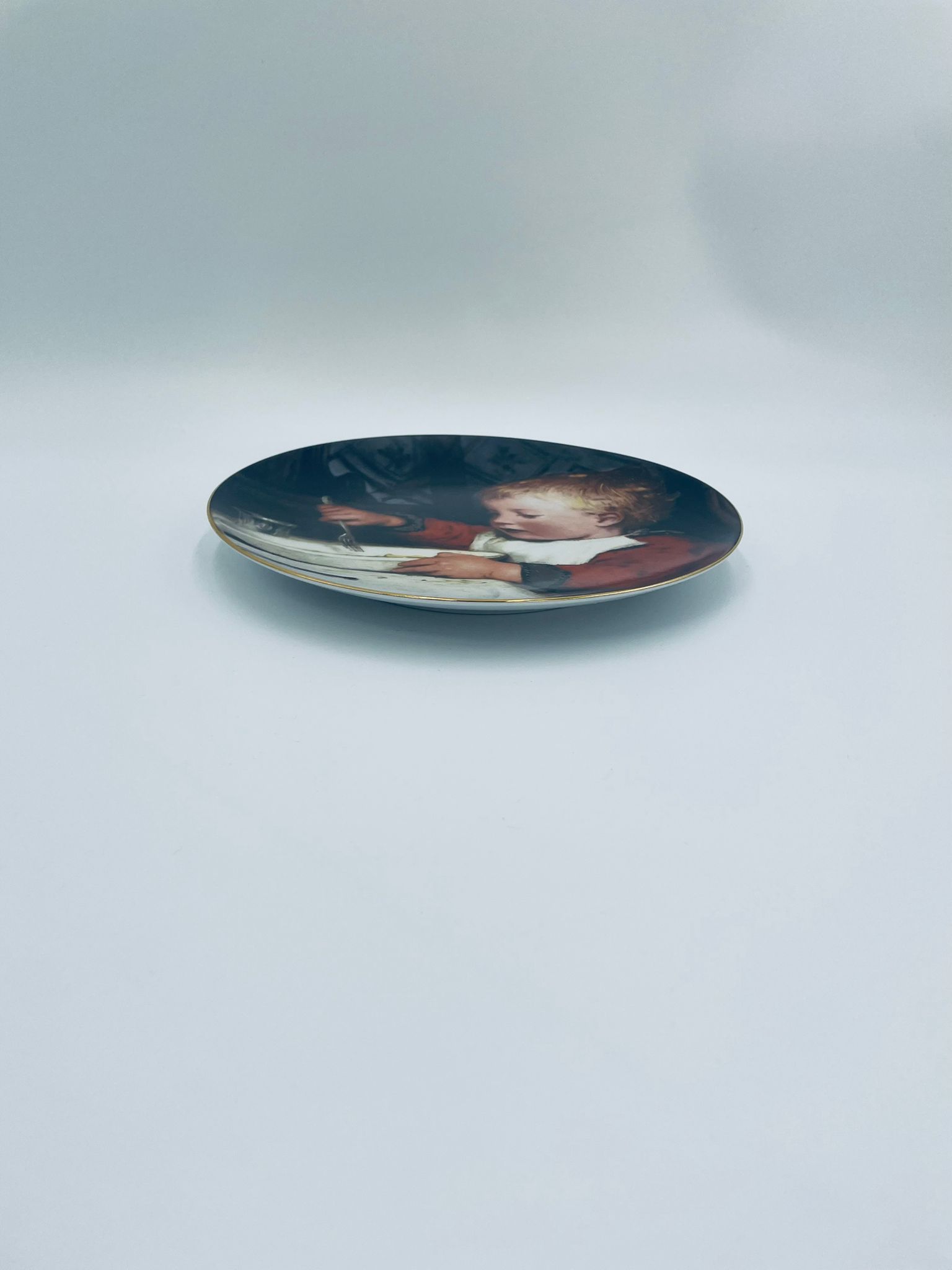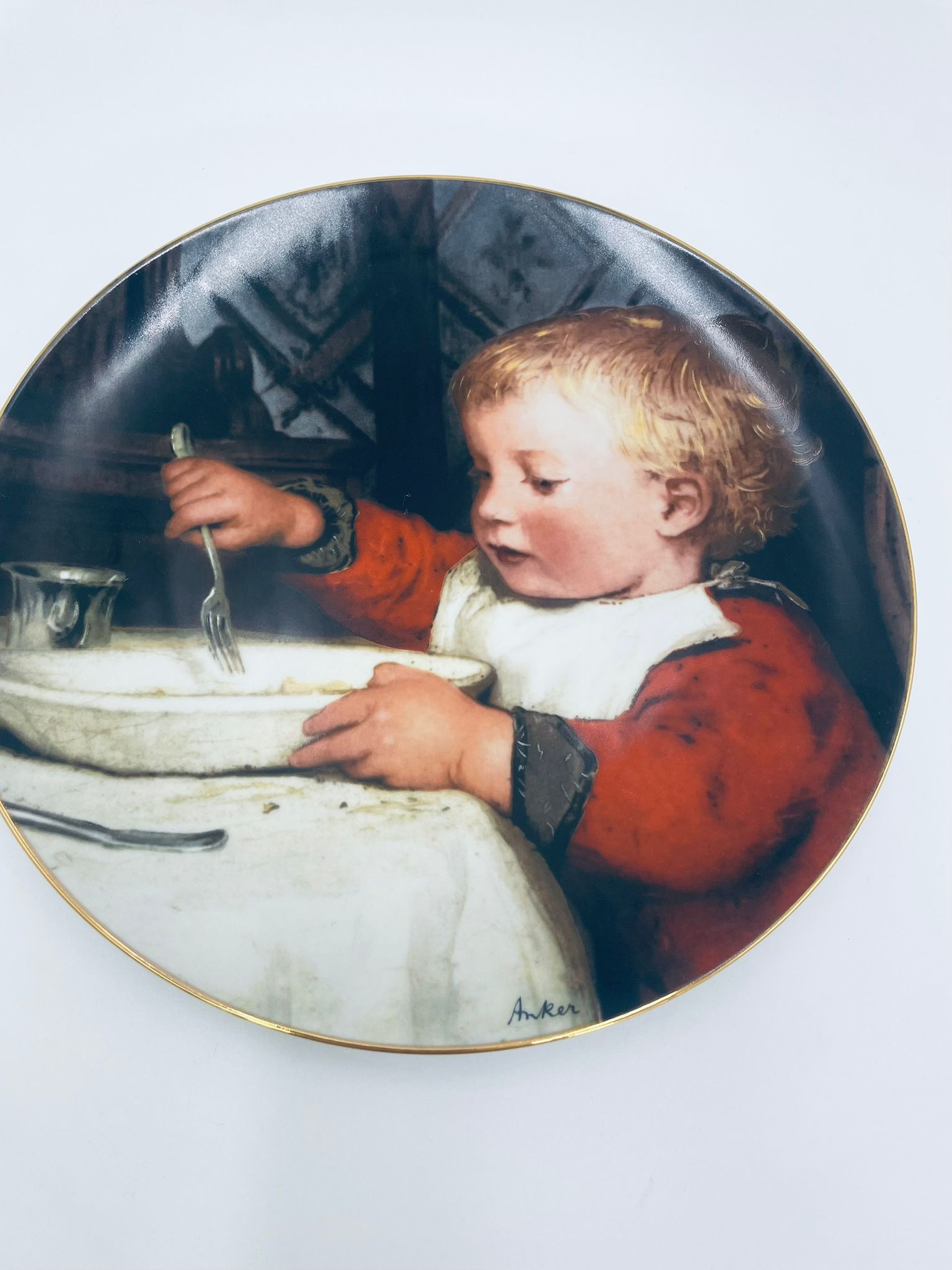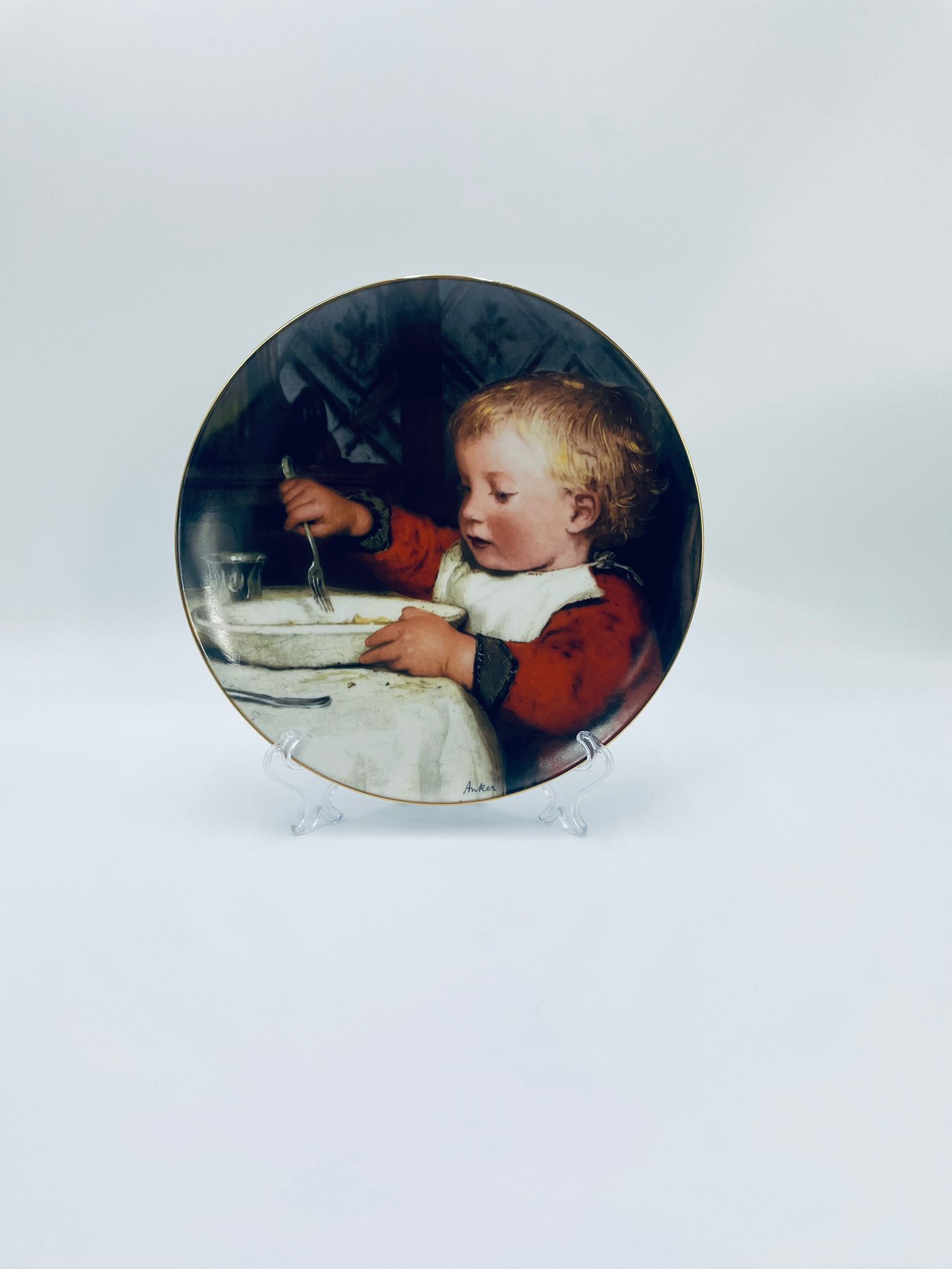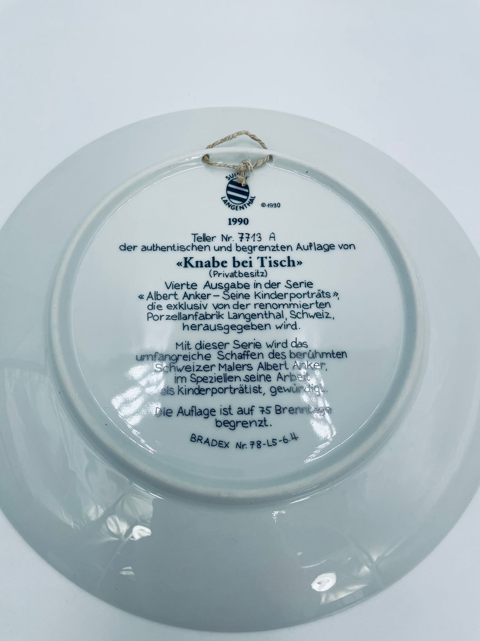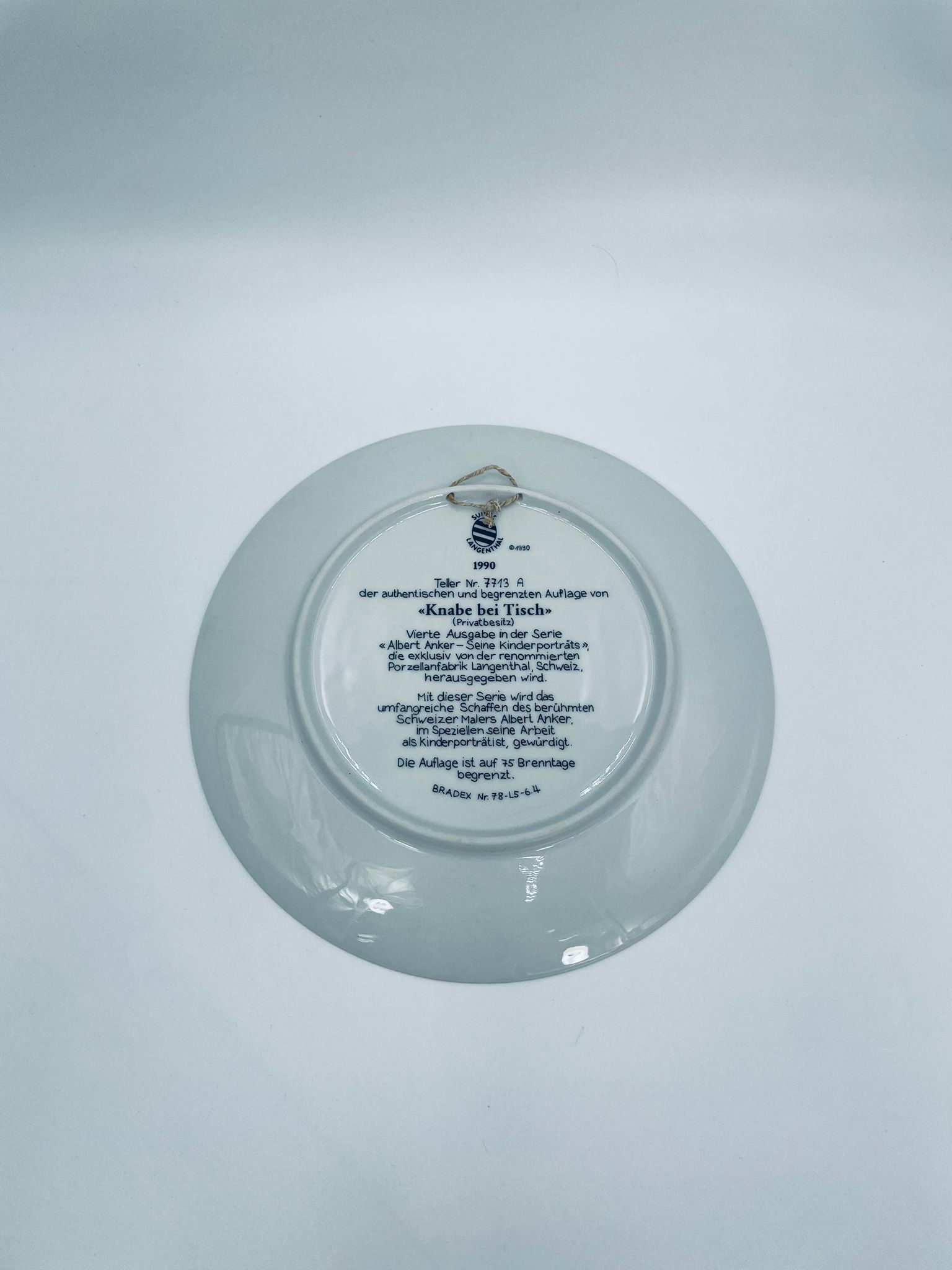 Collector's plate produced by the Swiss porcelain manufactory Langenthal, made of high quality porcelain. The plate comes from a limited edition, fourth series, reproduction of a painting by Swiss painter Albert Anker entitled „Knabe bei ariach” (Boy at the table), finished with gilding on the rim.