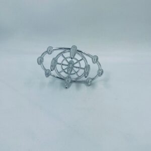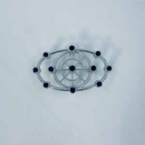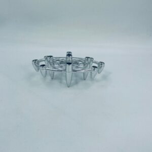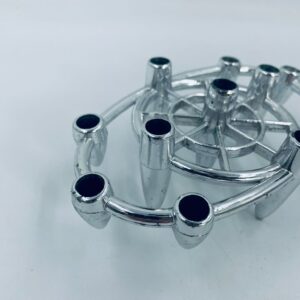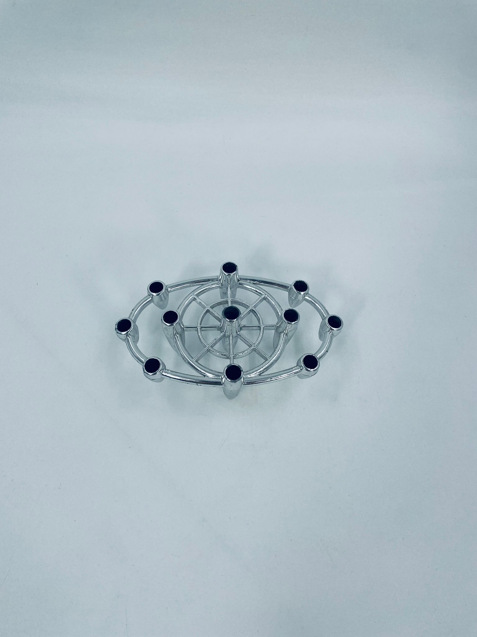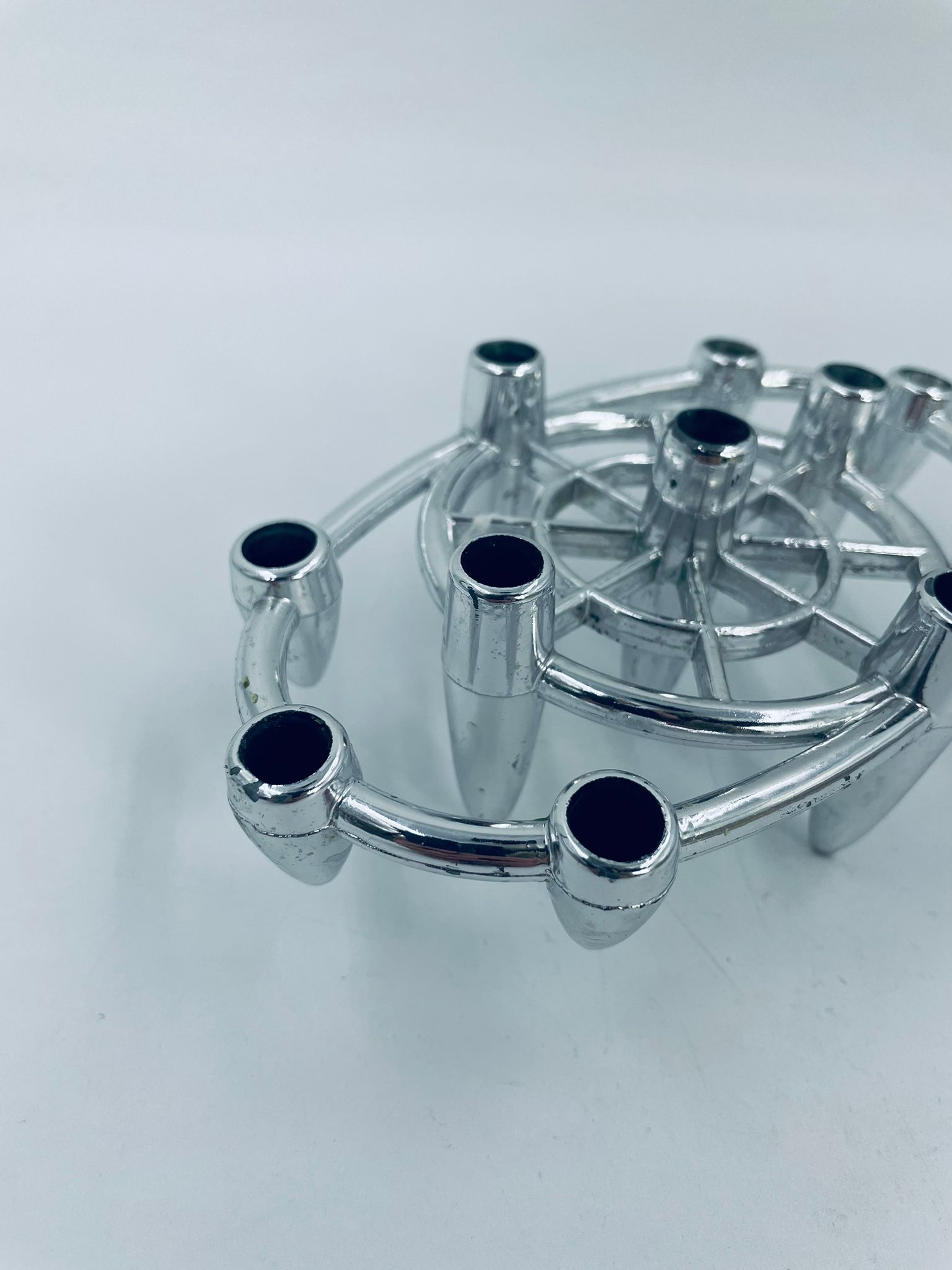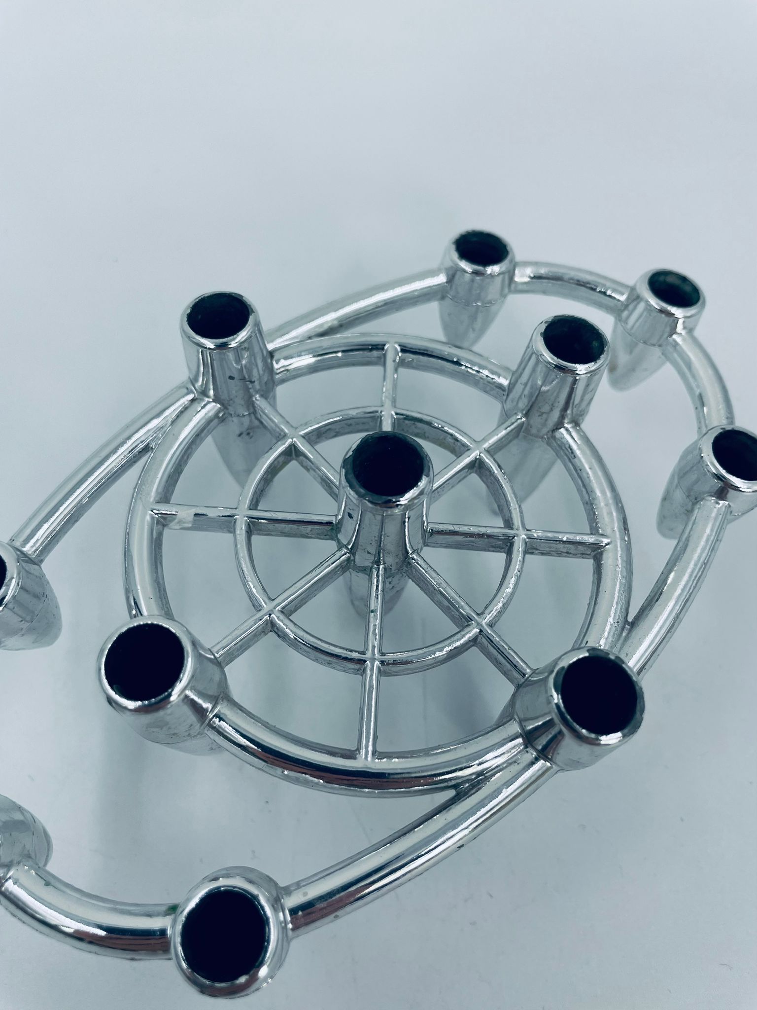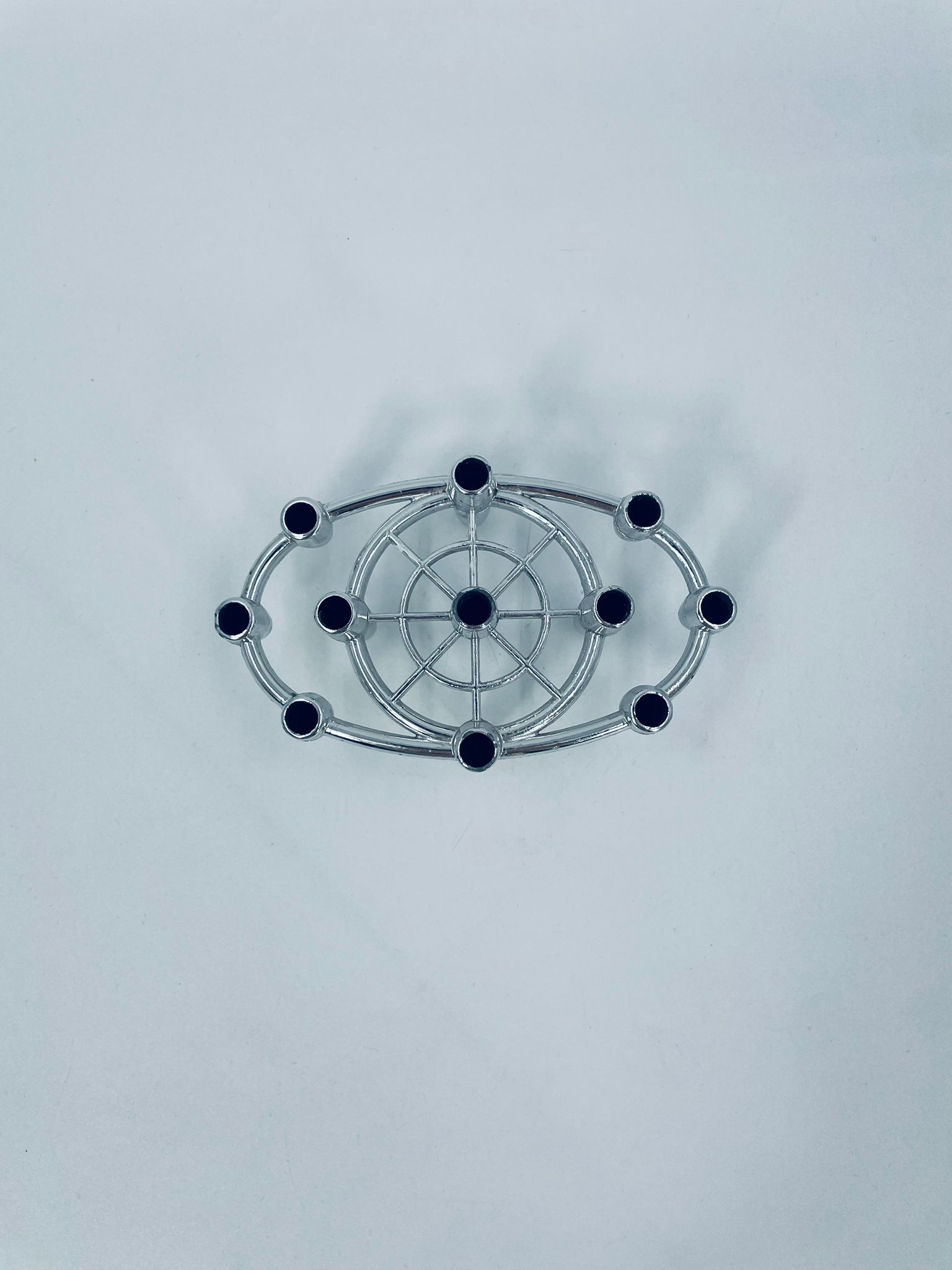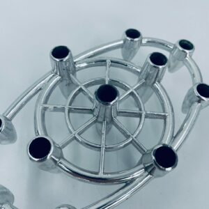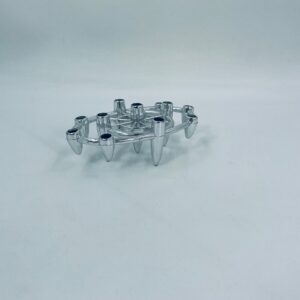 A unique conical „Flower” candle holder manufactured by Colonial Candle Company in the 1950s. Colonial Candle is one of the oldest and most respected candle brands in the United States, founded in 1909 by Mabel Baker. An oval-shaped, silver-coloured candlestick with 11 candle holders and decorative conical legs. The candlestick has small chips.