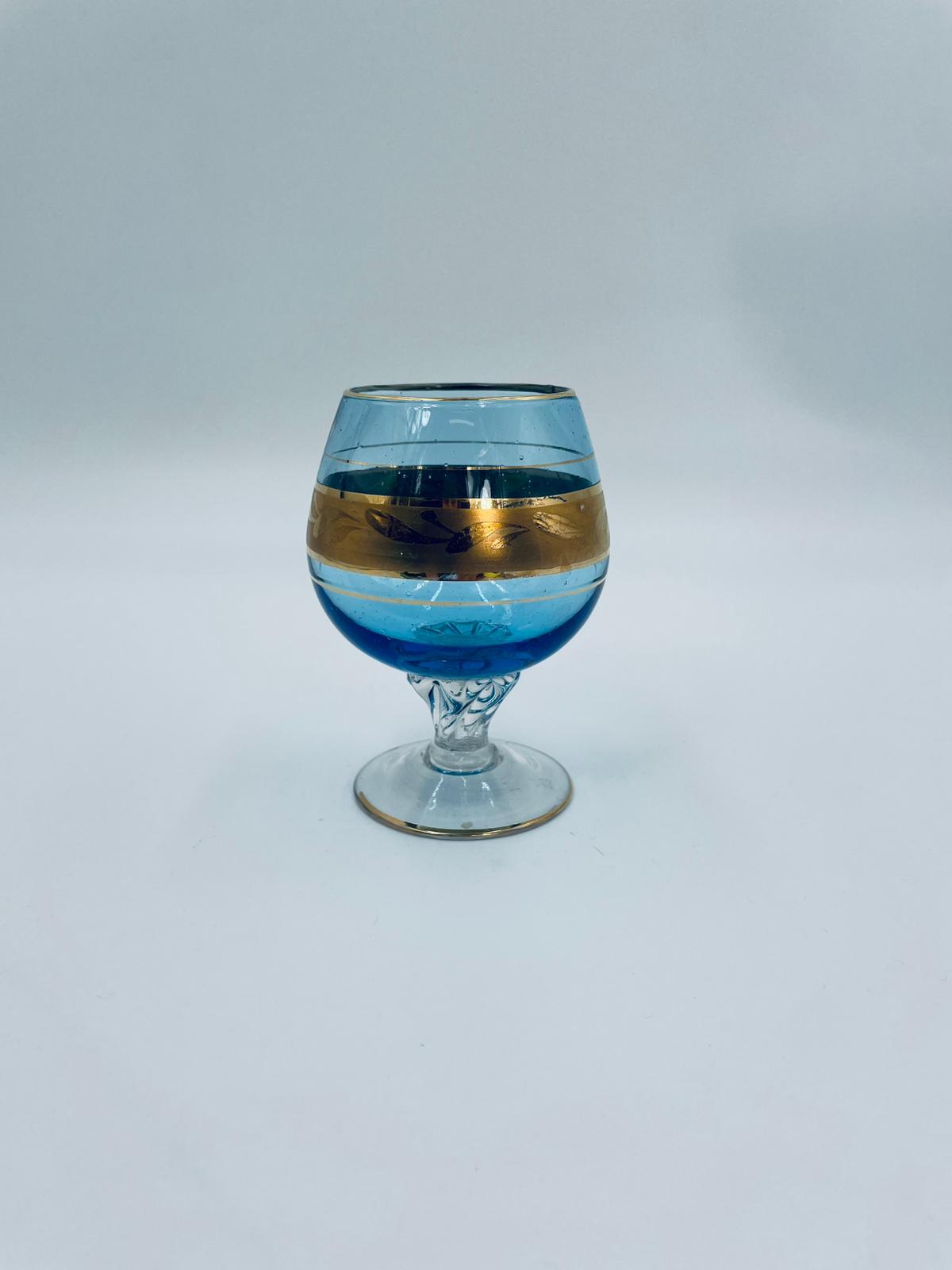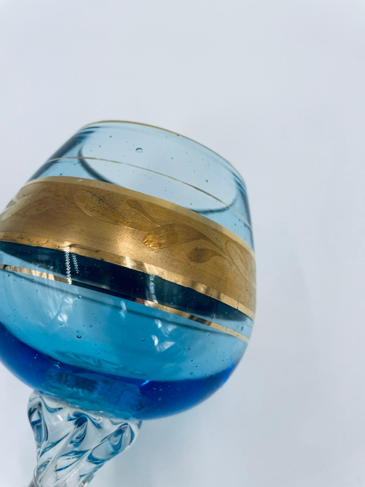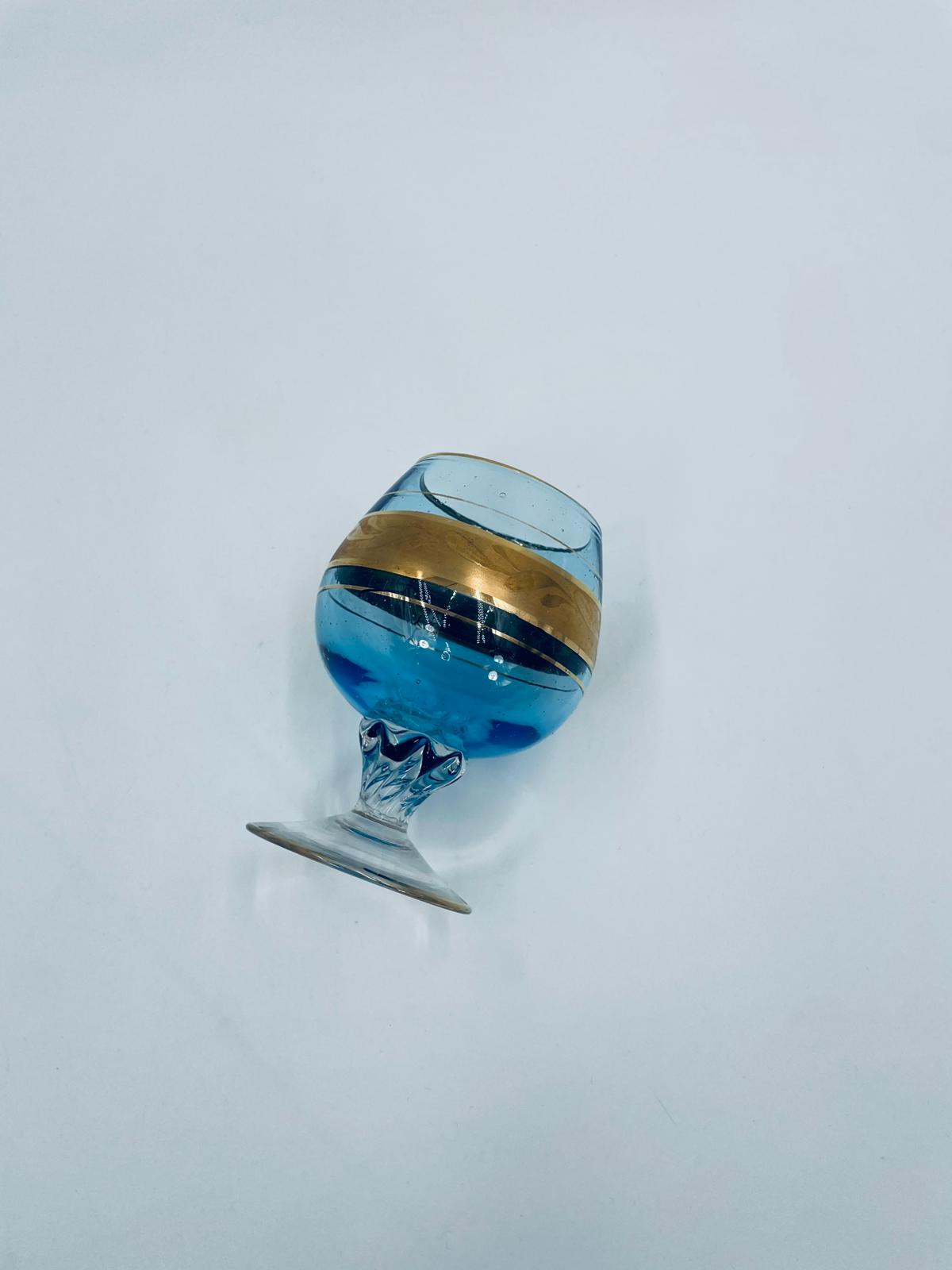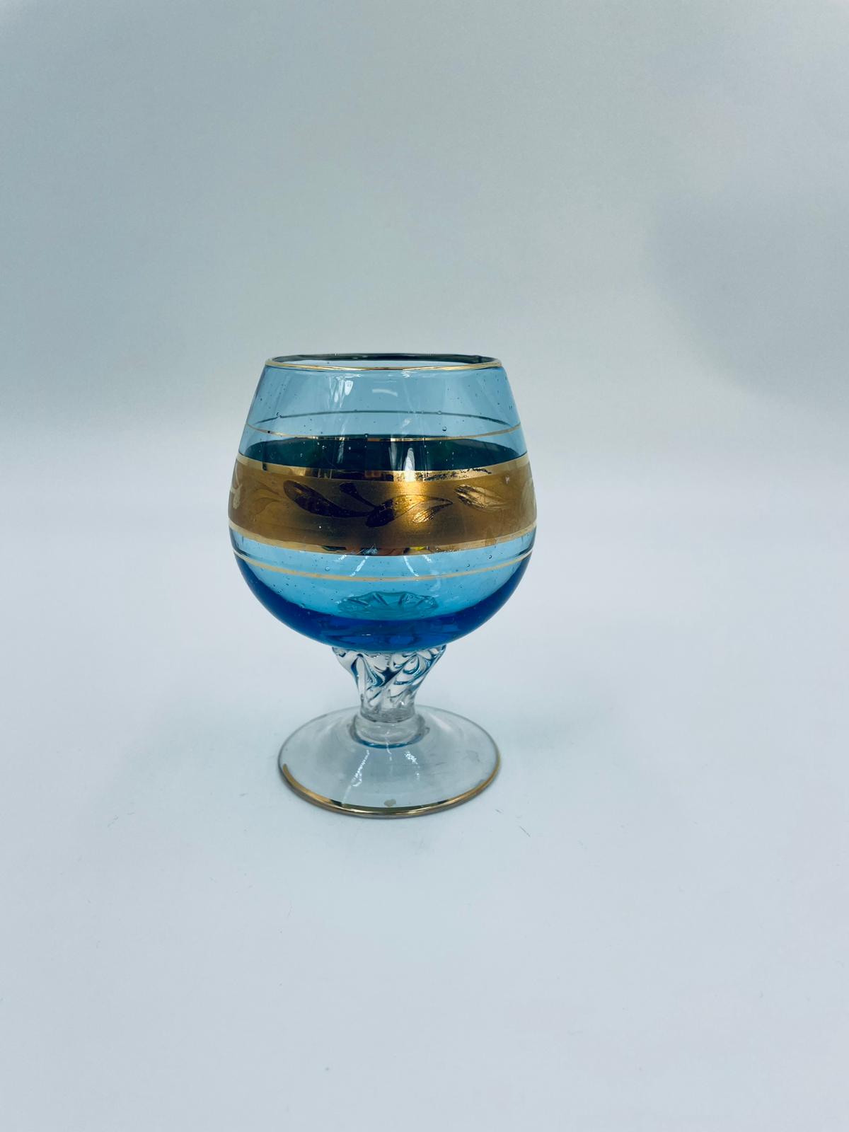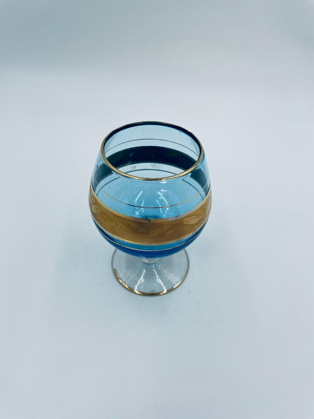Vintage style brandy, cognac glass , made of high quality crystal glass. The glass is characterised by a blue-coloured spigot, decorated with a gold band with a pattern, a short spiral leg and a stable base finished with gilding. It features rubbing on the gilding.