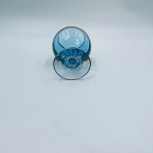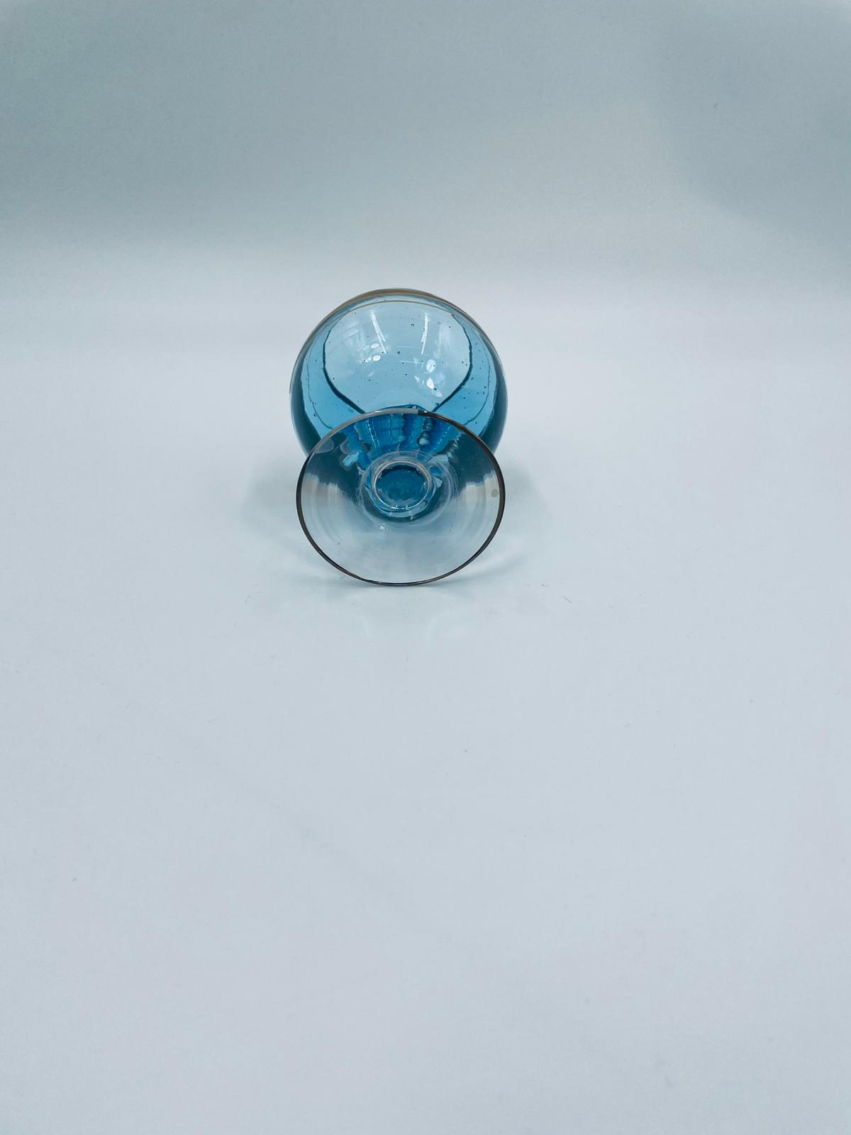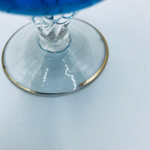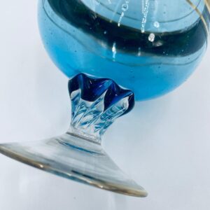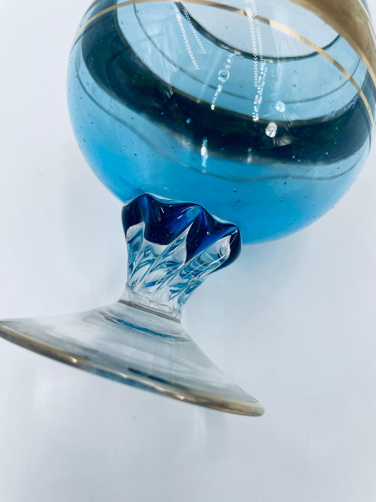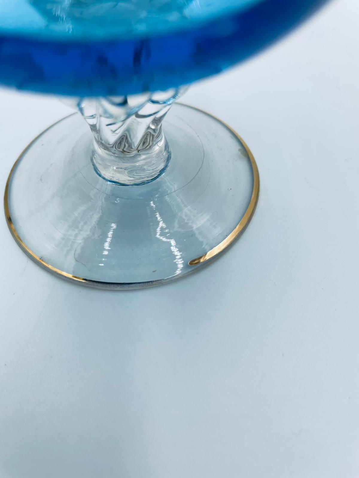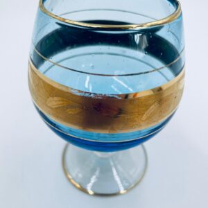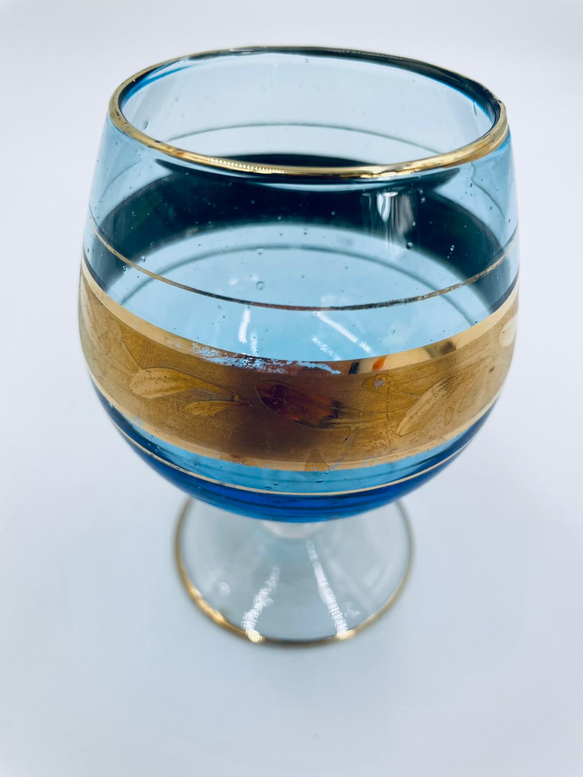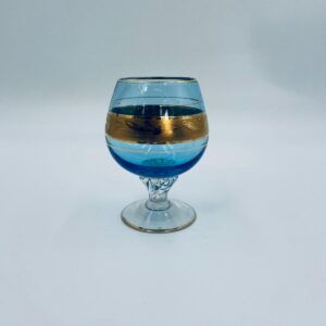 Vintage style brandy, cognac glass , made of high quality crystal glass. The glass is characterised by a blue-coloured spigot, decorated with a gold band with a pattern, a short spiral leg and a stable base finished with gilding. It features rubbing on the gilding.