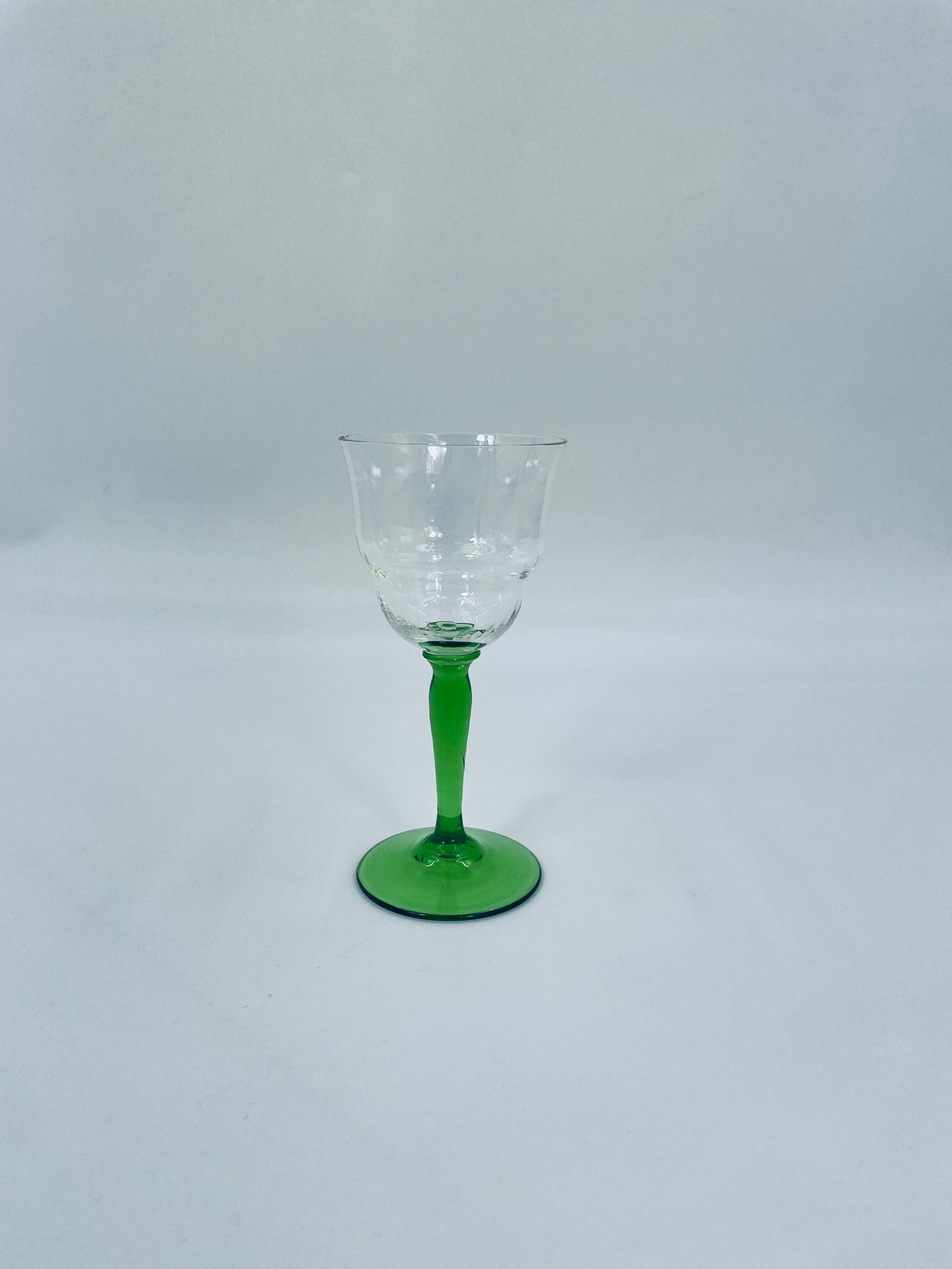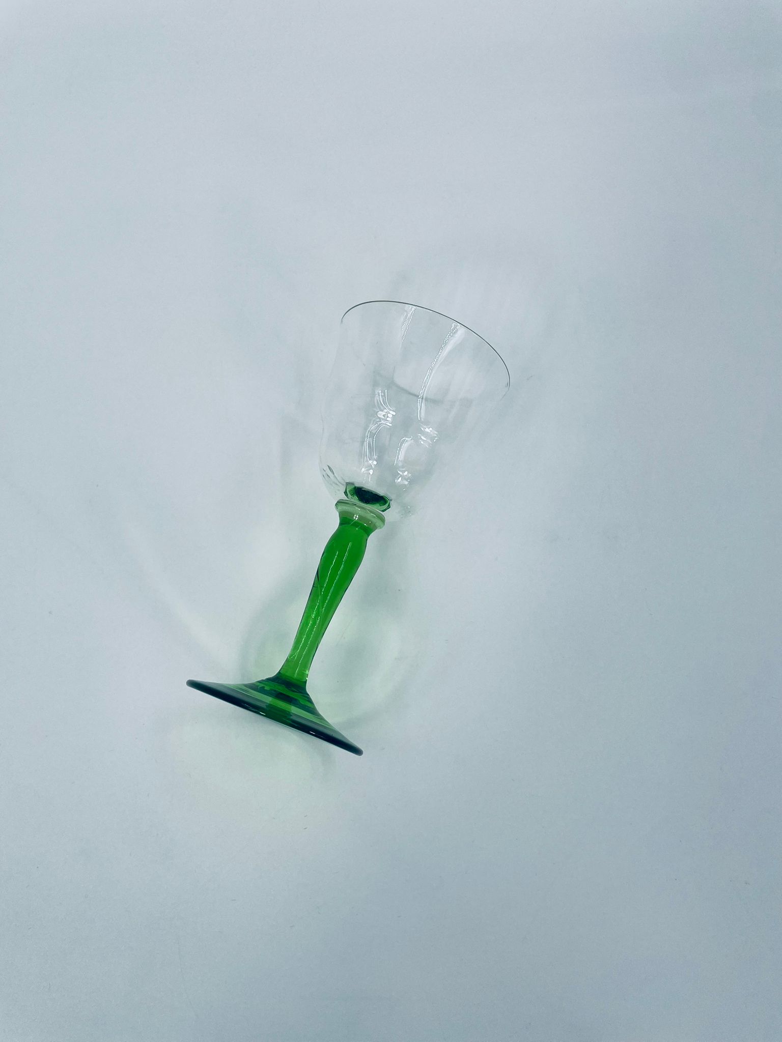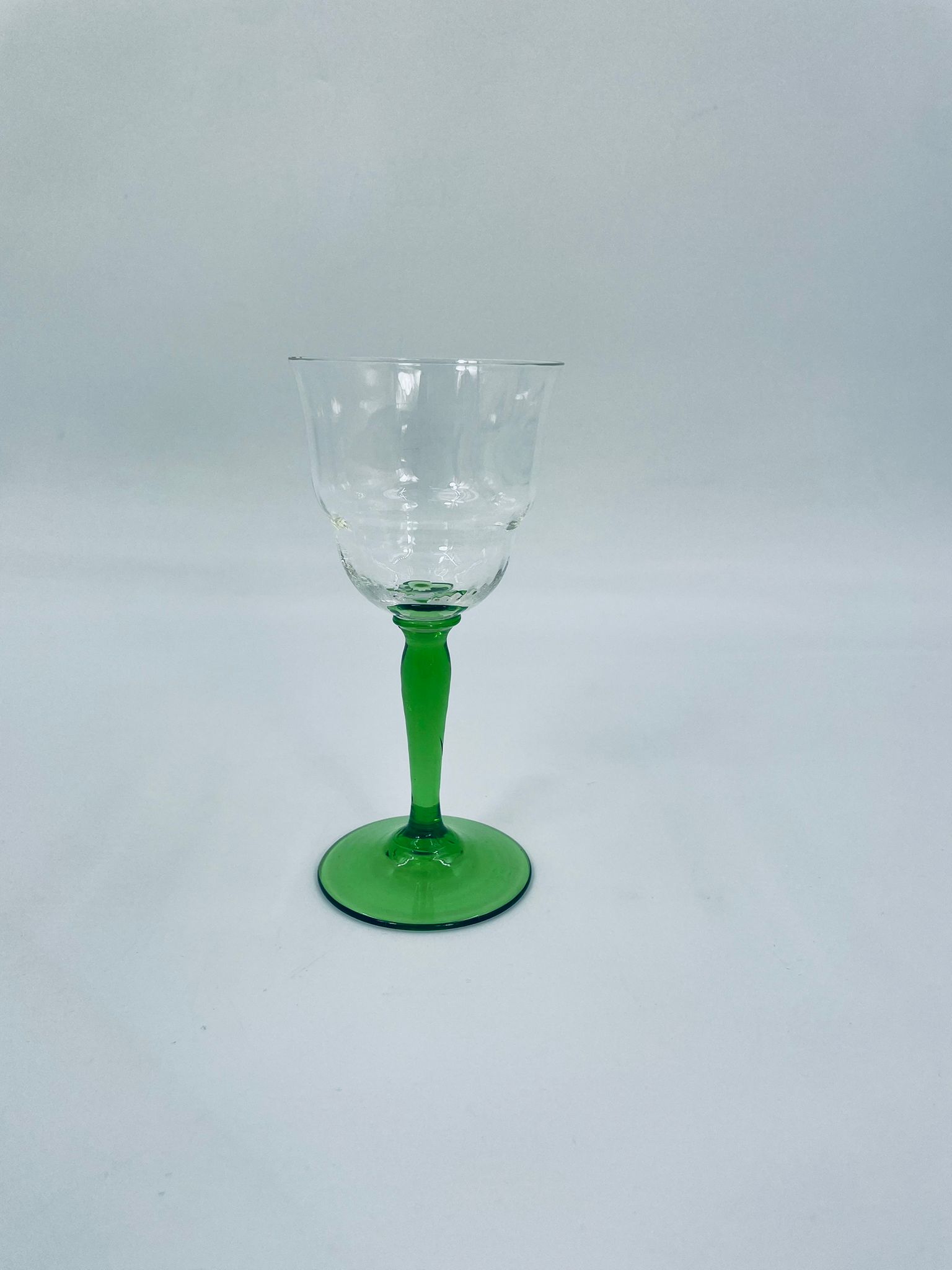 Vintage style liqueur/wine glass, made of high quality crystal glass. The glass is characterised by its translucent black and the green leg and base. It has a small loss on the top rim.