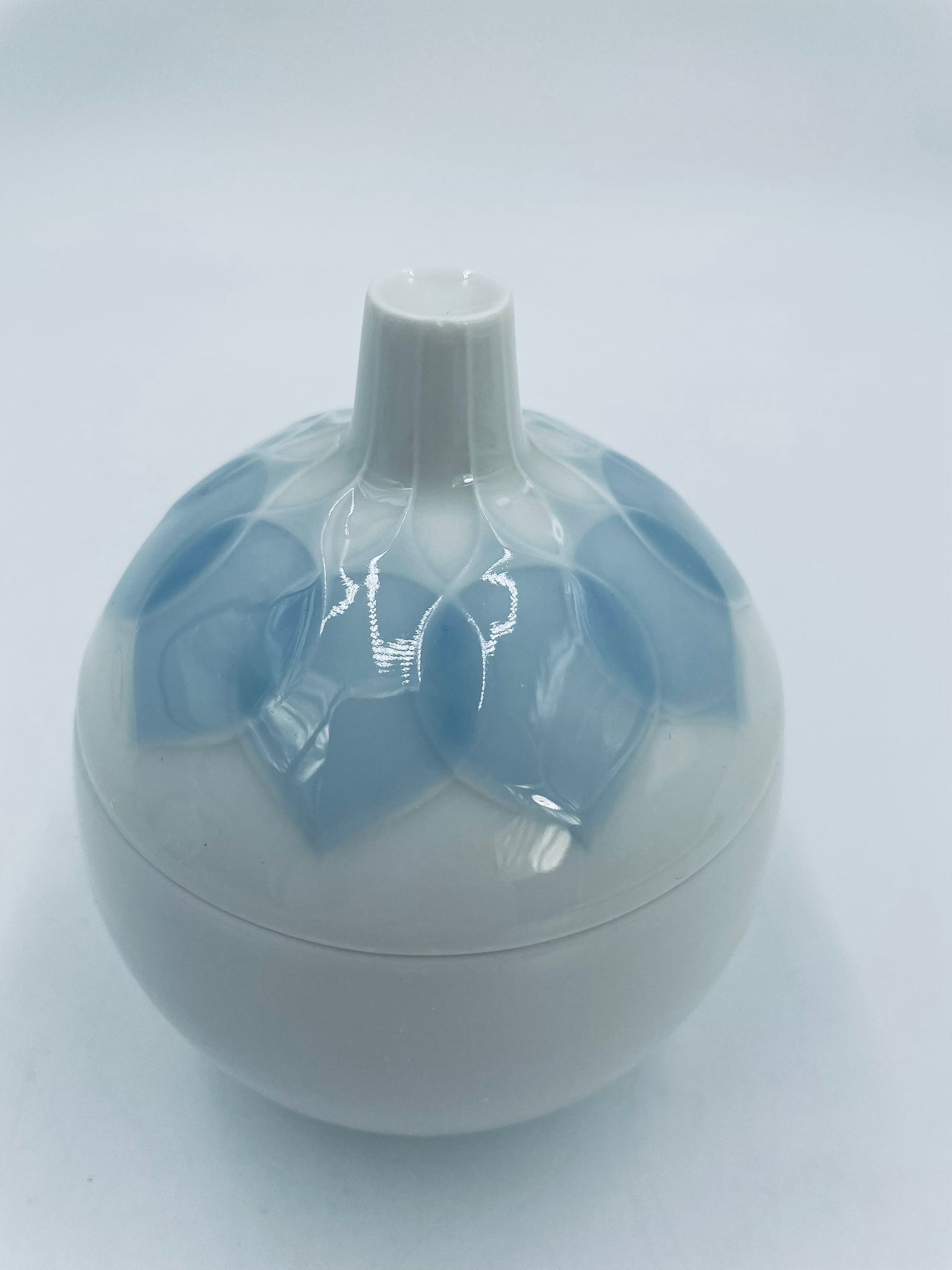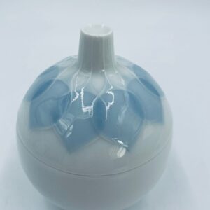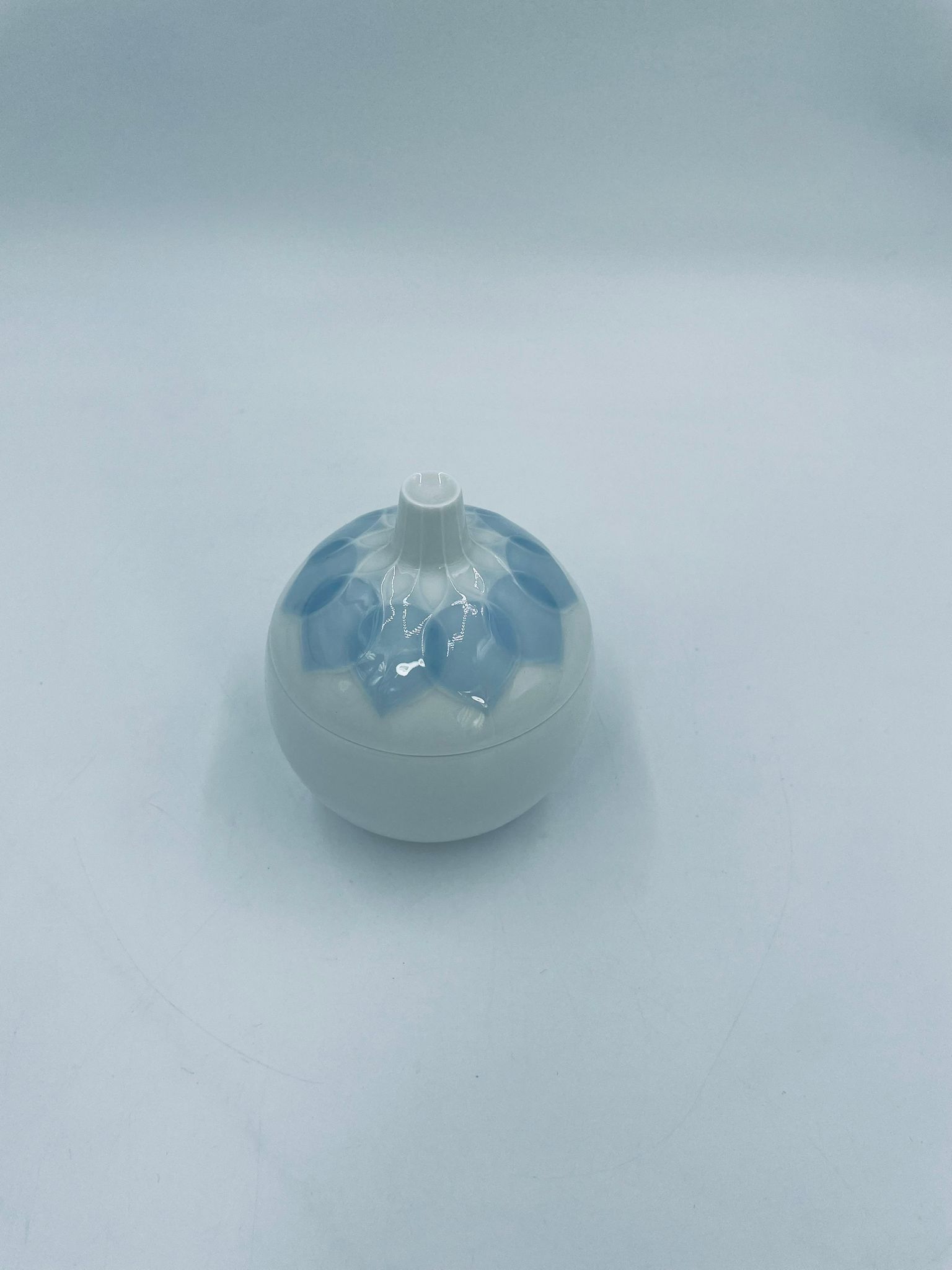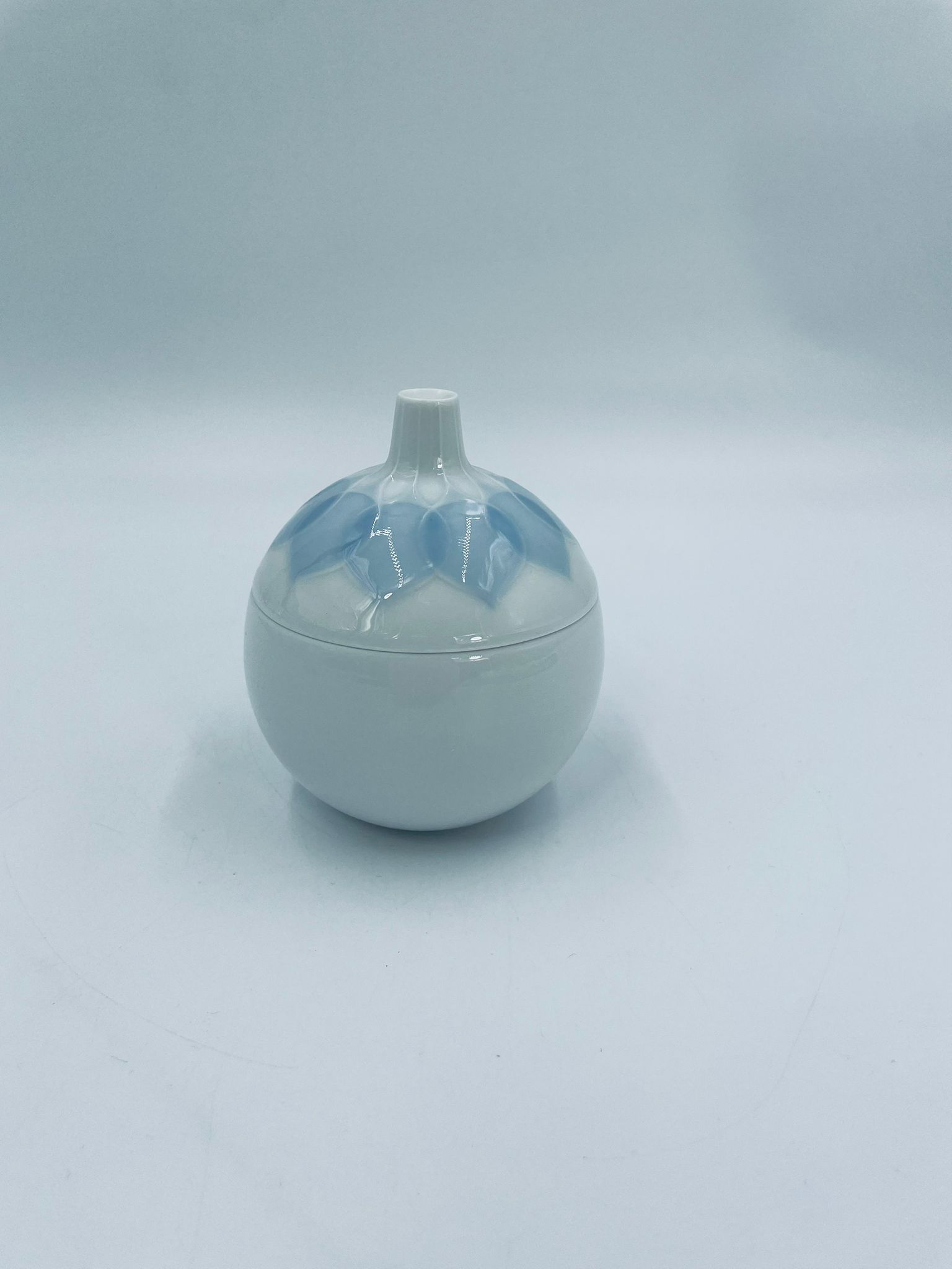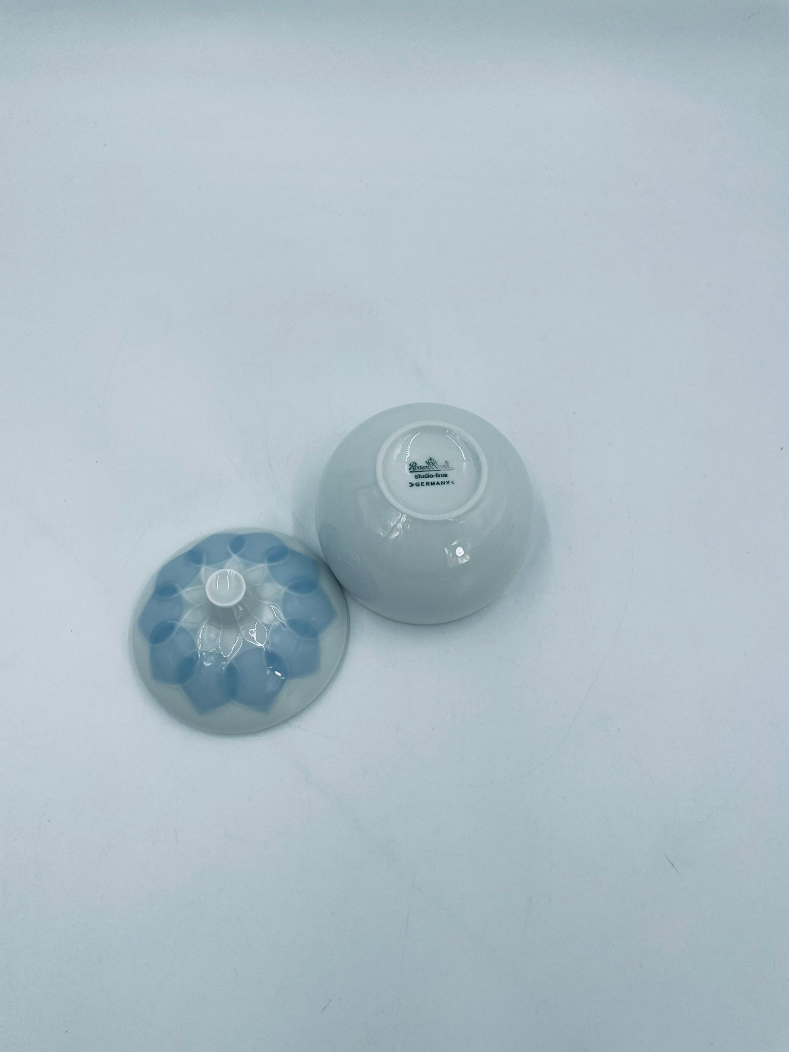 Cukiernica renomowanej wytwórni Rosenthal Studio Line z serii Lotus Blau , zaprojektowana przez duńskiego artystę Bjorna Wiinblada w 1964r, wykonana z najwyższej jakości białej porcelany. Cukiernica o kulistym kształcie z pokrywą ozdobioną wzorem „Blau” z delikatnym, geometrycznym motywem przypominający liście lotosu w niebieskim odcieniu oraz z ozdobnym uchwytem.
